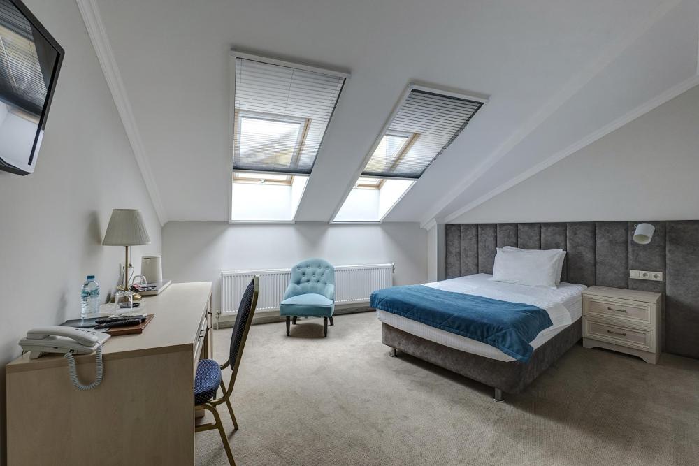 Одноместный стандартный номер, расположенный на мансардном 4 этаже. В номере есть все необходимое для комфортного проживания гостей: телевизор, кондиционер, телефон, сейф, тапочки, махровые полотенца и халаты, косметические принадлежности и т.д. Ширина кровати 1,2*2м.