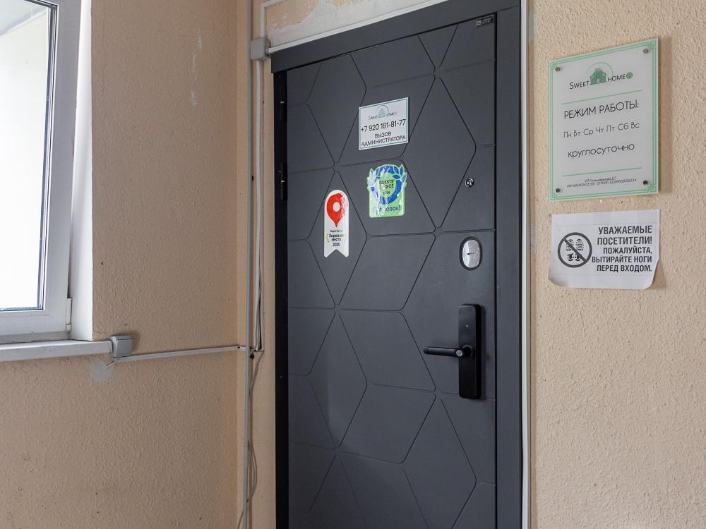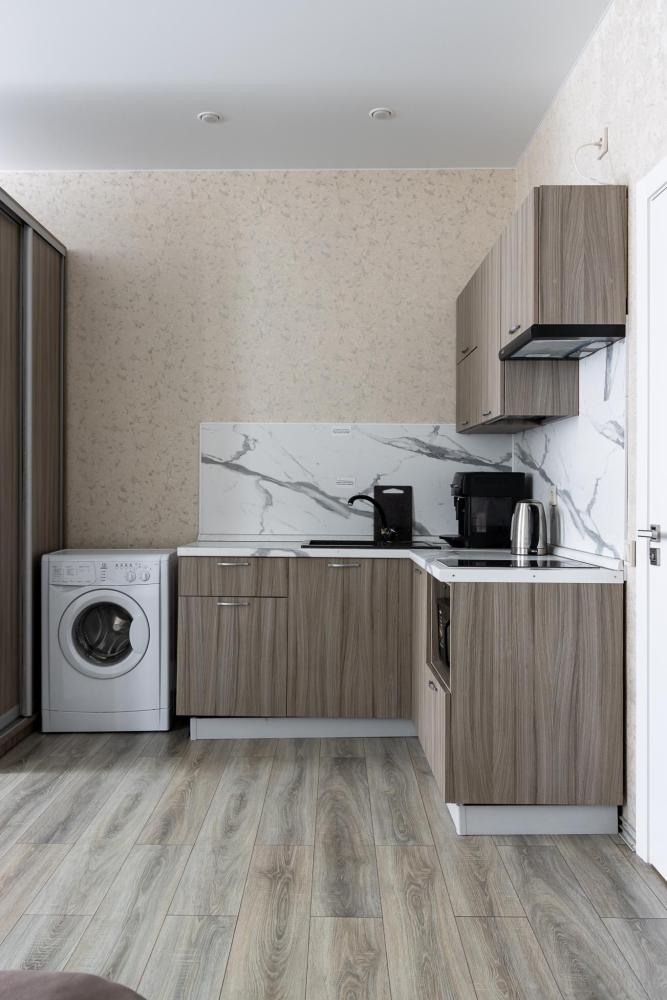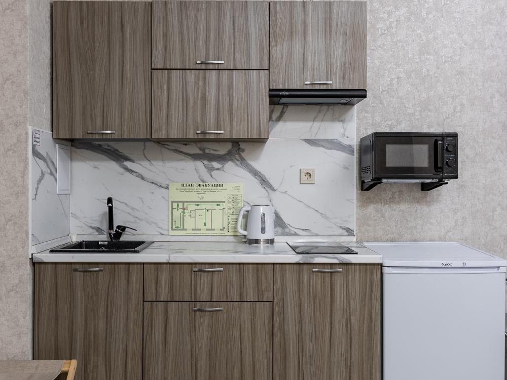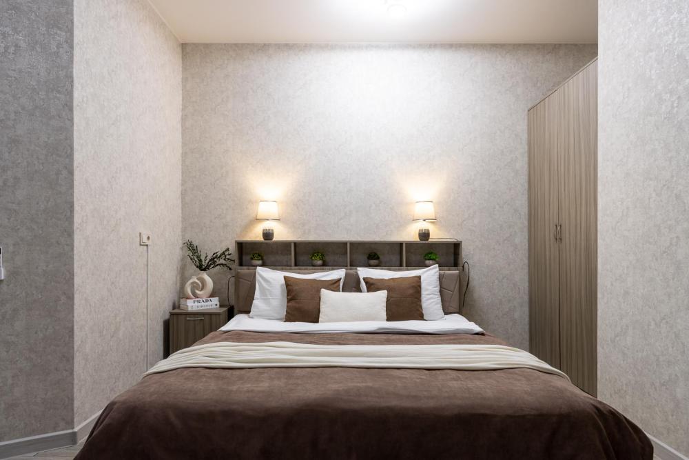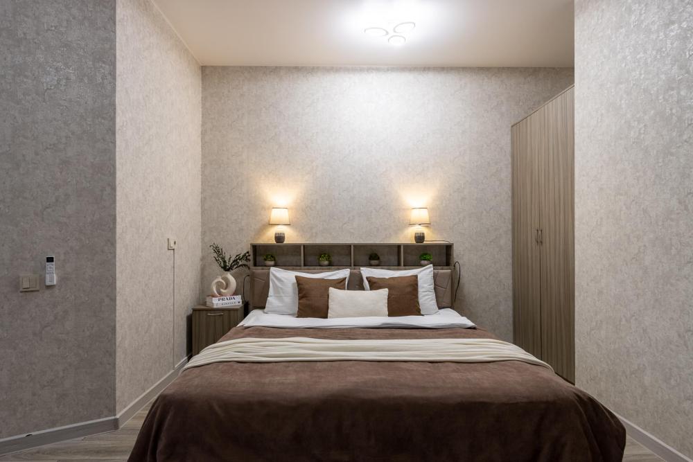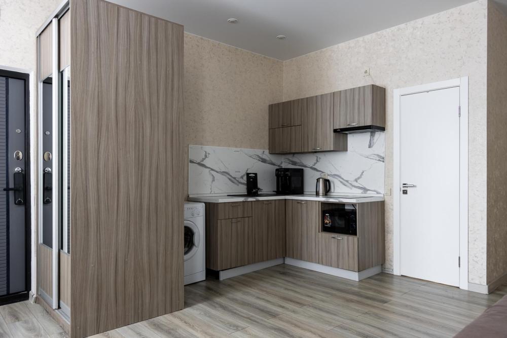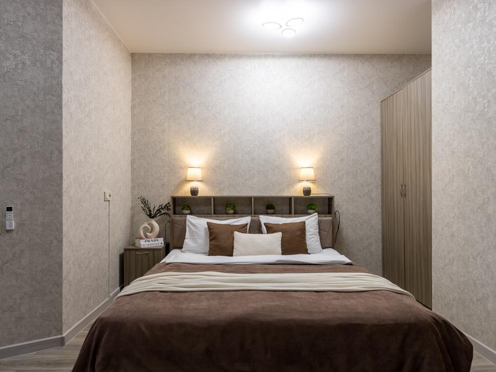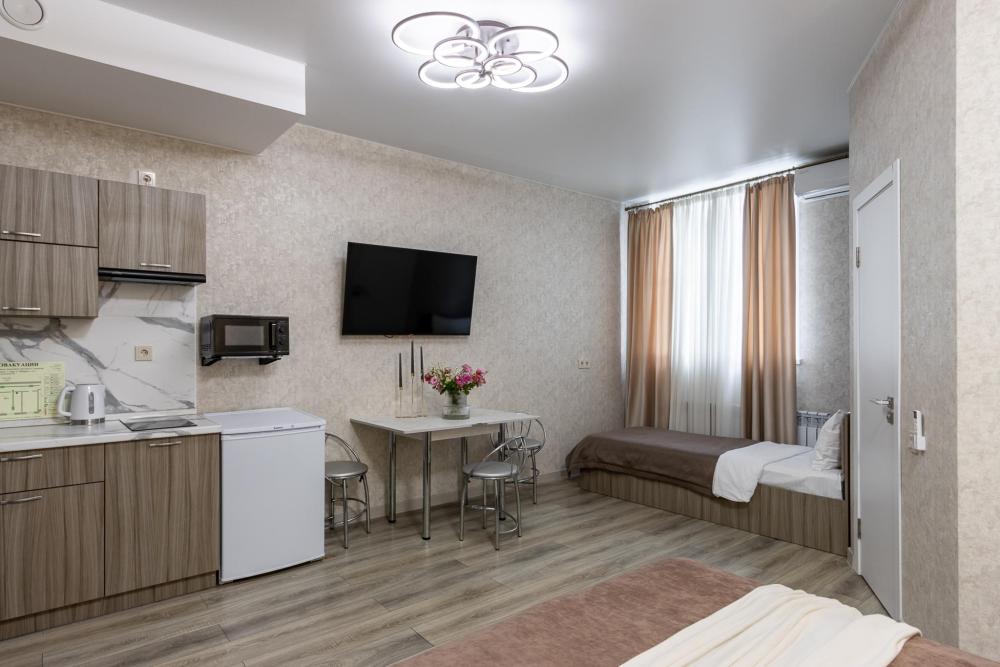 В большом однокомнатном номере есть две кровати - двуспальная и односпальная, ванная комната, диван, телевизор, холодильник, полноценная кухня и кондиционер.