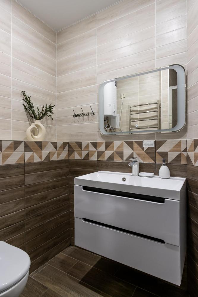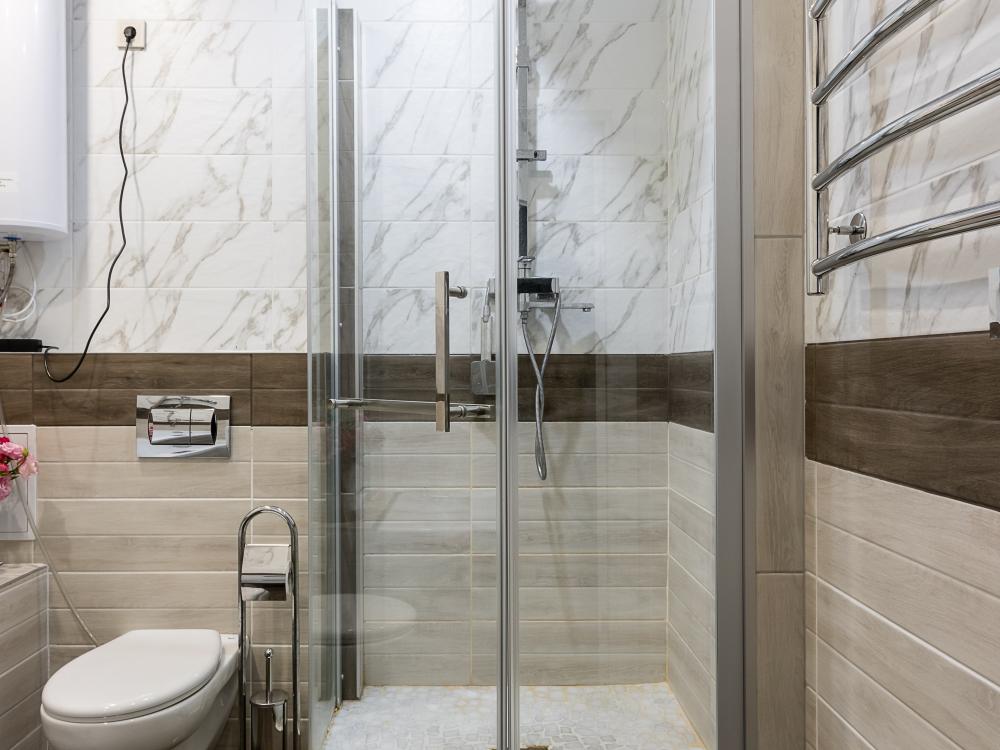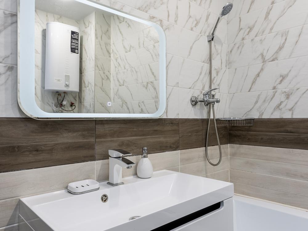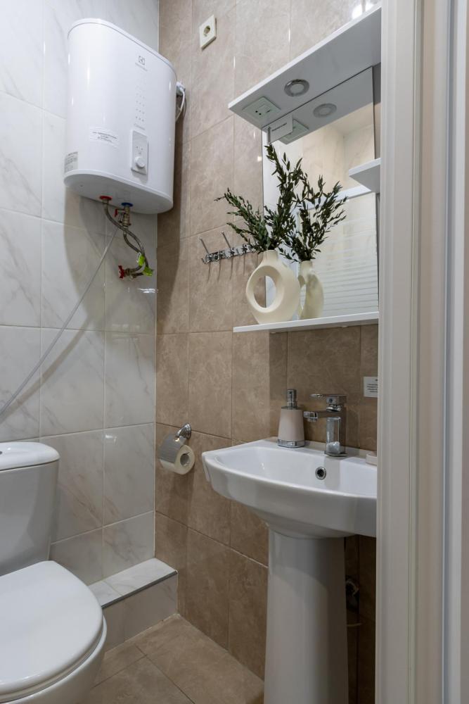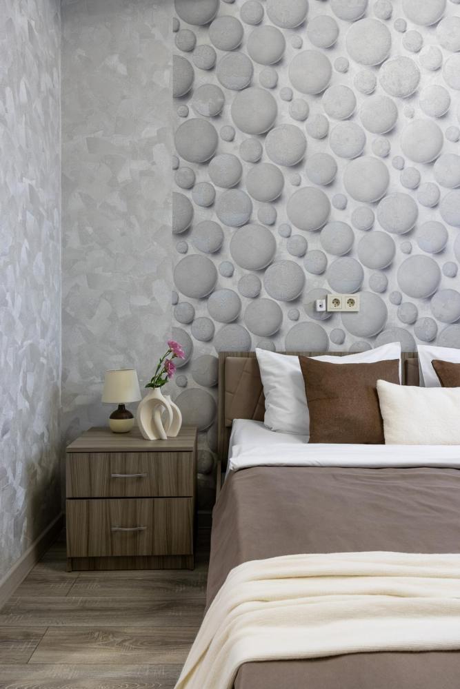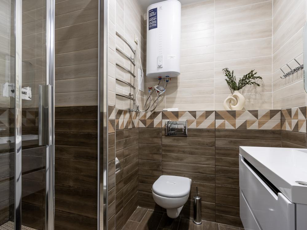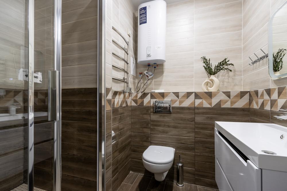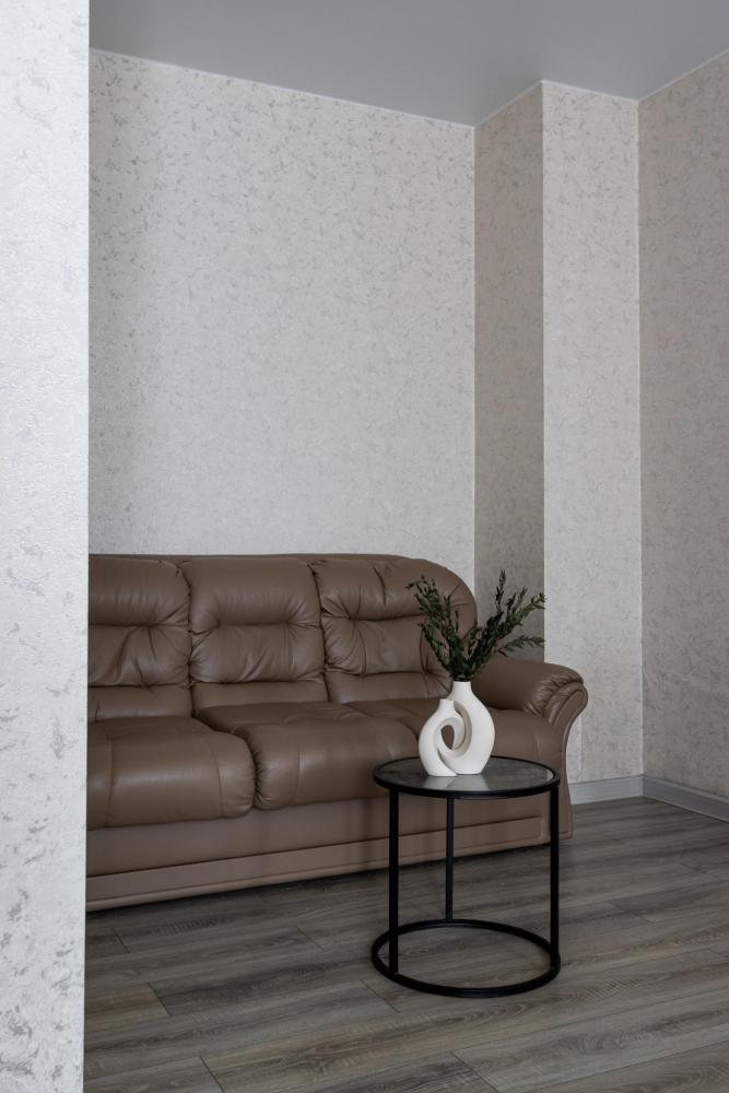 В большом однокомнатном номере есть две кровати - двуспальная и односпальная, ванная комната, диван, телевизор, холодильник, полноценная кухня и кондиционер.
