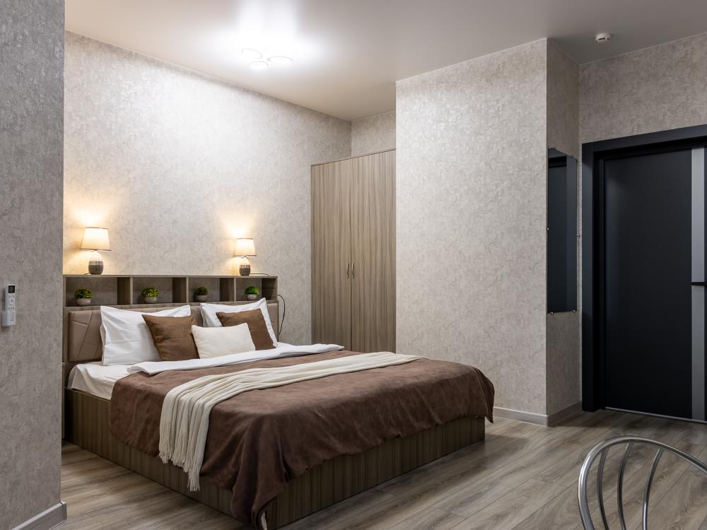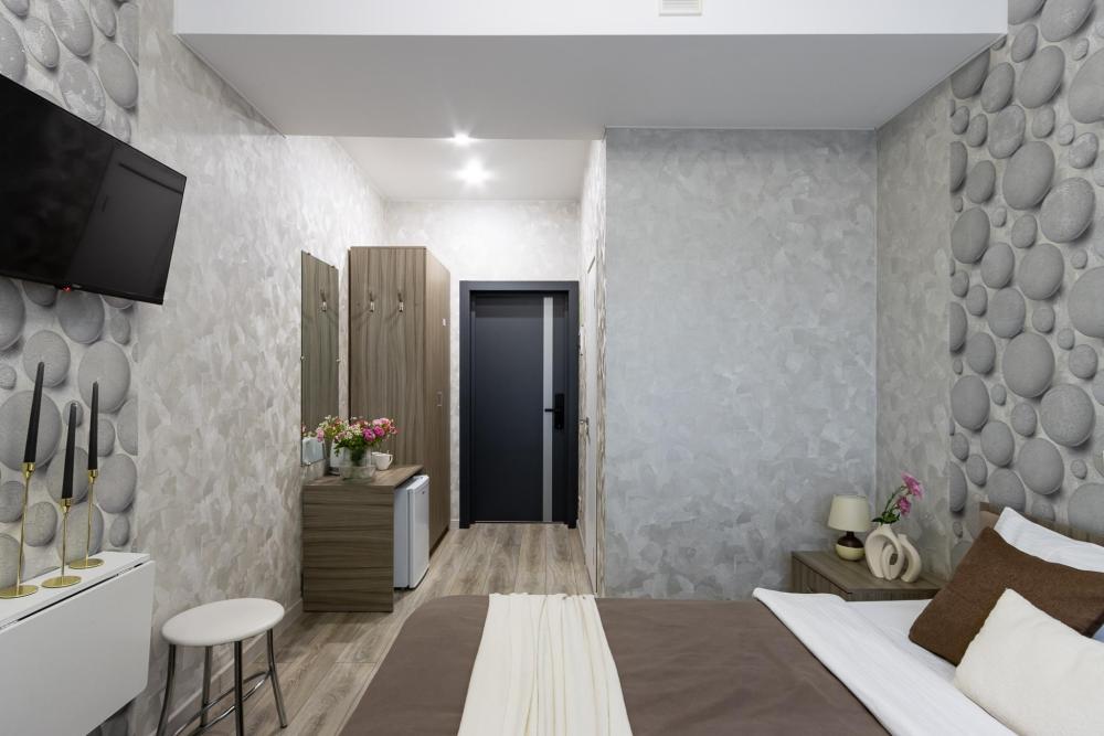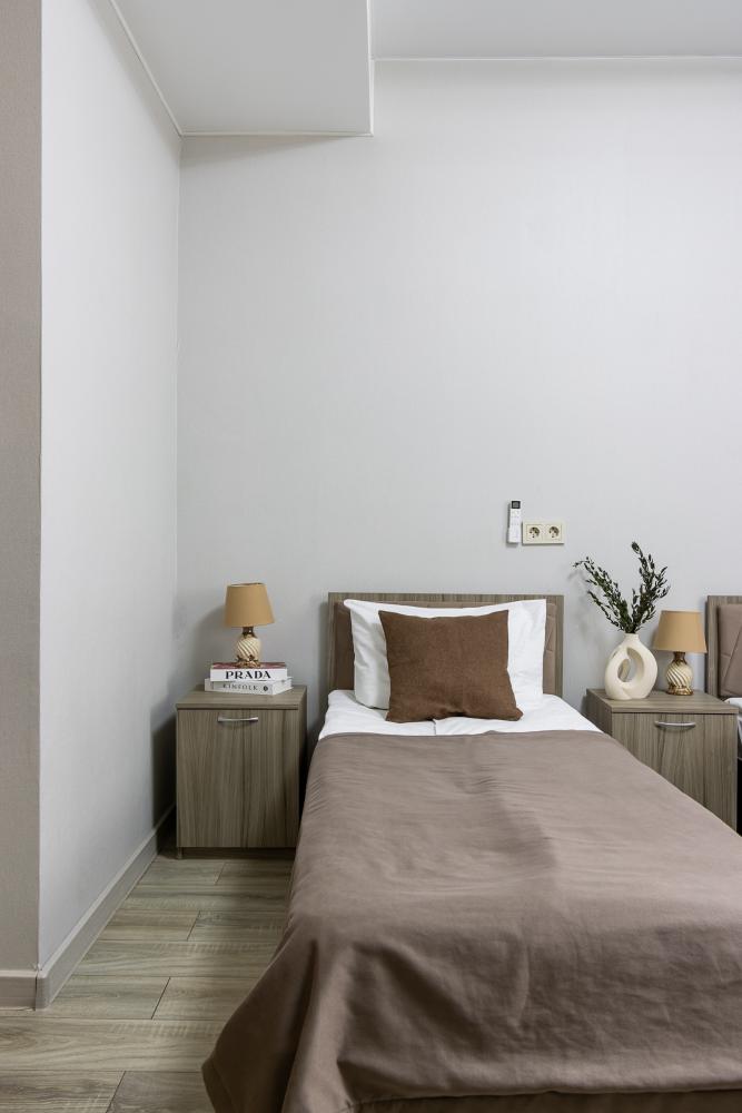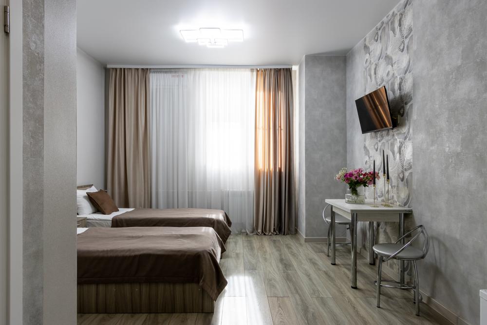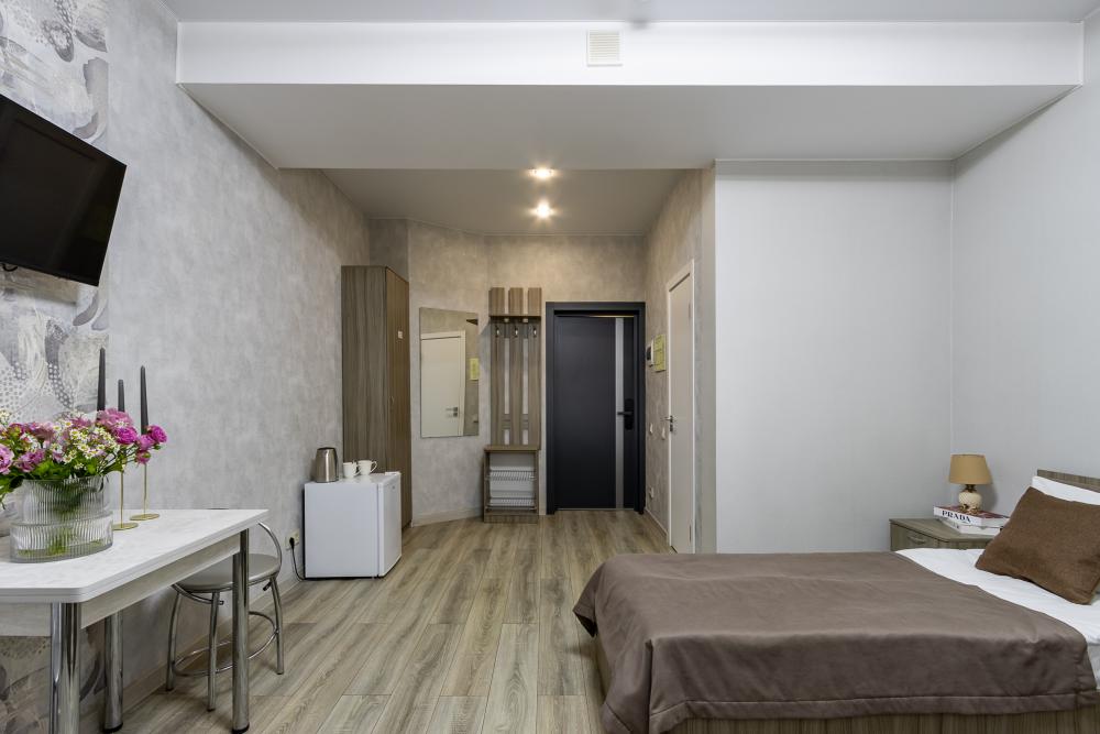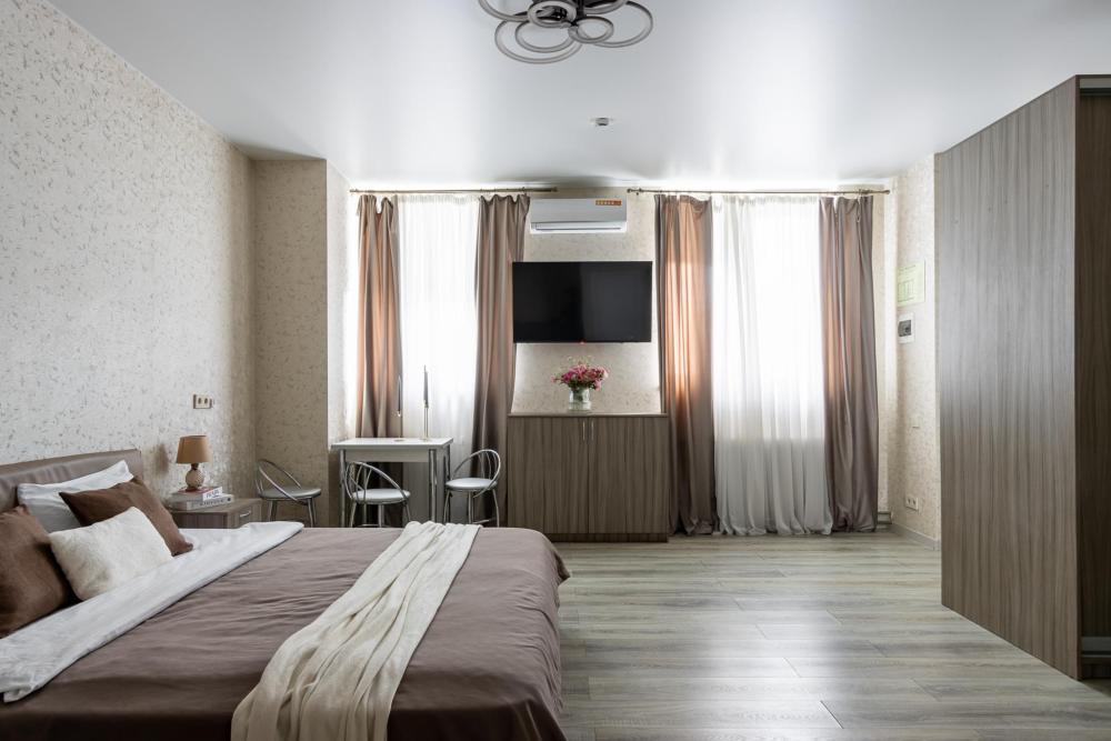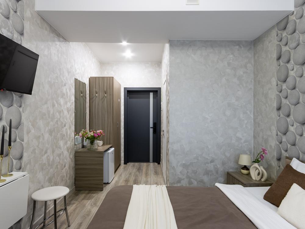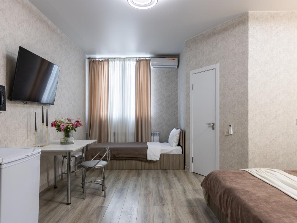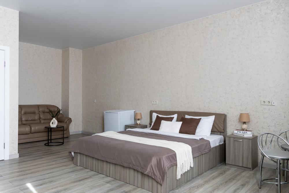 Просторные однокомнатные номера улучшенного типа. В каждом номере одна двуспальная кровать, телевизор, холодильник, кондиционер и ванная комната.