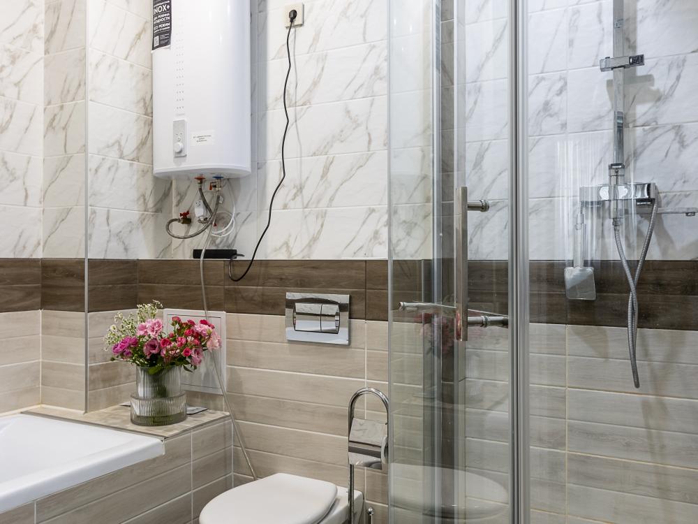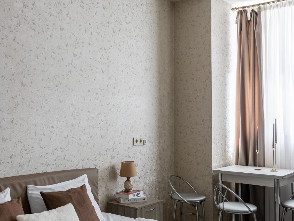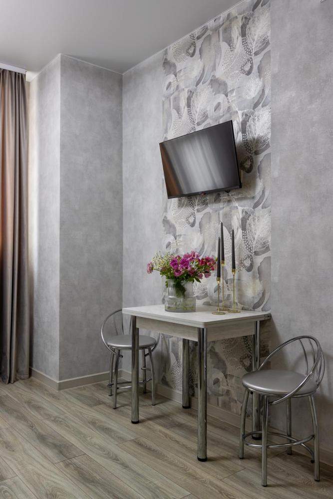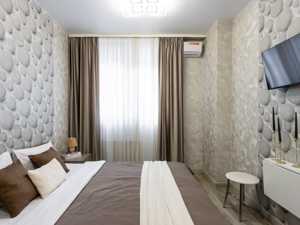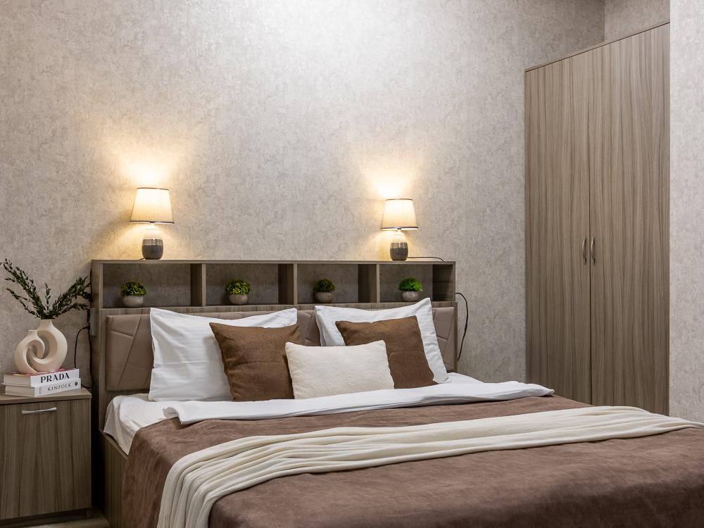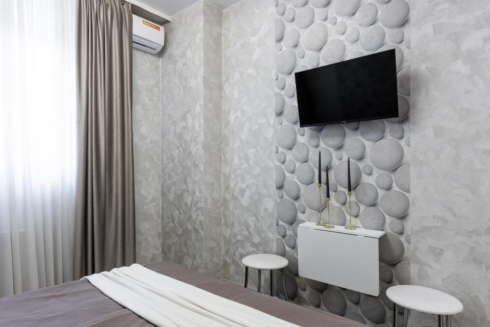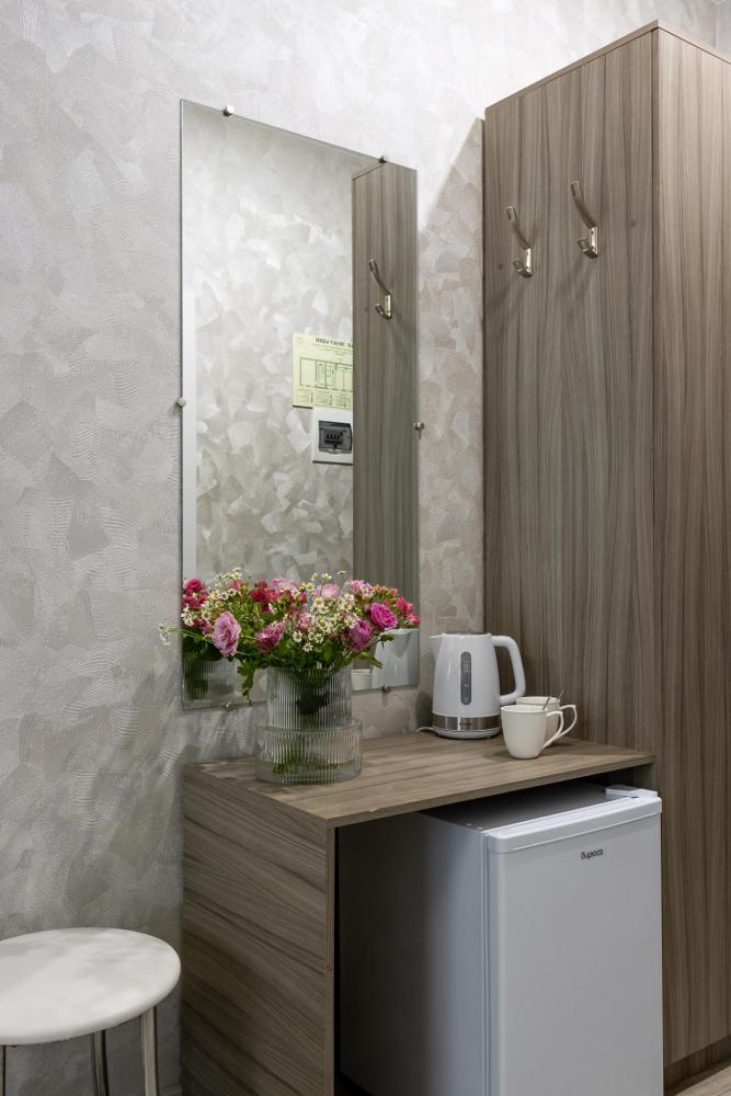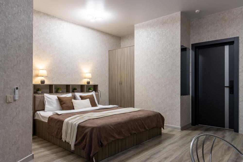 Просторные однокомнатные номера улучшенного типа. В каждом номере одна двуспальная кровать, телевизор, холодильник, кондиционер и ванная комната.