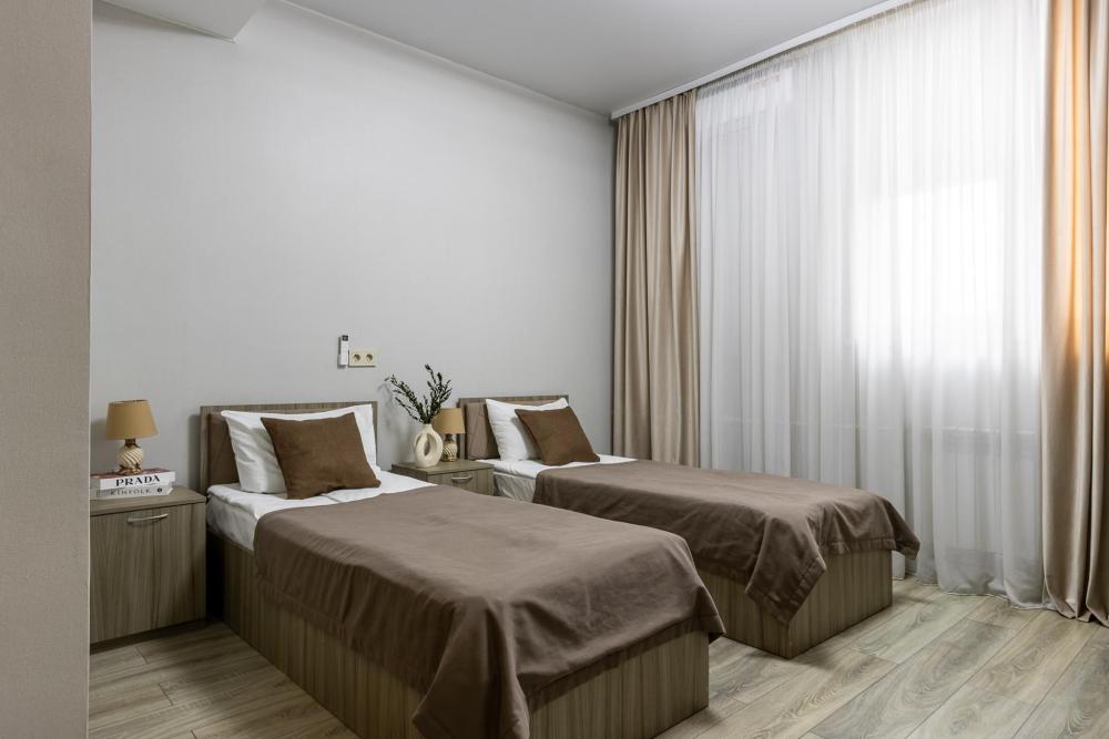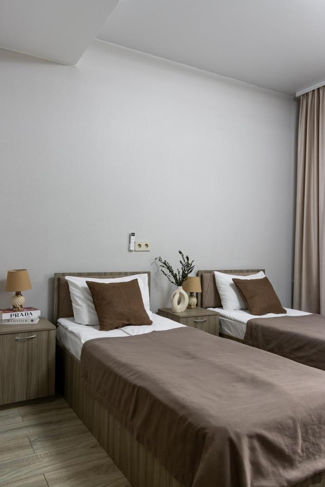 Однокомнатные номера. В номере одна двуспальная или две односпальные кровати, холодильник, телевизор, кондиционер, журнальный столик и ванная комната.