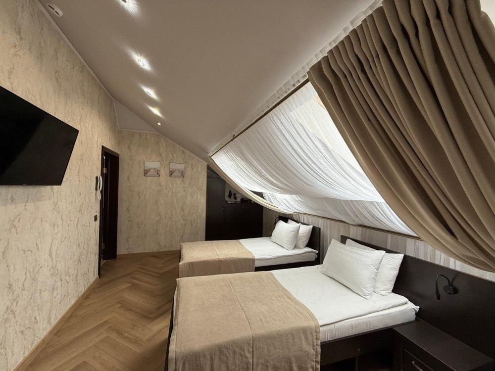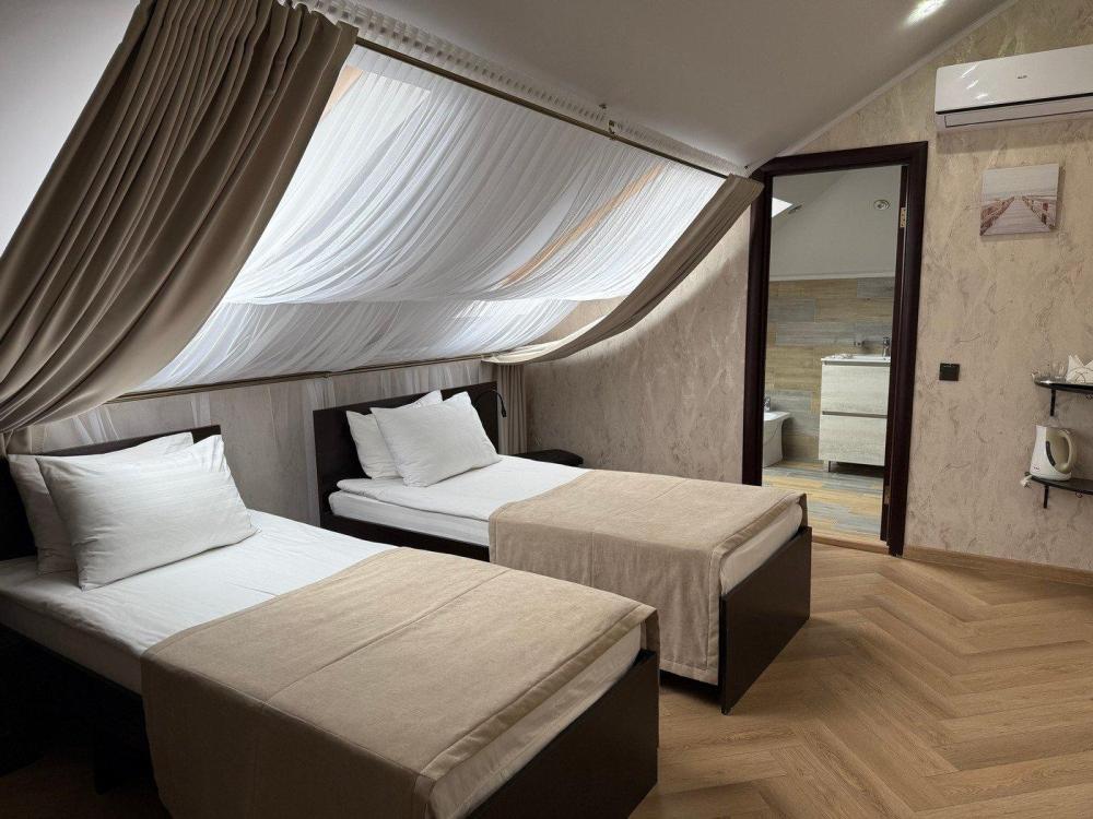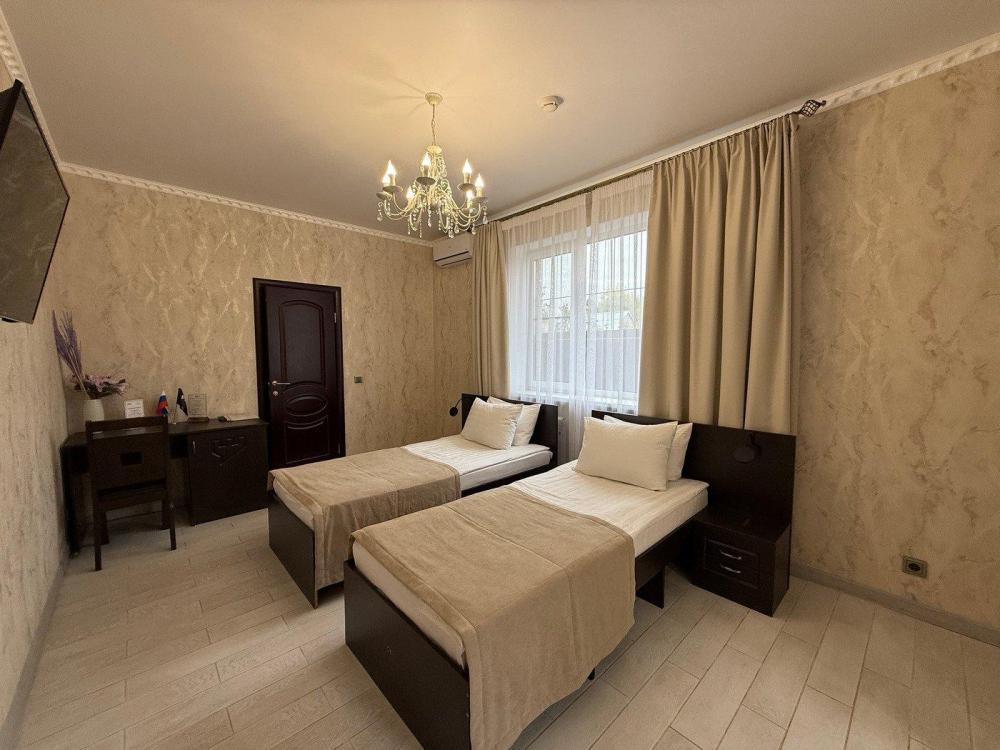 Номера с двумя кроватями сочетают в себе современный стиль и комфорт. Оснащение номера : телевизор, холодильник, чайник, микроволновая печь на общей кухне, фен, Wi-fi, кондиционер, письменный стол, стул, тапочки, 2 тумбочки.