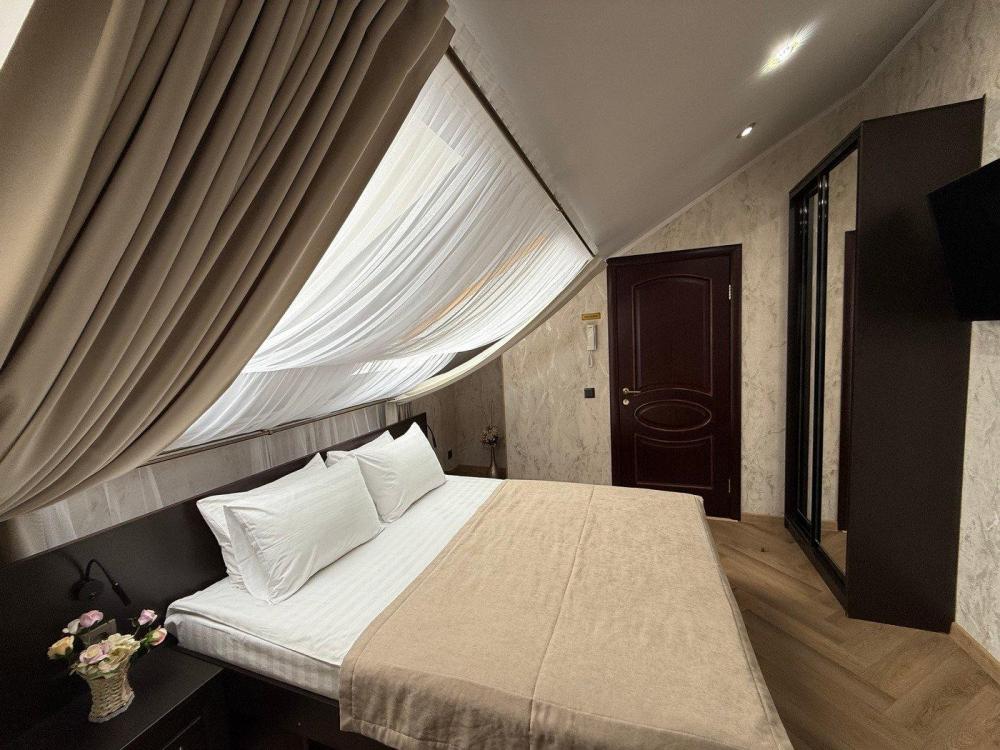 Номера с большой удобной кроватью (ширина 180 см.) сочетают в себе современный стиль и комфорт. Оснащение номера: холодильник, чайник, wi-fi, телевизор, фен, кондиционер, письменный стол, стул, тапочки, 2 тумбочки, микроволновая печь на общей кухне, набор посуды, дополнительная кровать (раскладушка или раскладное кресло), барная стойка, 2 барных стула.