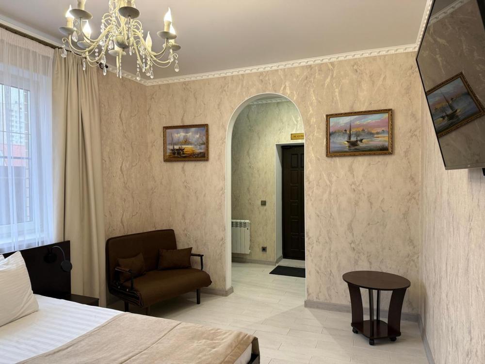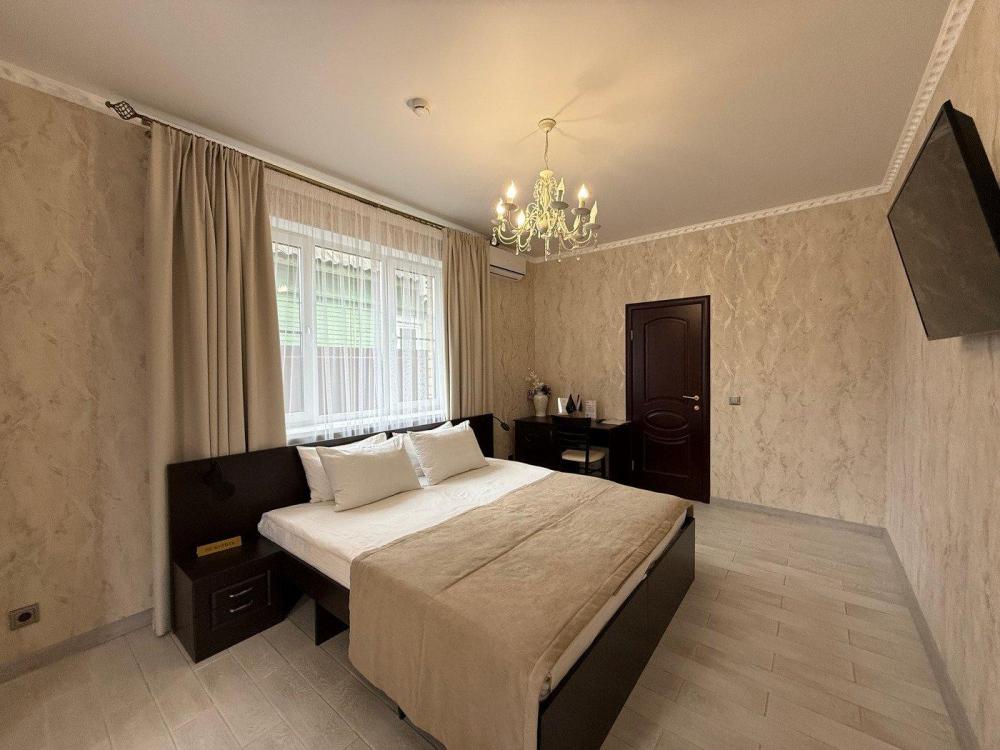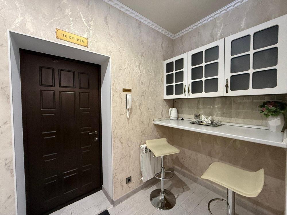 Номер с отдельным входом со двора. Изысканный дизайн интерьера позволяет прочувствовать поистине королевский отдых. Оснащение номера: холодильник, чайник, Wi-fi, телевизор, фен, кондиционер, письменный стол, стул, тапочки, 2 тумбочки, микроволновая печь на общей кухне, набор посуды, дополнительная кровать (раскладушка), барная стойка, барные стулья, уголок для приема пищи (кухня).