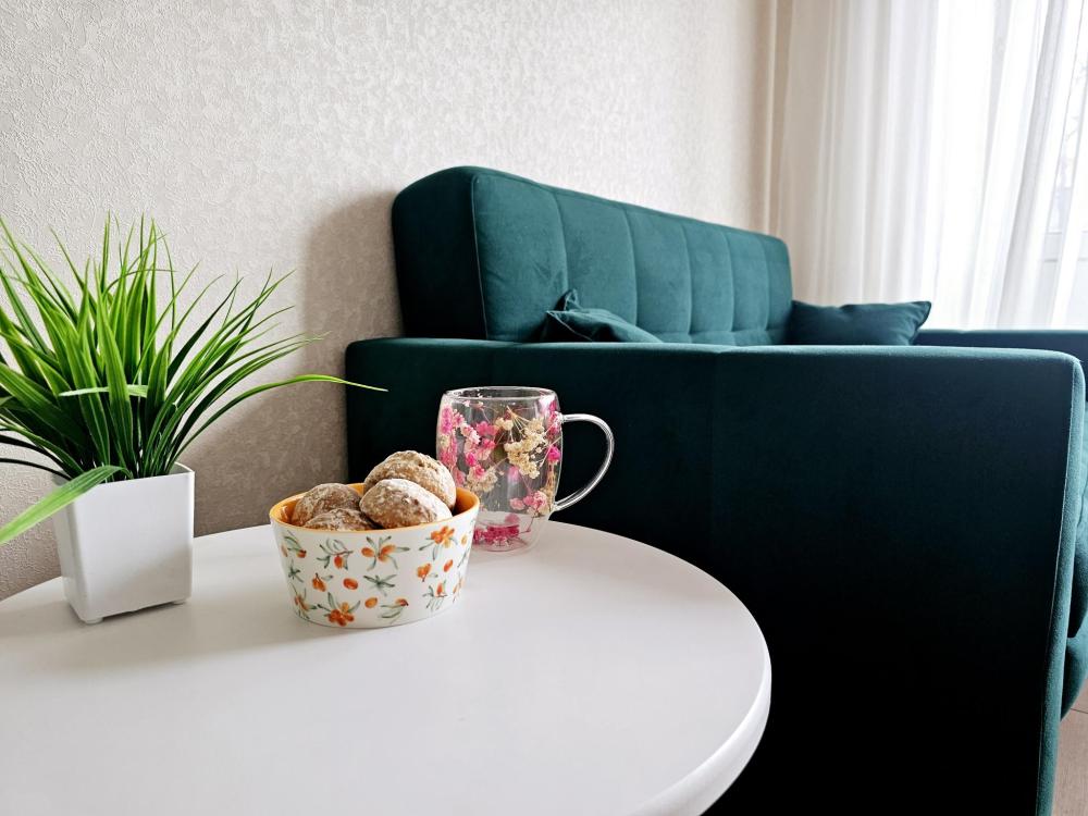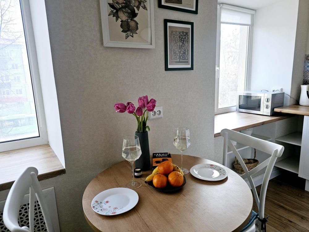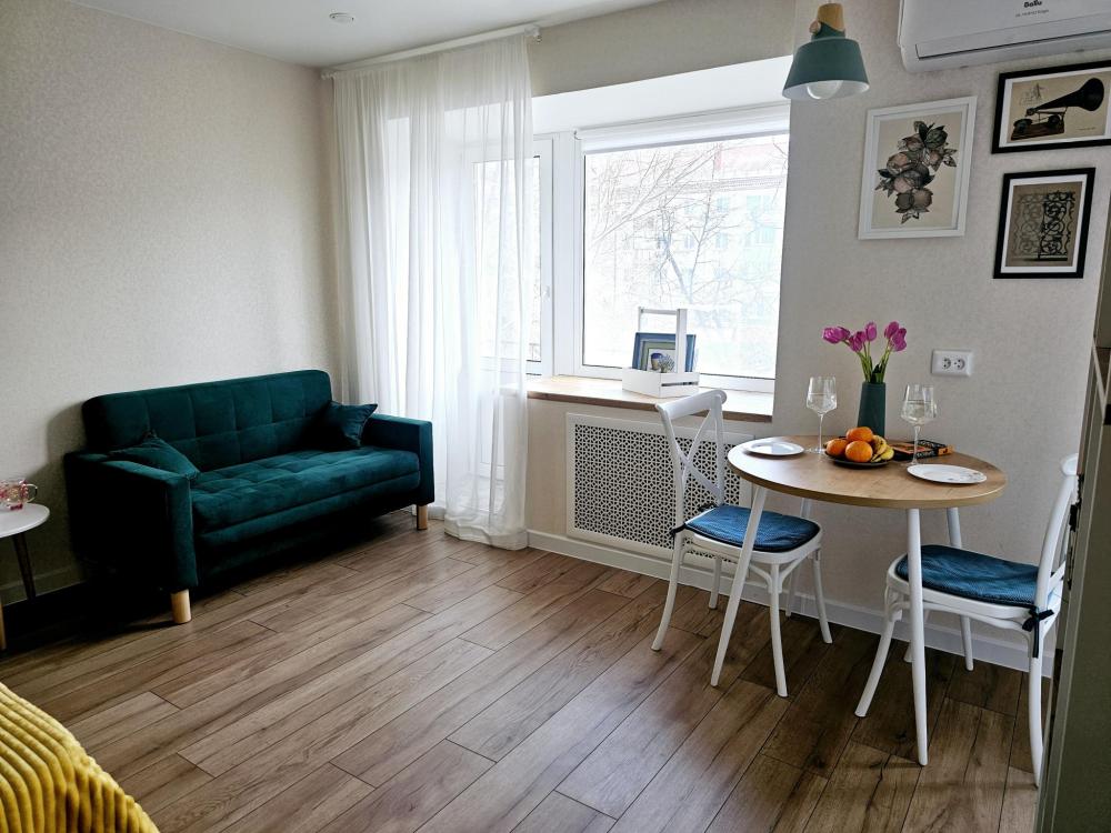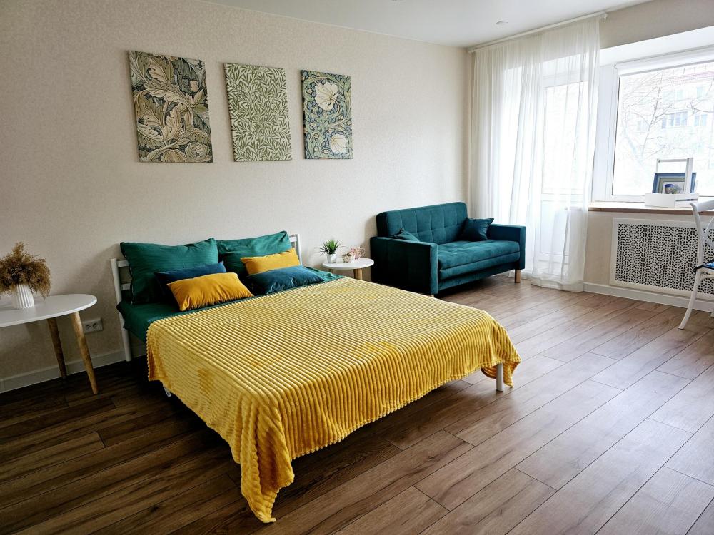 Уютная студия, вид из которой выходит на улицу Мельникайте, в самом центре города. Квартира оснащена необходимым для проживания: диван двуспальный, постельное белье и комплект полотенец, средства личной гигиены, стиральная машина, холодильник, СВЧ-печь, чайник, телевизор, плита, утюг, гладильная доска, напольная сушилка, необходимая посуда, Wi-fi и телевидение.