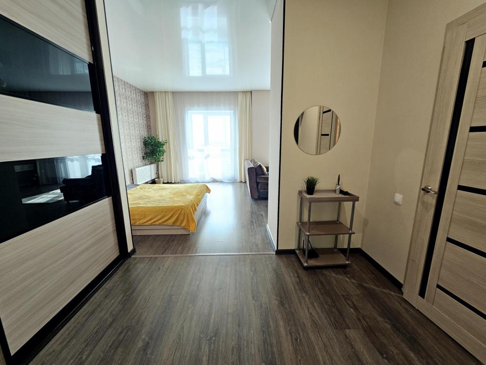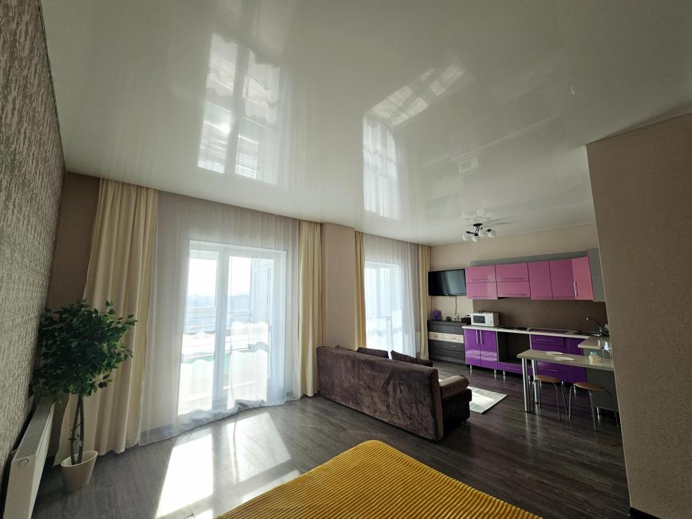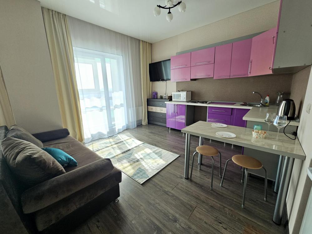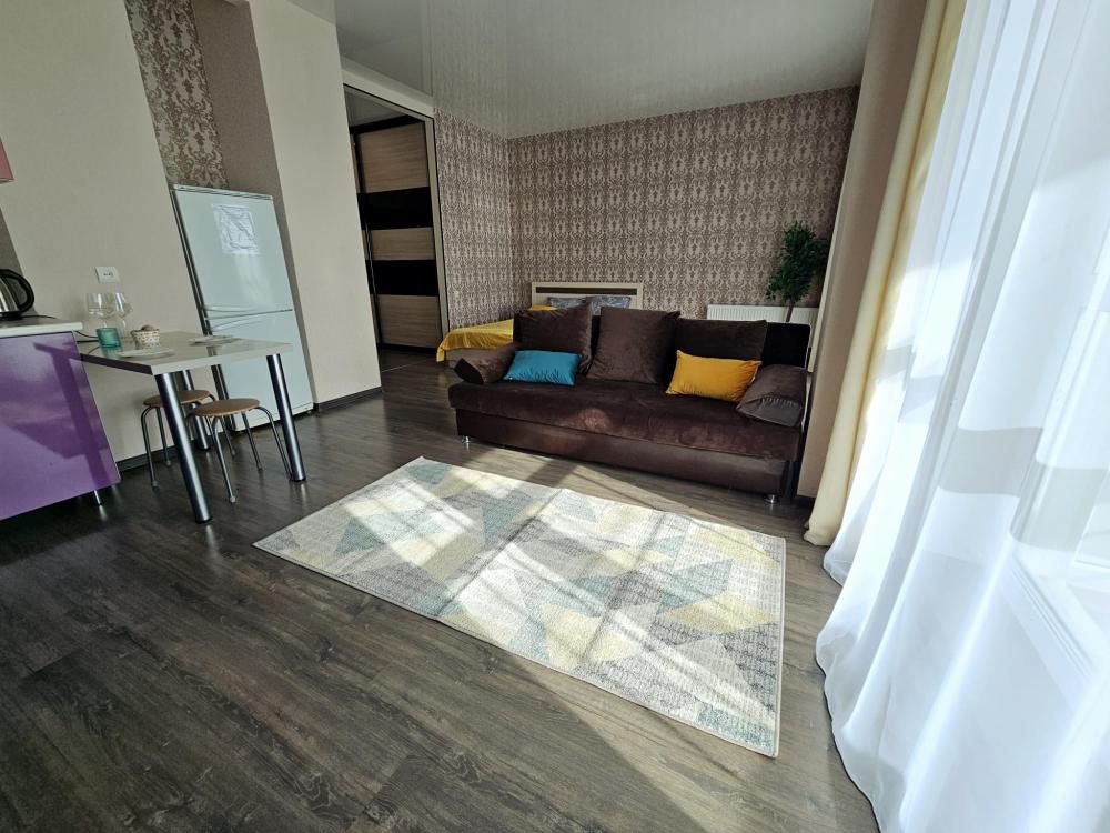 Уютная квартира-студия с 2 большими балконами и прекрасным видом из окна в самом центре города. Квартира оснащена необходимым для проживания: кровать двуспальная, диван (дополнительное спальное место, комплект оплачивается дополнительно), постельное белье и комплект полотенец, средства личной гигиены, стиральная машина, холодильник, СВЧ-печь, чайник, телевизор, плита, утюг, фен, гладильная доска, напольная сушилка, необходимая посуда, Wi-fi и телевидение, приветственная бутылочка воды, чай, кофе.