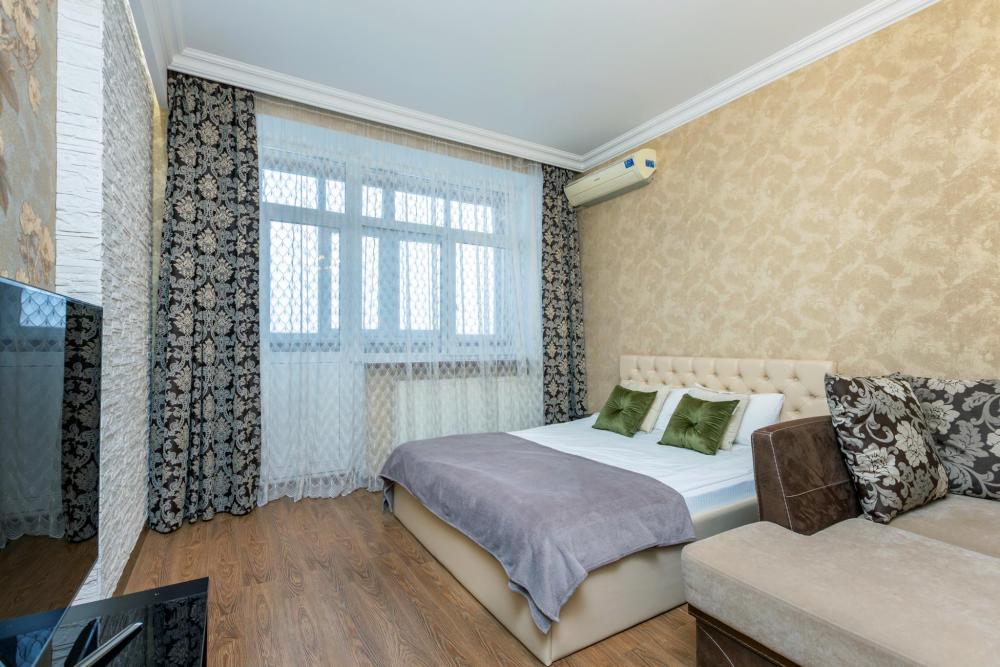 Квартира на 5 этаже 25 жилого дома. Выполнен авторский ремонт. В комнате большая двуспальная кровать, туалетный столик с зеркалом, большой плазменный ТВ с кабельными каналами. Есть большая гардеробная. В кухне установлен кухонный гарнитур, стол, стулья, немецкая встроенная бытовая техника: электроплита, электрический чайник, микроволновая печь, духовой шкаф. Для приготовления пищи есть вся необходимая посуда. Большой балкон застекленный с зоной для отдыха и с теплым полом. Для наших гостей мы предоставляем полотенца, чай, кофе, гель для душа, шампунь, мыло, туалетную бумагу, освежитель воздуха, средство для мытья посуды и губка для посуды. Так же во всей квартире есть высокоскоростной бесплатный WI-FI.