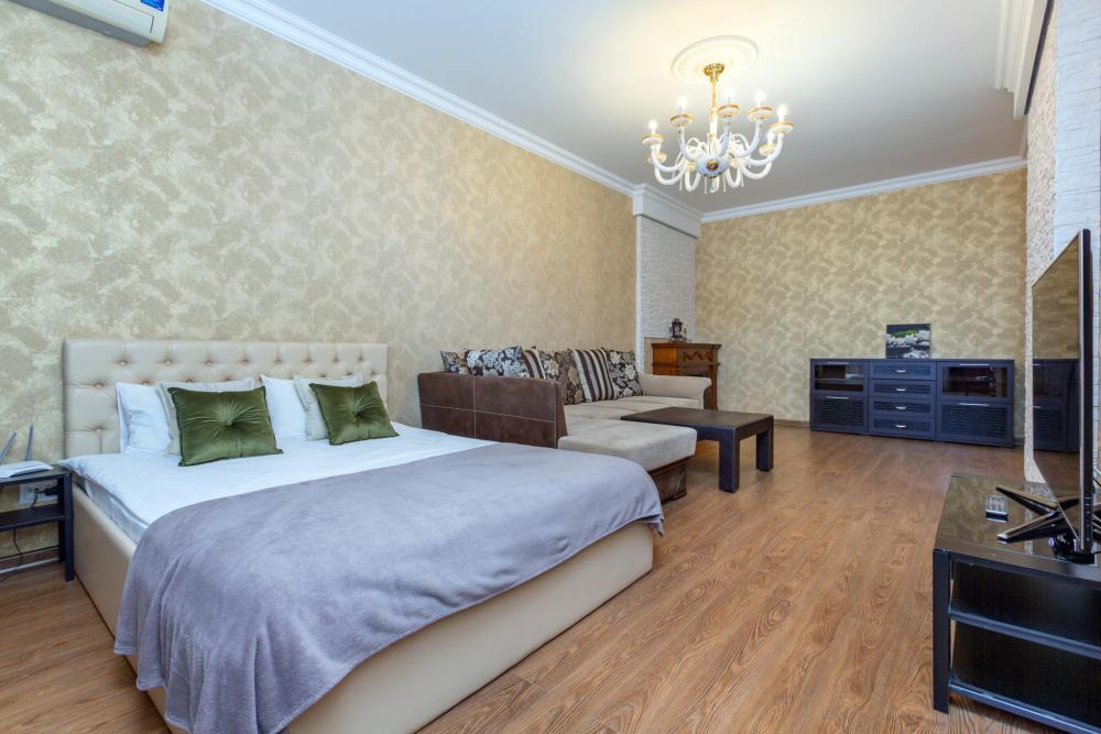 6 спальных мест или 2+2+1+1 (большая двуспальная кровать и двуспальный комфортный раскладной диван, 2 кожаных мини дивана). Квартира с очень качественным совершенно новым ремонтом, люкс материалы. В квартире 2 ТВ с кабельными каналами. В кухне установлен кухонный гарнитур, стол, стулья, встроенная бытовая техника: электроплита, электрический чайник, микроволновая печь, духовой шкаф. Для приготовления пищи есть вся необходимая посуда. Кондиционер. Питьевая вода бутилированная. Большой балкон застекленный, оборудован для кабинета, удобное кожаное кресло, очень красивый вид на город. Бесплатно постельное белье и полотенца: чай, кофе, гель для душа, шампунь, мыло, тапочки, туалетную бумагу, освежитель воздуха, средство для мытья посуды и губка для посуды. Средства по уходу за обувью. Так же в квартире есть высокоскоростной бесплатный WI-FI.