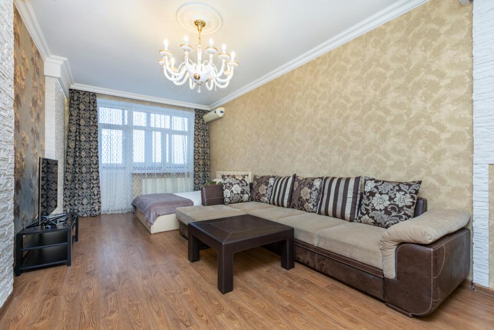 Полноценная однокомнатная квартира на 11 этаже. Просторная комната и кухня гостиная. 4 комфортных спальных места. В комнате большая двуспальная кровать и раскладной диван. Плазменный ТВ с кабельными каналами. Для комфортного проживания есть вся бытовая техника: электроплита, электрический чайник, микроволновая печь, духовой шкаф. Имеется вся необходимая посуда. Имеется водонагреватель на случай отключения горячей воды. Кондиционер. Высокоскоростной бесплатный WI-FI. Питьевая вода "Кристалл". Белоснежное постельное белье один комплект входит в стоимость, полотенца, тапочки. Так же можно заказать дополнительно комплекты постельного белья. Гель для душа, шампунь, мыло, туалетная бумага, освежитель воздуха, средства по уходу за обувью, стиральный порошок, капсулы для посудомоечной машины, губка и средство для посуды. При заезде в квартиру для гостей всегда есть чай, сахар и мини набор для приготовления быстрого завтрака.