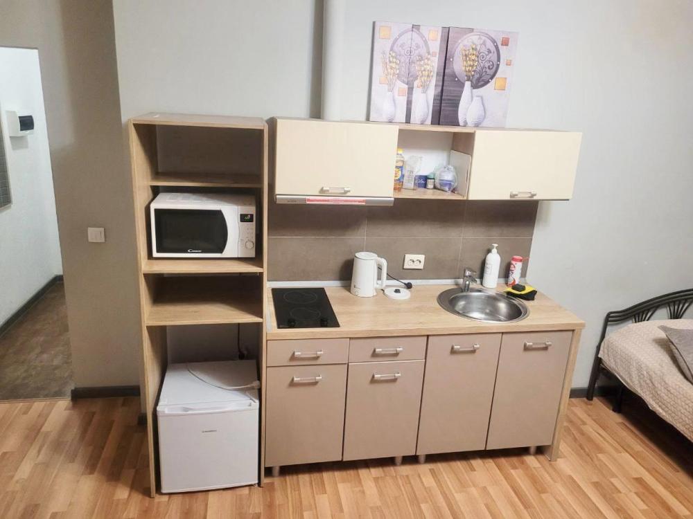 Уютная студия для гостей. В квартире имеется: Средства личной гигиены ( шампунь, гель для душа, мыло, т.бумага), фен (по запросу). Посуда, кухонные приборы и принадлежности для приготовления пищи по своему вкусу. Гладильная доска, сушилка для белья, wi-fi интернет, телевиденье.