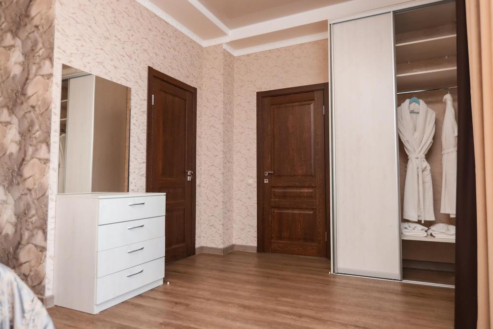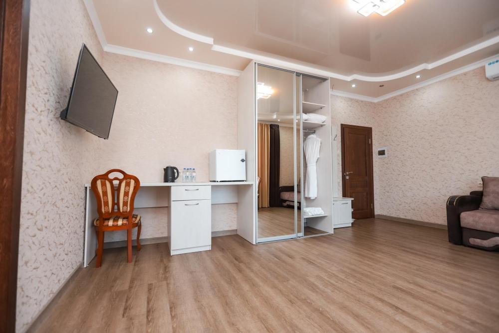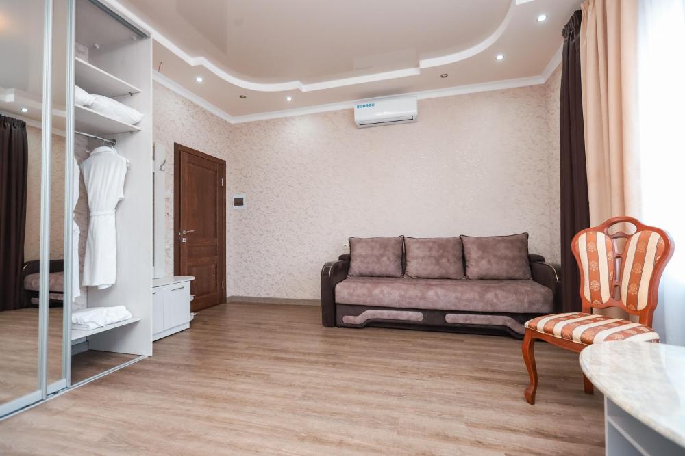 Комфортабельный номер, выполненный в классическом интерьере. Номер оснащен всем необходимым для приятного отдыха и работы: прихожая, спальня с двуспальной кроватью, мягкая кожаная мебель, дополнительные спальные места - раскладной диван, спальня и гостиная с собственным санузлом и душевой, кондиционер, телевизор, wi-fi.