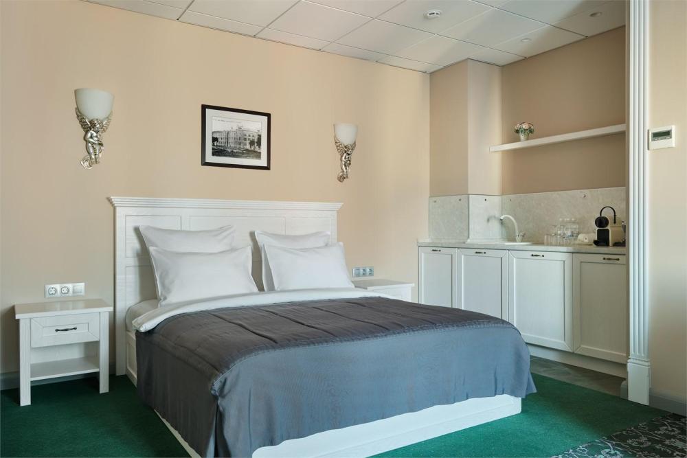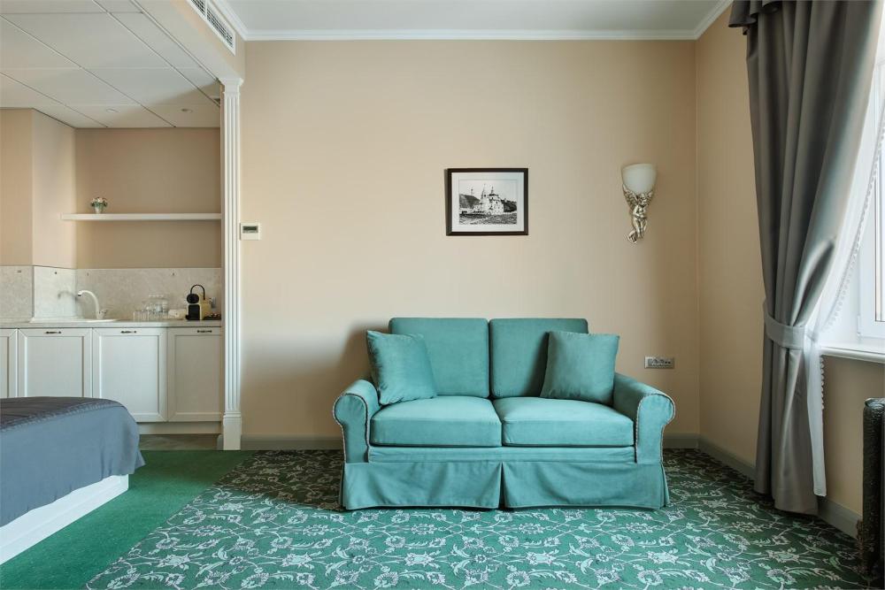 1 комната,кровать king size 180х200 с ортопедическим матрасом, раскладывающийся двухместный диван, прикроватный пуфик, спутниковое ТВ, интернет W-Fi, телефон, индивидуальный сейф, набор для приготовления чая и кофе, 1 бутилированная вода. Ванная комната оснащена стандартной ванной, феном, подогреваемым полом, сушилкой, полотенцами, халат, тапочки, набором ванных и косметических принадлежностей, бритвенный набор-по запросу. Салфетка для обуви,лопатка для обуви. Швейный набор, ватные палочки, расческа в тумбочке под телефоном.Мини-бар.