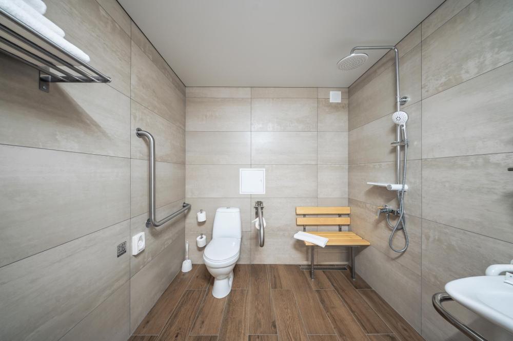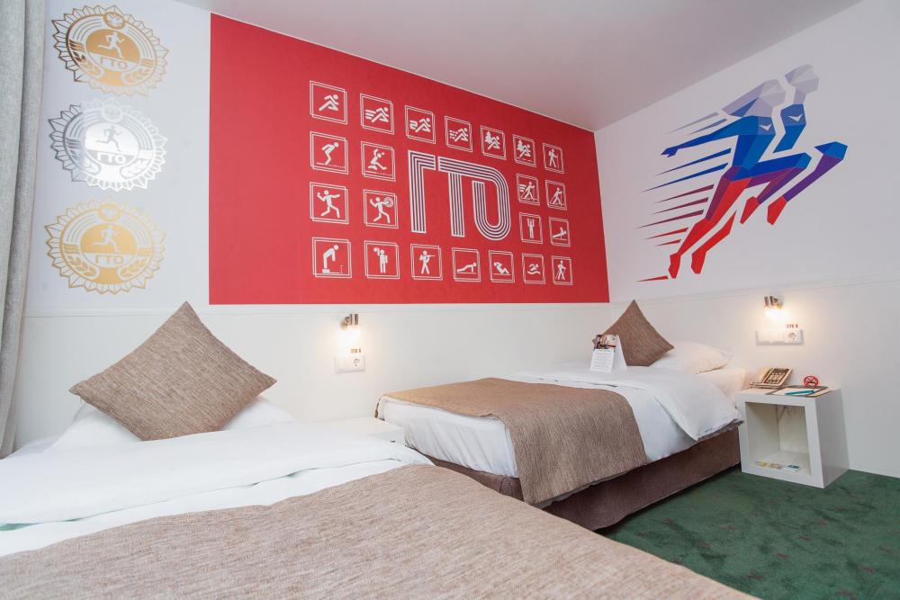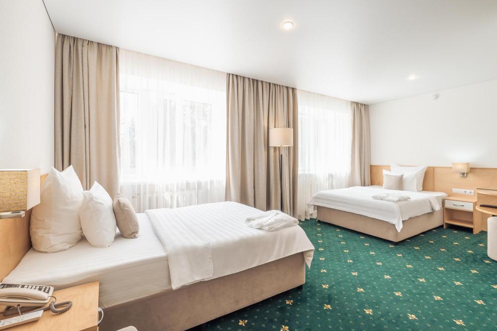Просторный номер для размещения не более двух Гостей, с двумя большими кроватями, рабочей зоной с телевизором, платяным шкафом с полками и ящиками доступного уровня. Специально оборудованная ванная комната со всеми необходимыми принадлежностями. Расположен на одном этаже с медицинским кабинетом, не имеет порогов для беспрепятственного передвижения.