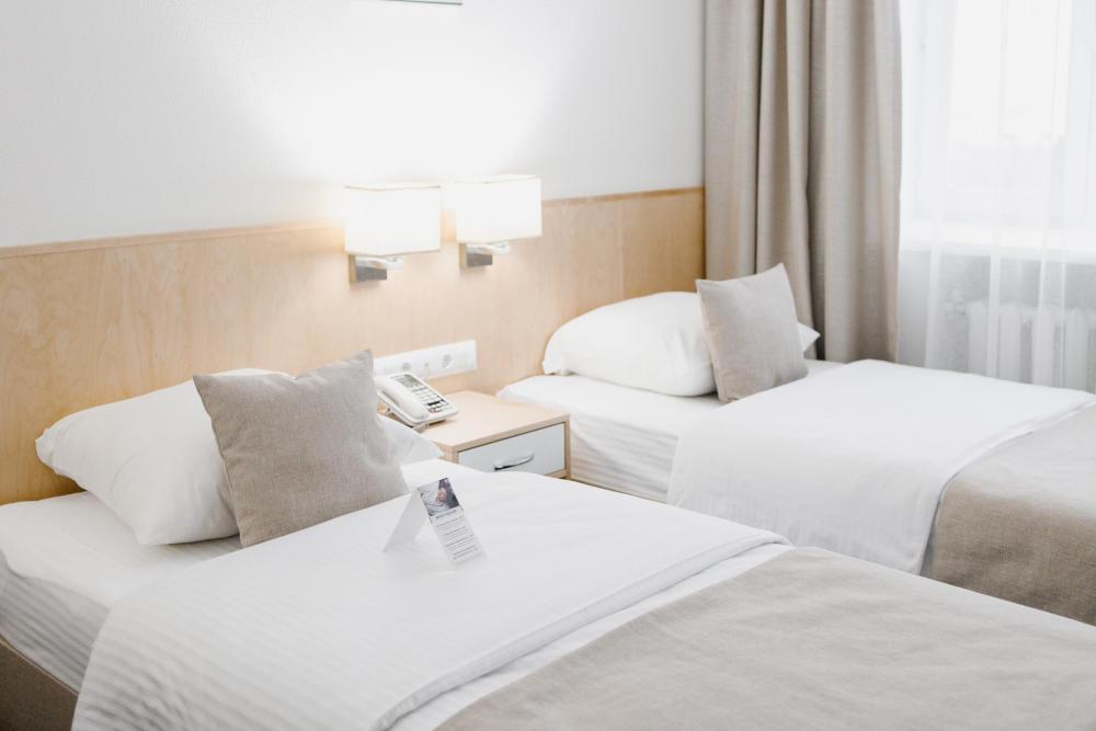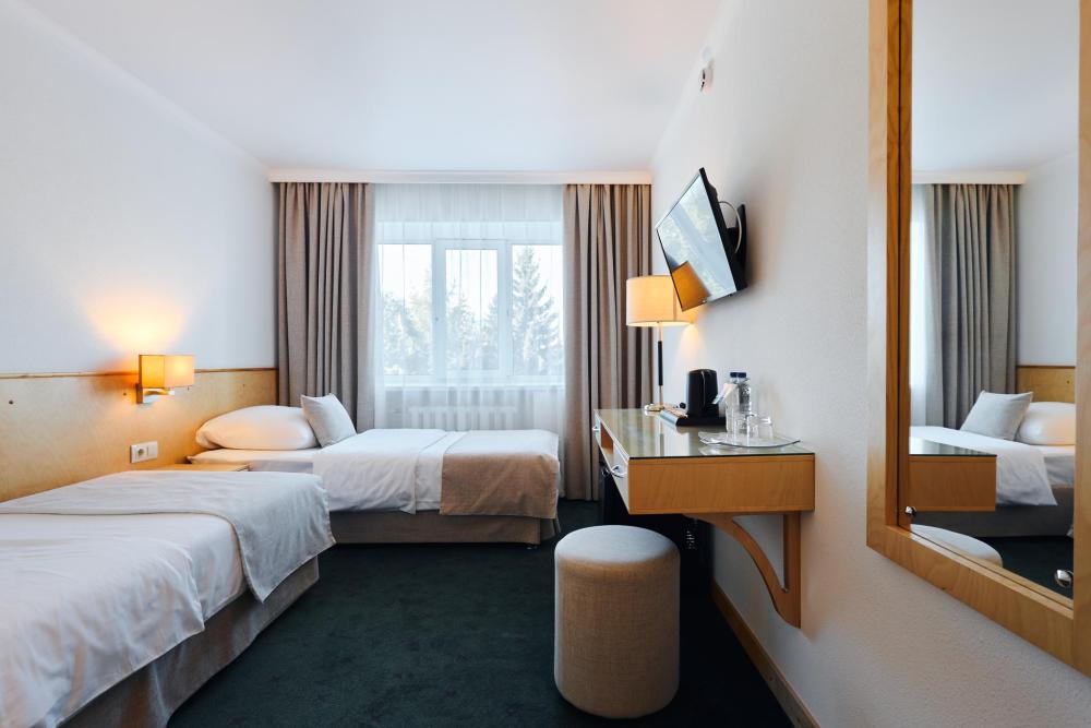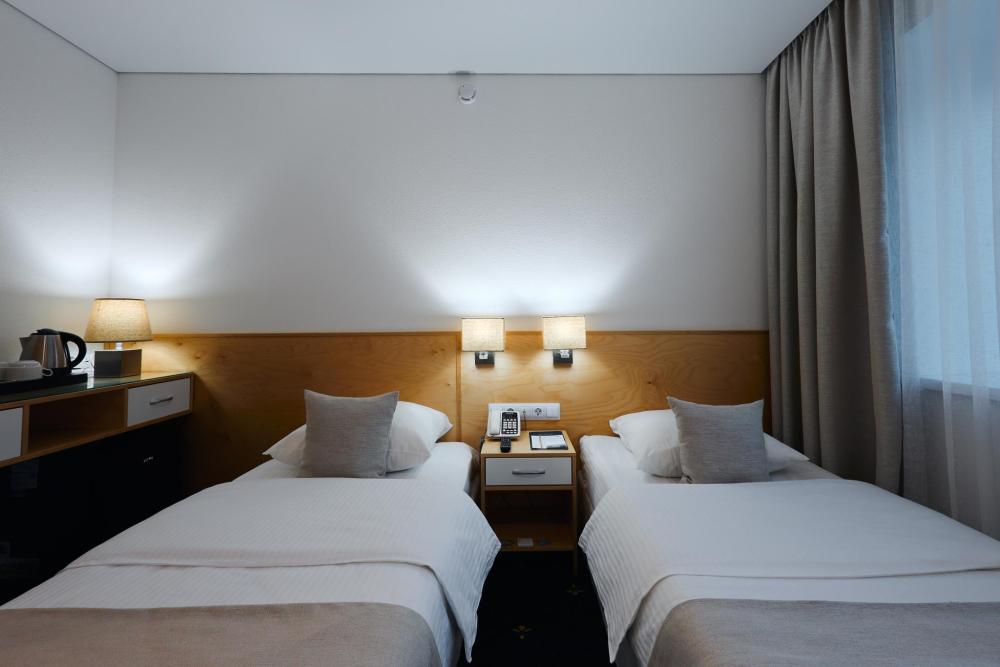 Оптимально подходит для размещения одного или двух Гостей. Номер с двумя односпальными кроватями, шкафом для одежды, с рабочей зоной и телевизором. Ванная комната с душем со всеми необходимыми принадлежностями. Из окон большинства номеров открывается вид на парковую зону или на бульвар Гостеприимства в центральной части города.