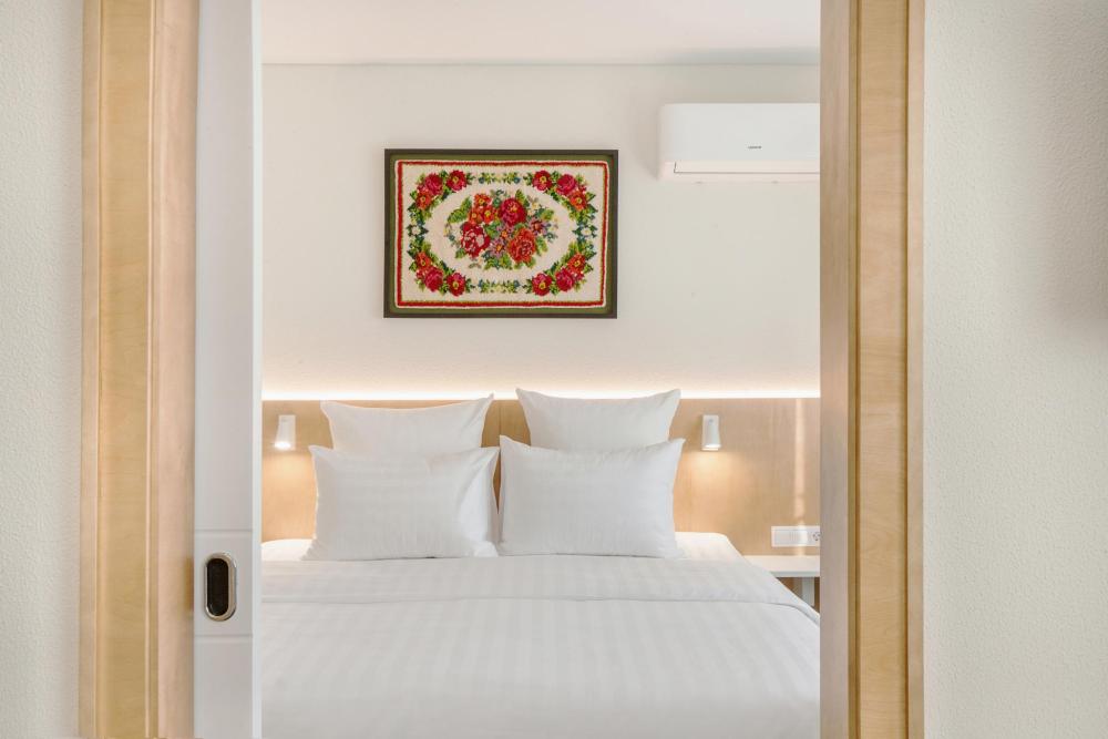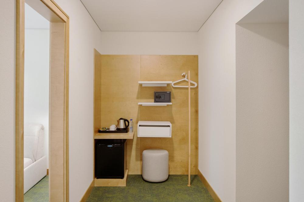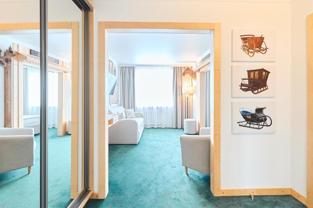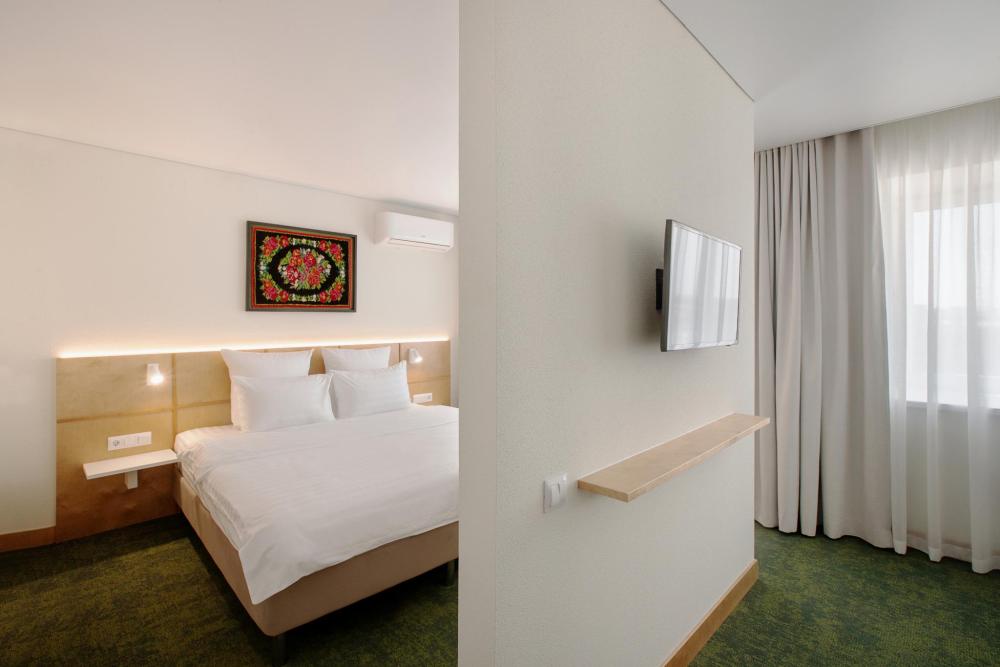 Просторный двухкомнатный номер, с возможностью комфортного размещения двоих взрослых и двоих детей. 2-х комнатный номер с большой двуспальной кроватью, раскладным диваном, системой хранения одежды и вещей, телевизором, кофемашиной, с планировкой, позволяющей использовать часть помещения в качестве гостиной, кабинета или спальни. В день заезда мини-бар предоставляется бесплатно. Отдельная ванная комната со всеми необходимыми принадлежностями. Этажность, наличие кондиционера и вид из окна – на выбор Гостя при наличии.