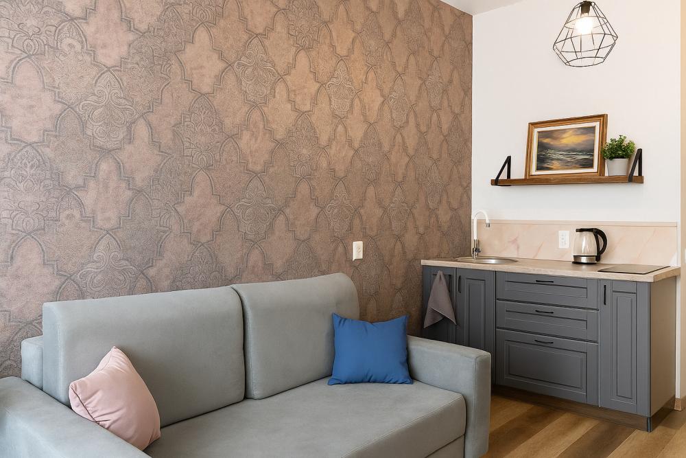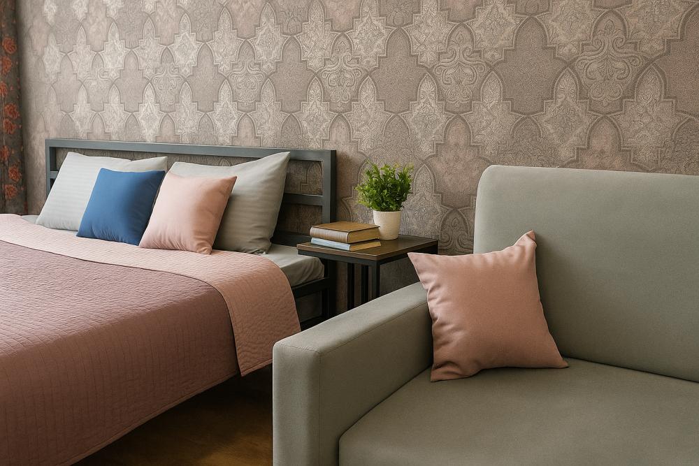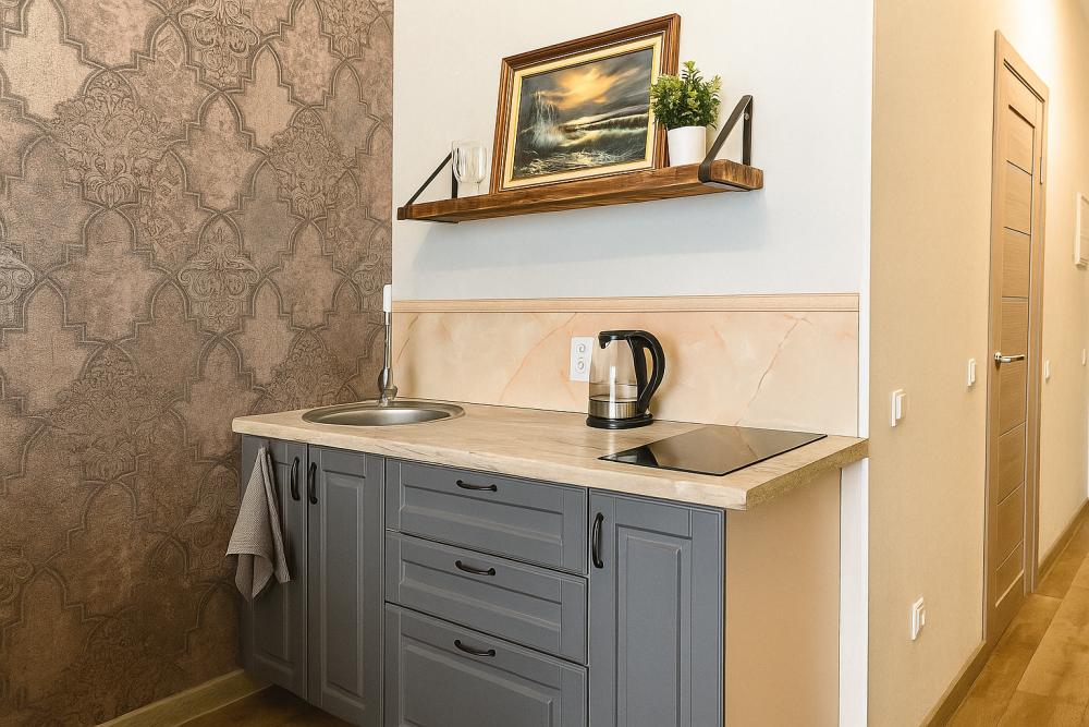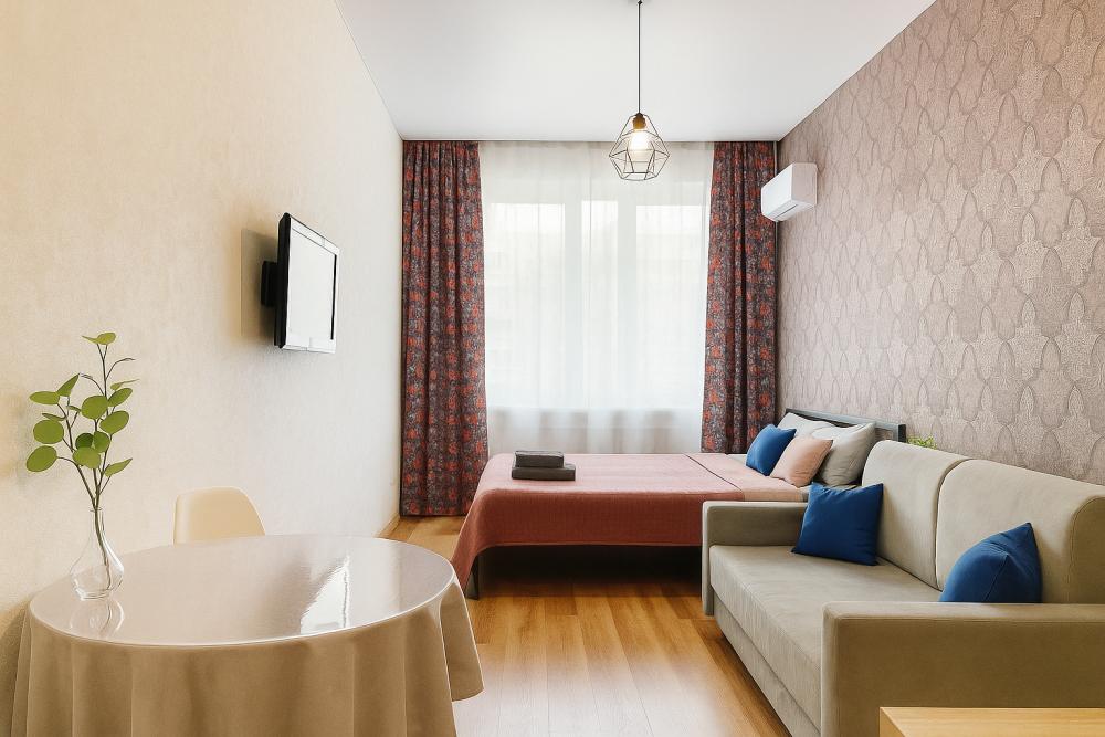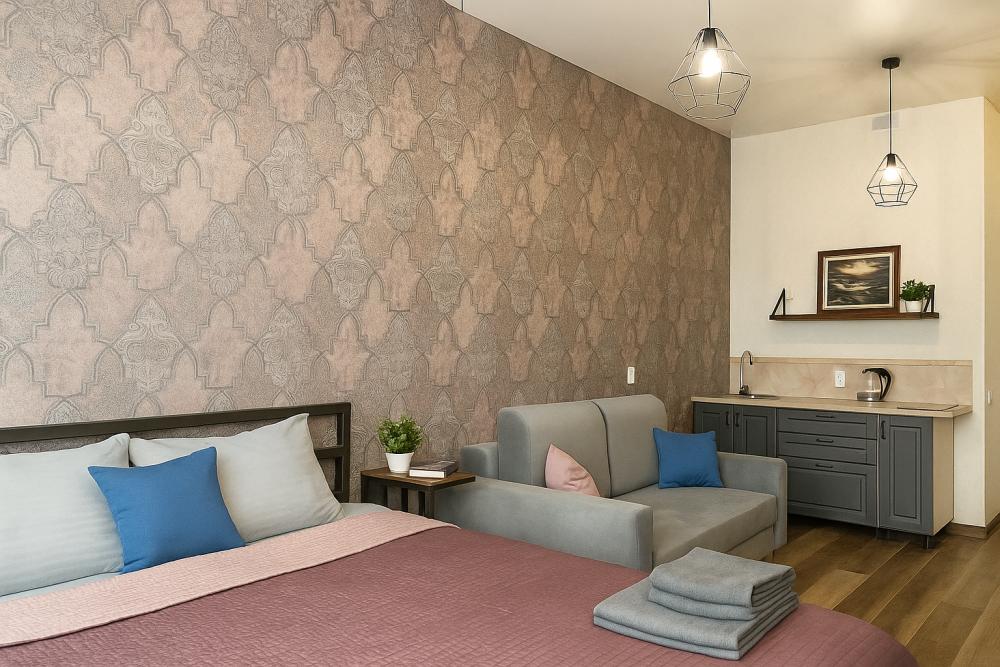 Уютная студия с мягким освещением и спокойными тонами — место, где можно расслабиться после прогулок по центру Уфы или делового дня. Здесь комфортно разместятся до 3 гостей: пара, друзья или коллеги. Внутри вас ждёт: • Двуспальная кровать 160×200 и раскладной диван • Телевизор, Wi-Fi, кондиционер • Кухня с плитой, холодильником, микроволновкой, посудой, кофе и чаем • Стиральная машина, утюг, фен, средства гигиены • Водонагреватель, постельное бельё и полотенца для всех гостей