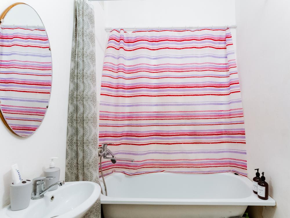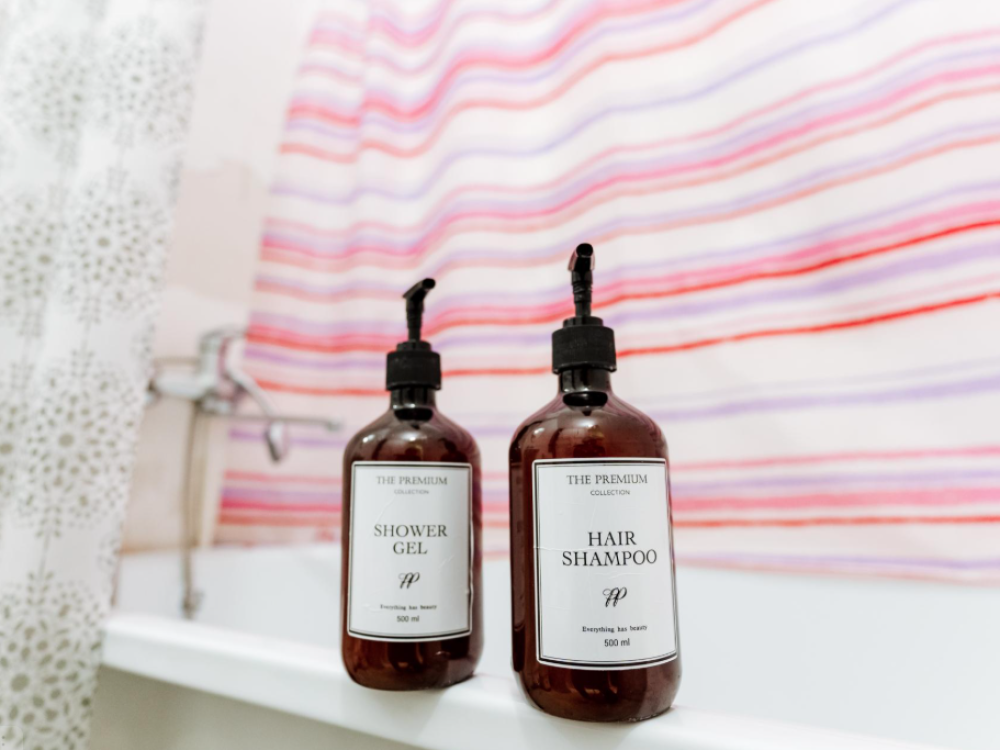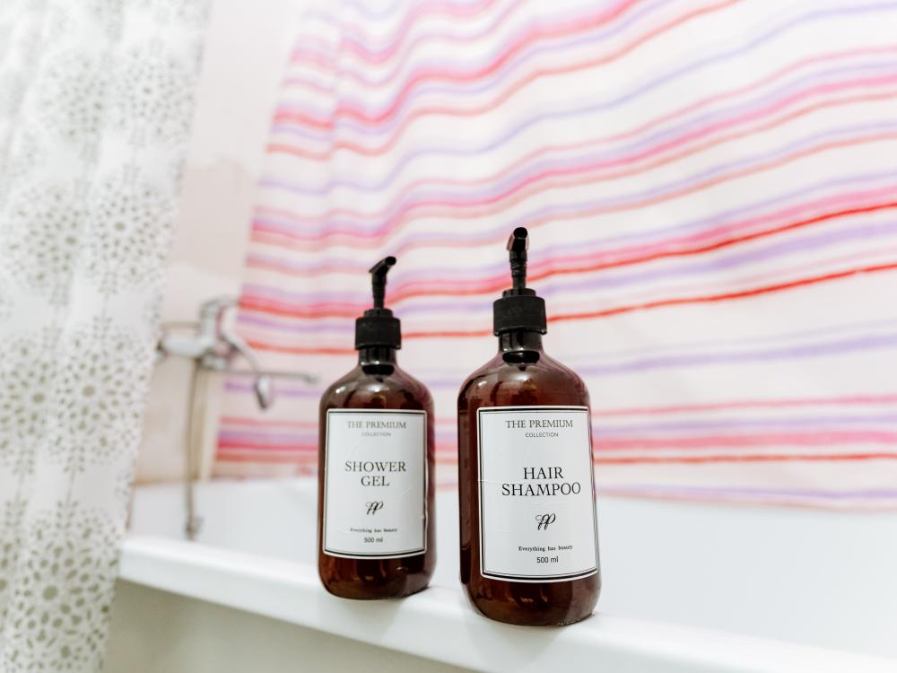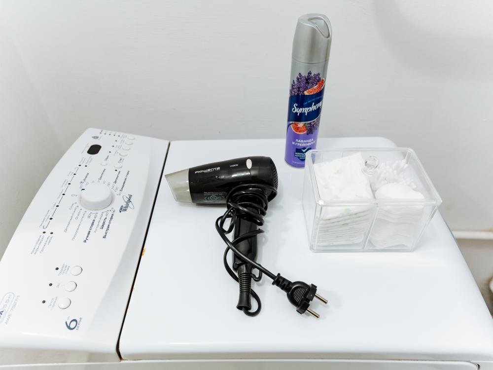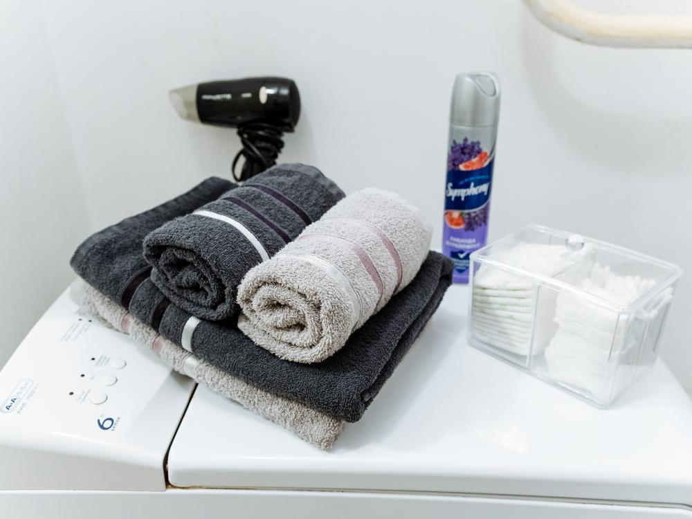 ВАННАЯ КОМНАТА: ванна, чистые полотенца, гель для душа, шампунь, жидкое мыло, из техники: стиральная машина, фен)