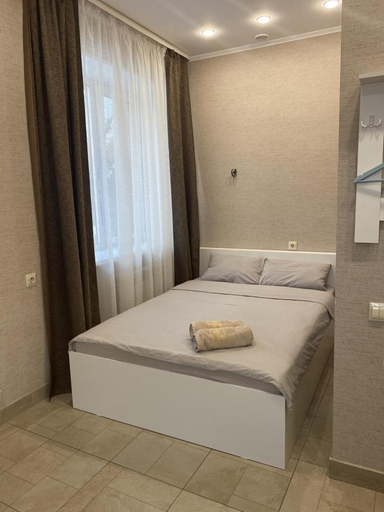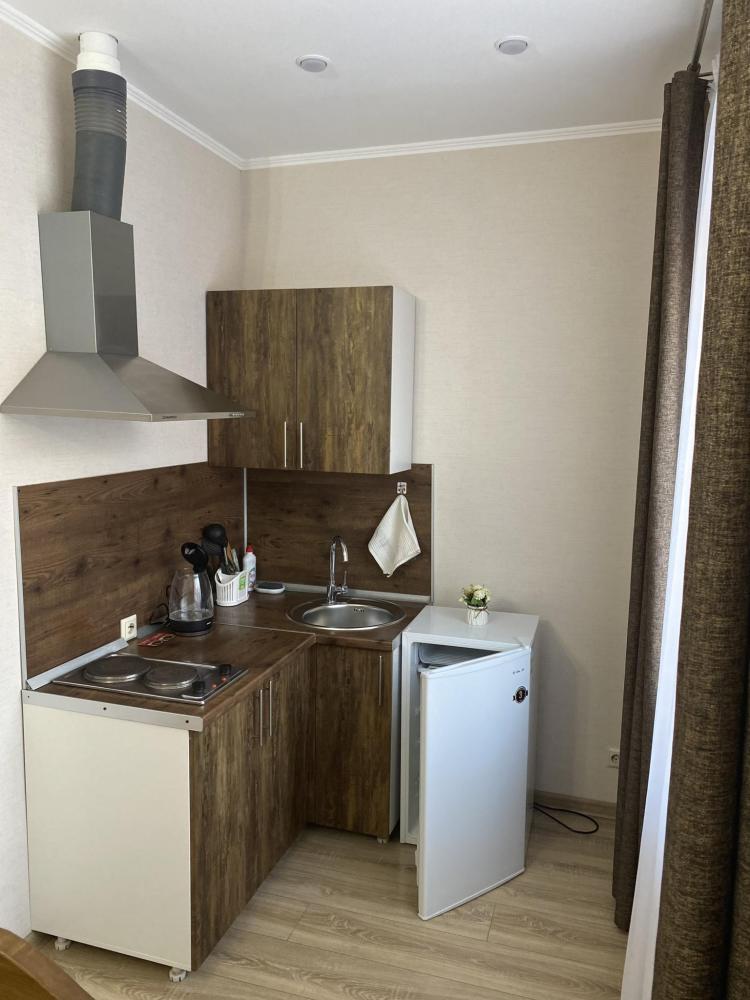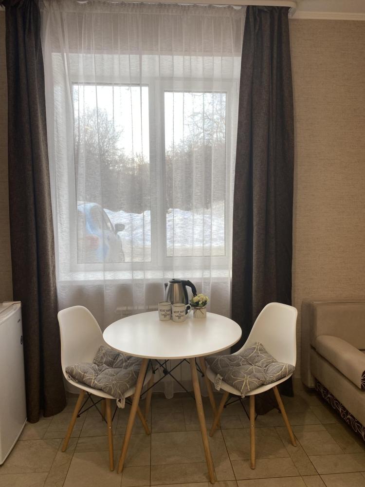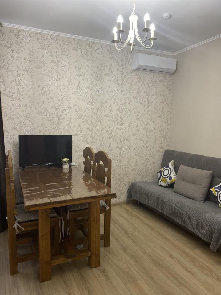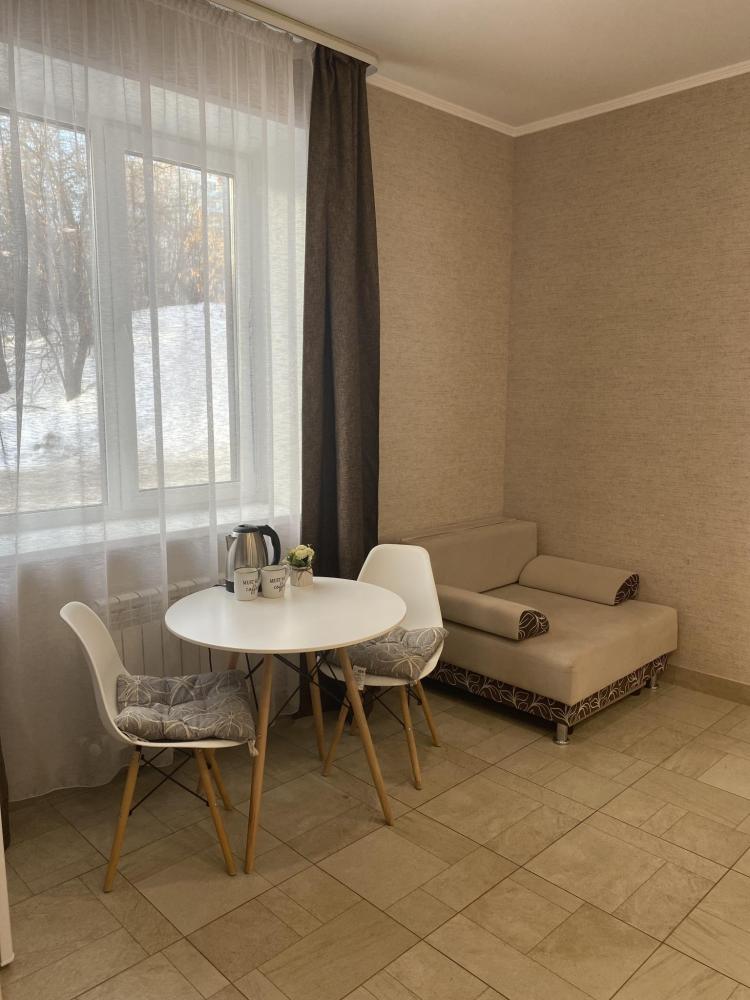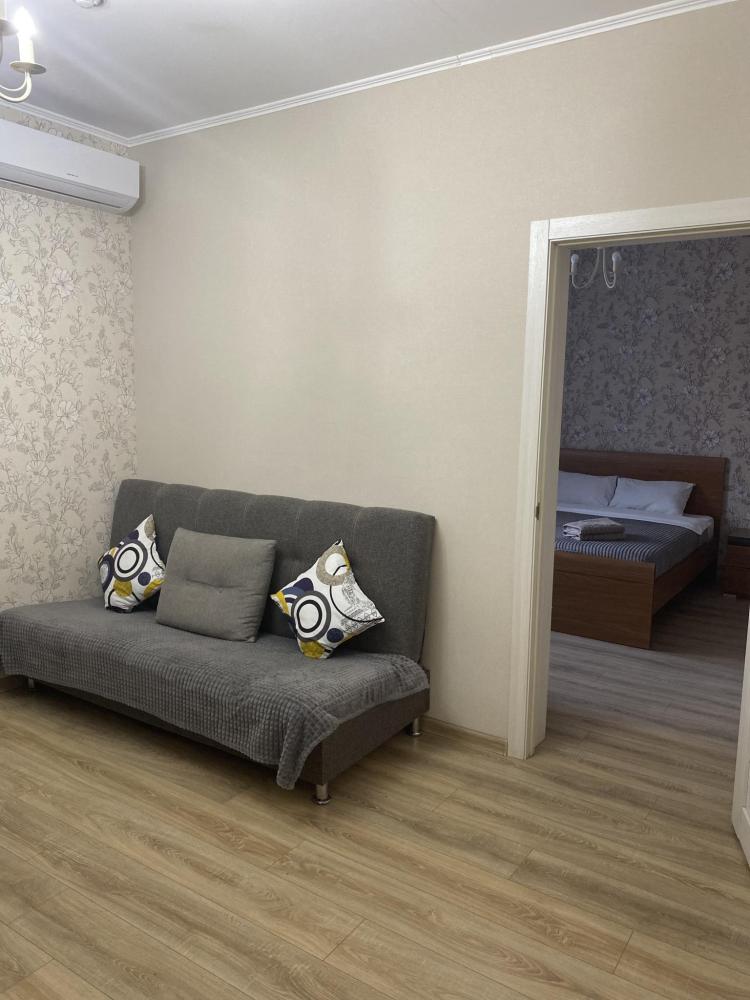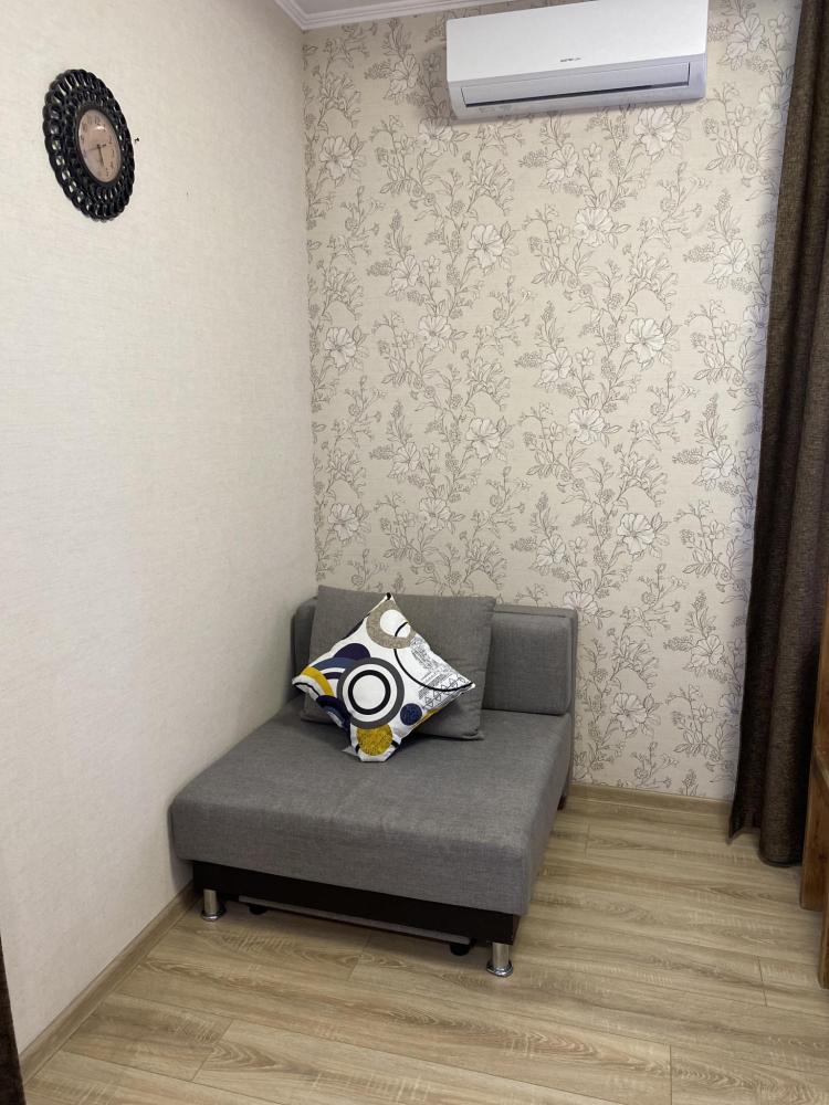 Апартаменты оснащены двуспальной кроватью (диван раскладной + доп.место - кресло), телевизором, кондиционером, холодильник , электрический чайник, обеденной зоной (стол+стулья), а так же собственной ванной комнатой.