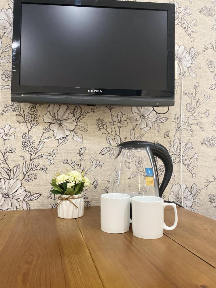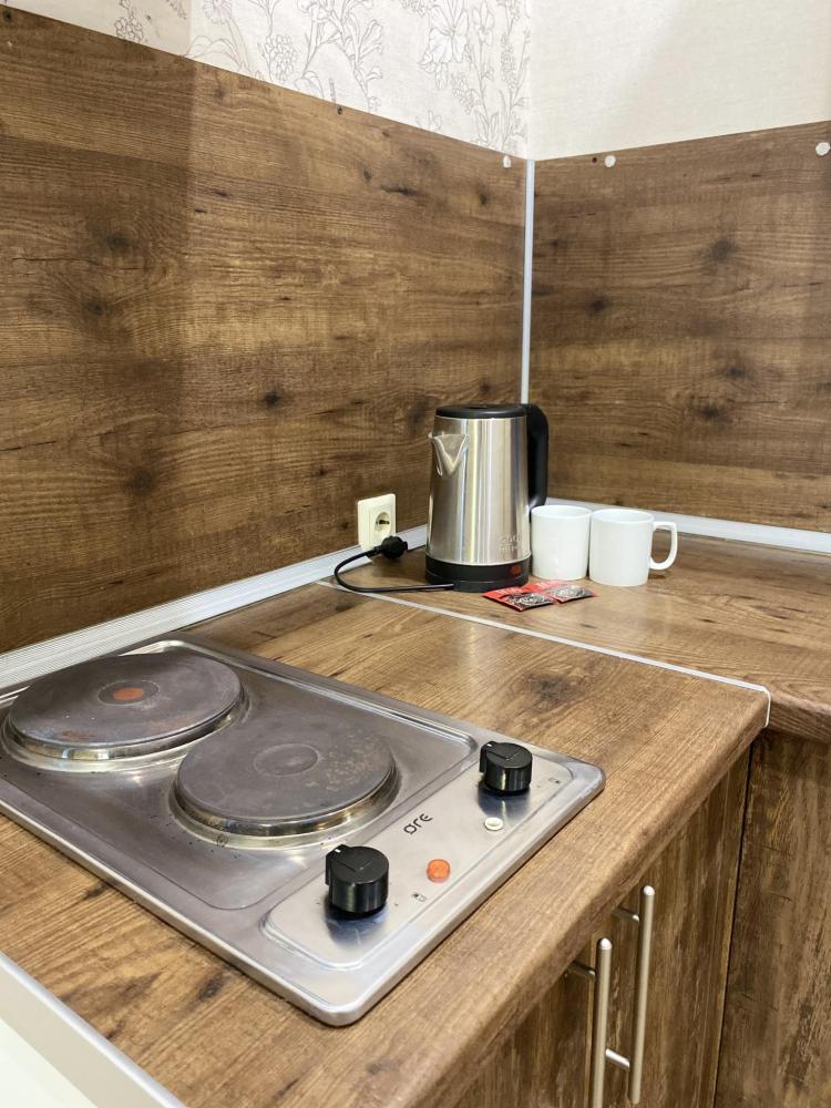 Апартаменты оснащены двуспальной кроватью (доп.место - кресло-кровать), телевизором, кондиционером, чайником и посудой, обеденной зоной (стол+стулья), а так же собственной ванной комнатой.