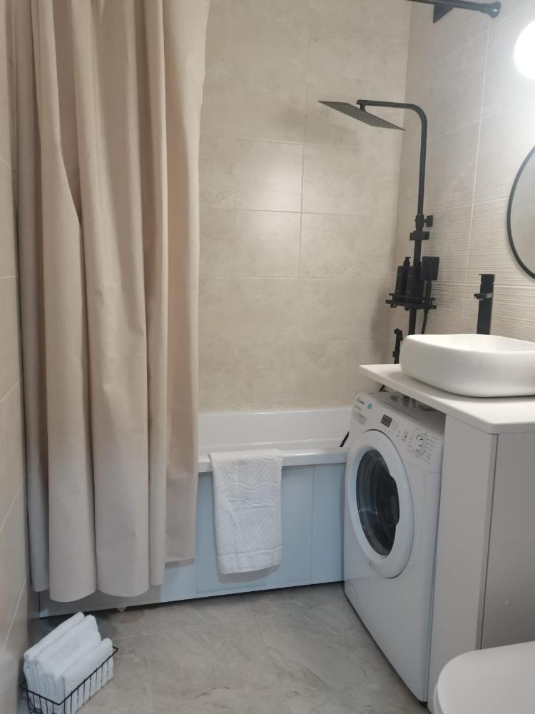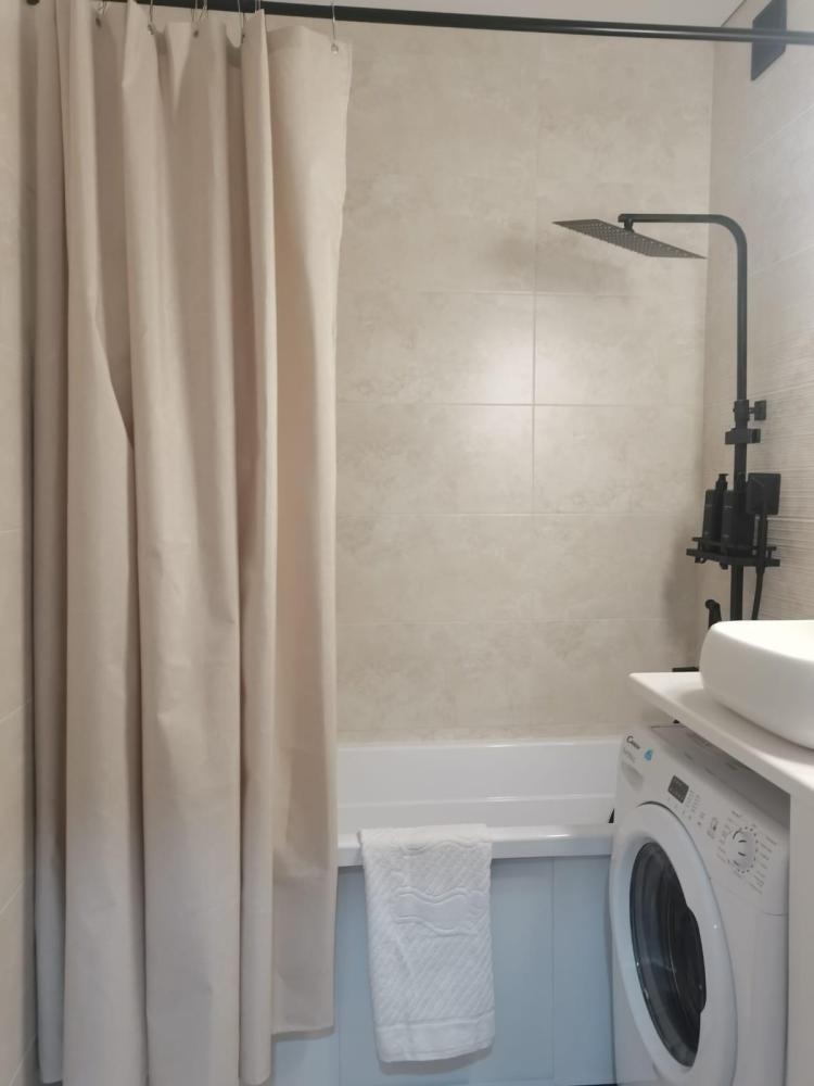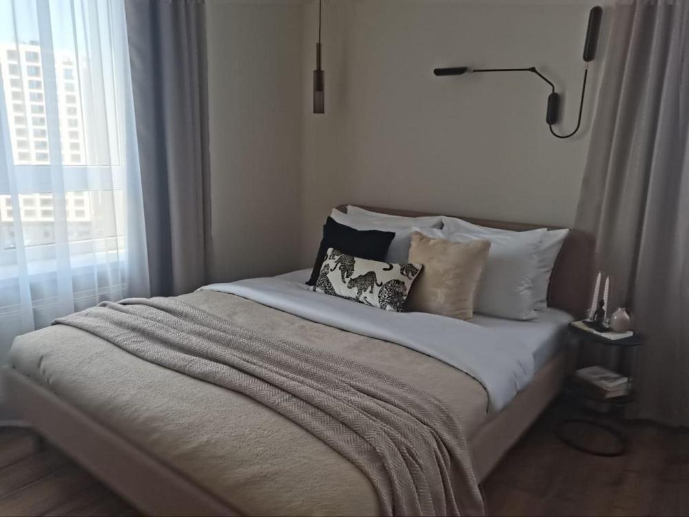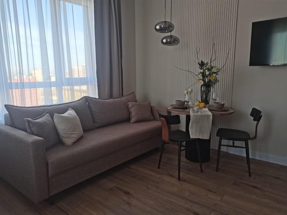 Просторная студия с панорамным видом на ночной город. В номере собственный сан узел, кухня и небольшой балкон. Возможно размещение от 1 -2 гостей (двуспальная кровать 160 см) до 3 (отдельный диван)