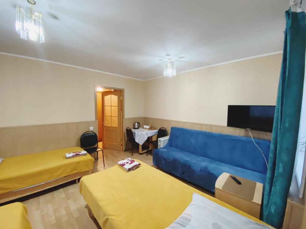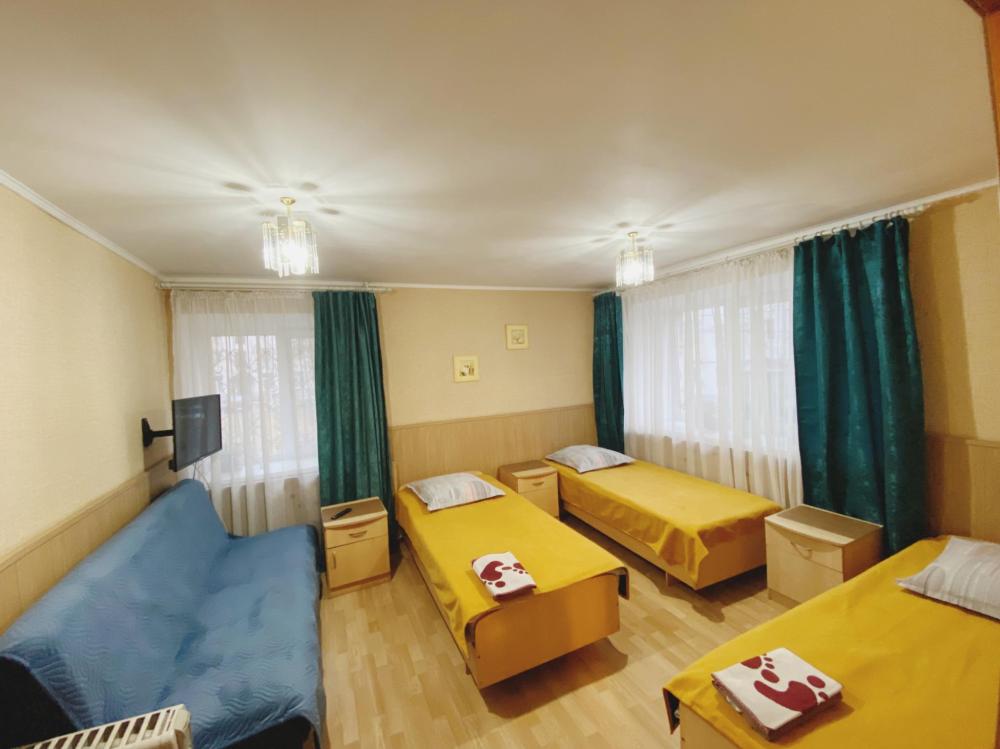 Четырехместная комната комфорт общей площадью 24 кв.м. с двумя односпальными кроватями и раскладным диваном. Оснащение: Wi-Fi, санузел с душем, чайник, чай, вода в кулере, СВЧ печь, холодильник, ТВ, комплект постельного белья и полотенец, бытовая химия, жидкое мыло, стиральный порошок.