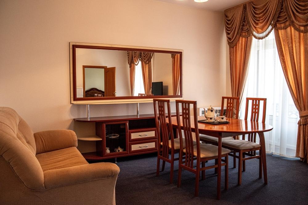 Двухкомнатный просторный номер в классическом стиле. Состоит из спальни и гостиной. В спальне широкая кровать, комод; в гостиной мягкая мебель диван-кровать, шкаф с посудой и рабочая зона с письменным столом и телевизором. Также, есть обеденный стол, при входе - гардеробная система. Санузел с душевой кабиной и просторной ванной. Из удобств предоставляется махровый халат.