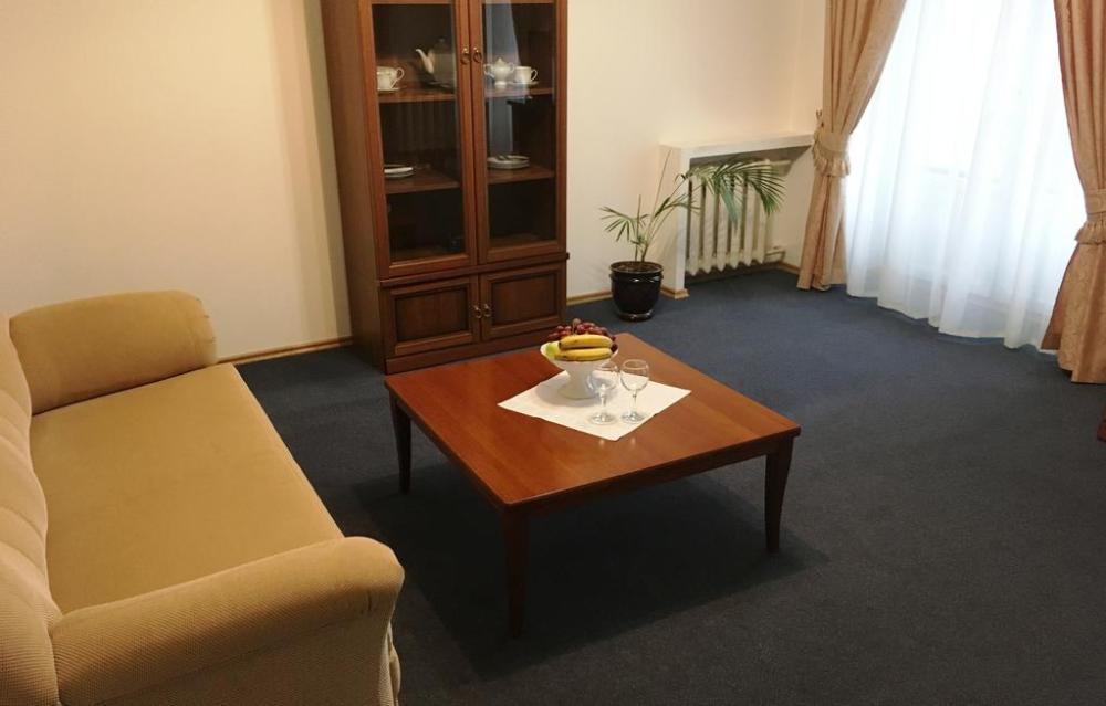 Двухкомнатный номер в классическом стиле. Состоит из спальни и гостиной. В спальне широкая кровать, комод; в гостиной мягкая мебель (диван/кресло/диван-кровать), рабочая зона с письменным столом и телевизором. Также, есть обеденный или журнальный стол, при входе - гардеробная система. Санузел, помимо душевой кабины дополнен просторной ванной. Из удобств предоставляется махровый халат.