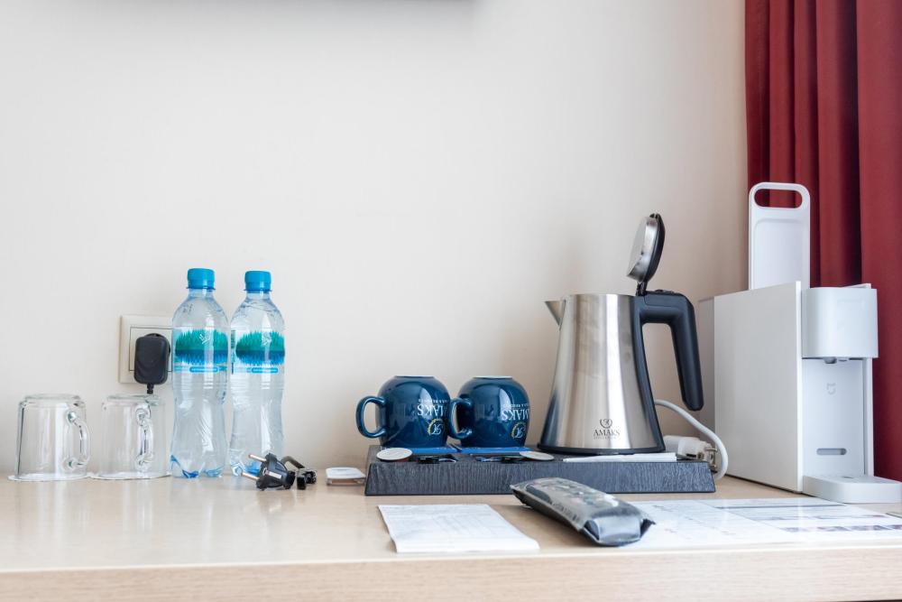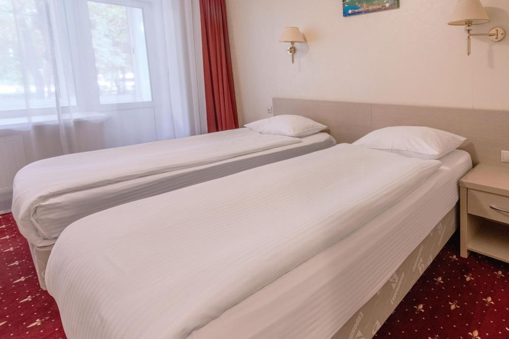 Площадь номера: 22 кв.м., размещение до 2 чел. Комната: двуспальная кровать или две раздельные, кондиционер, тапочки, халат, тумбочки, стол, стул, холодильник, телефон, телевизор, Ванная комната: душевая кабина, туалетные принадлежности, комплект полотенец.