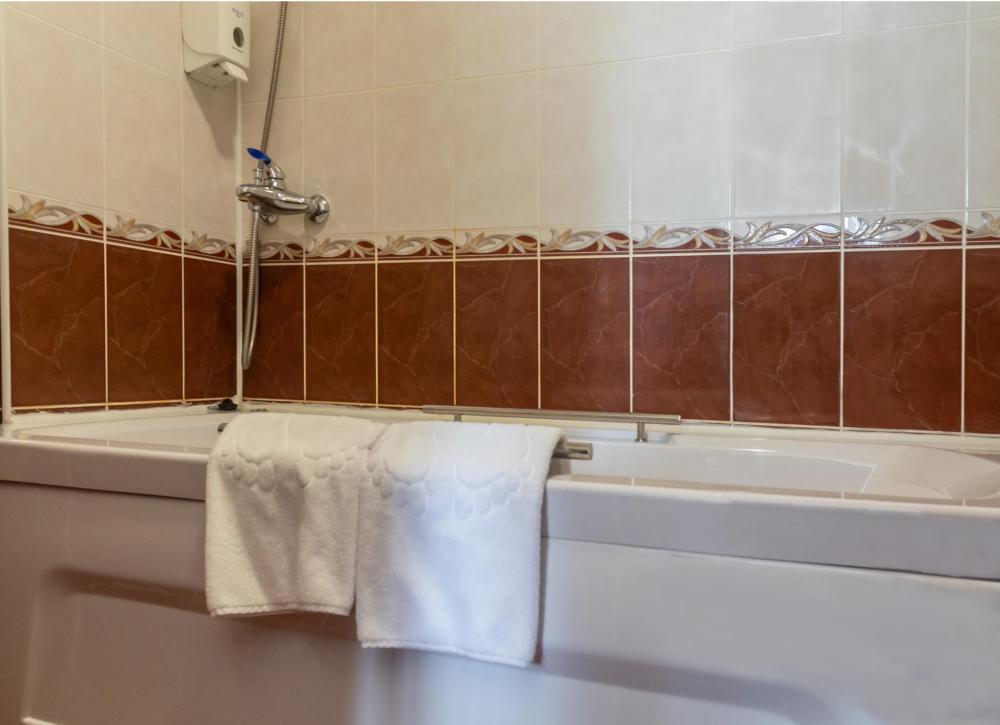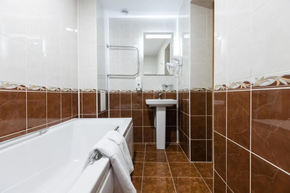 Двухкомнатный номер, S = 36 кв.м. (гостиная и спальня). В номере: Одна двуспальная кровать (шир. 180 см.), телевизор ЖК, мини-бар, телефон, доступ WiFi. Ванная комната: санузел, ванна, туалетные принадлежности, зубной набор, бритвенный набор, халат, тапочки, фен.