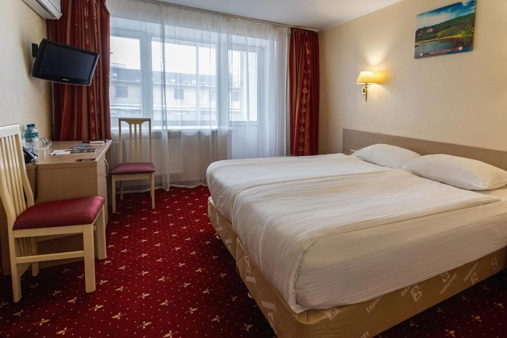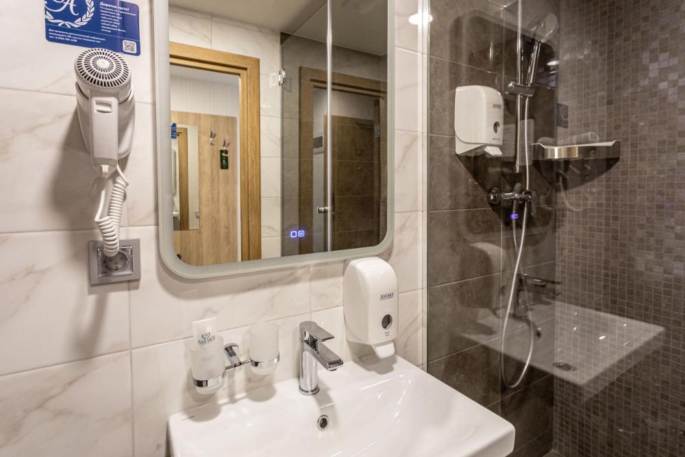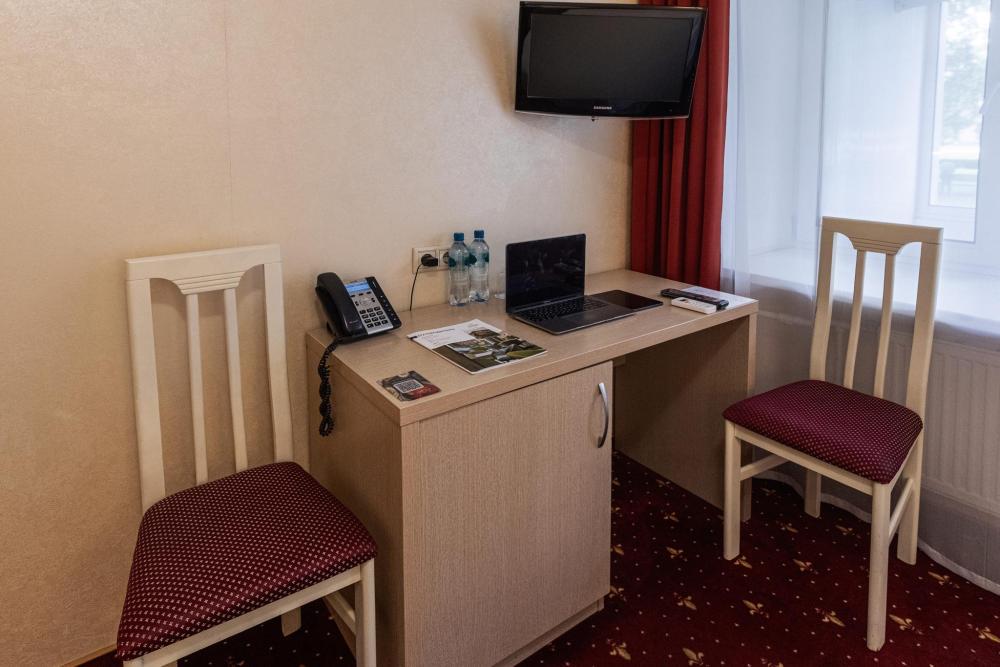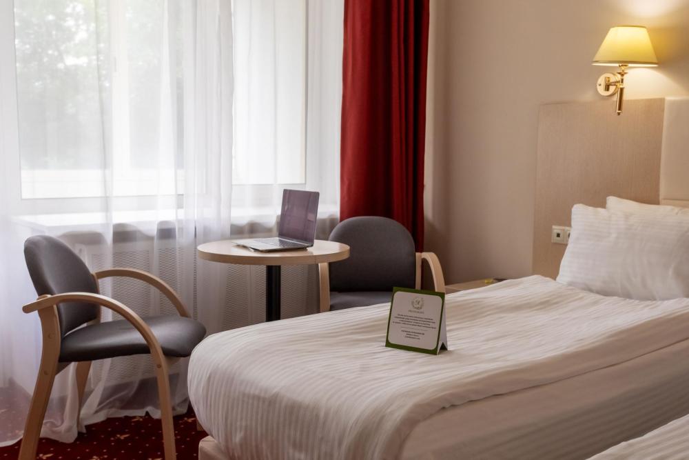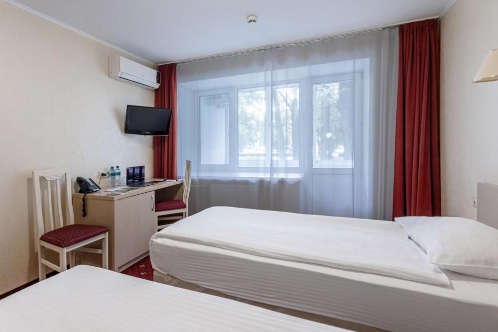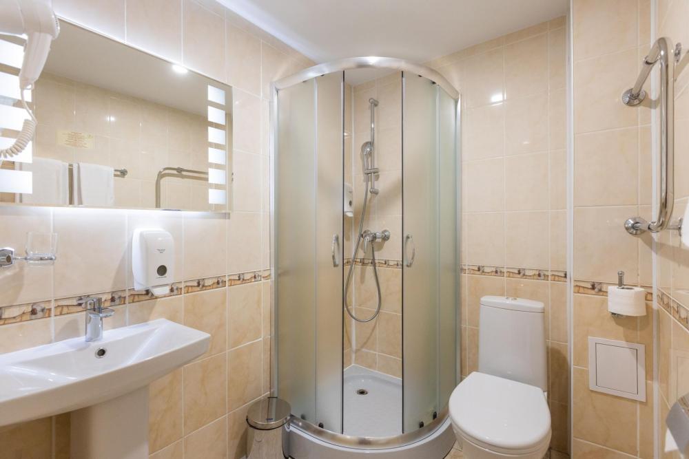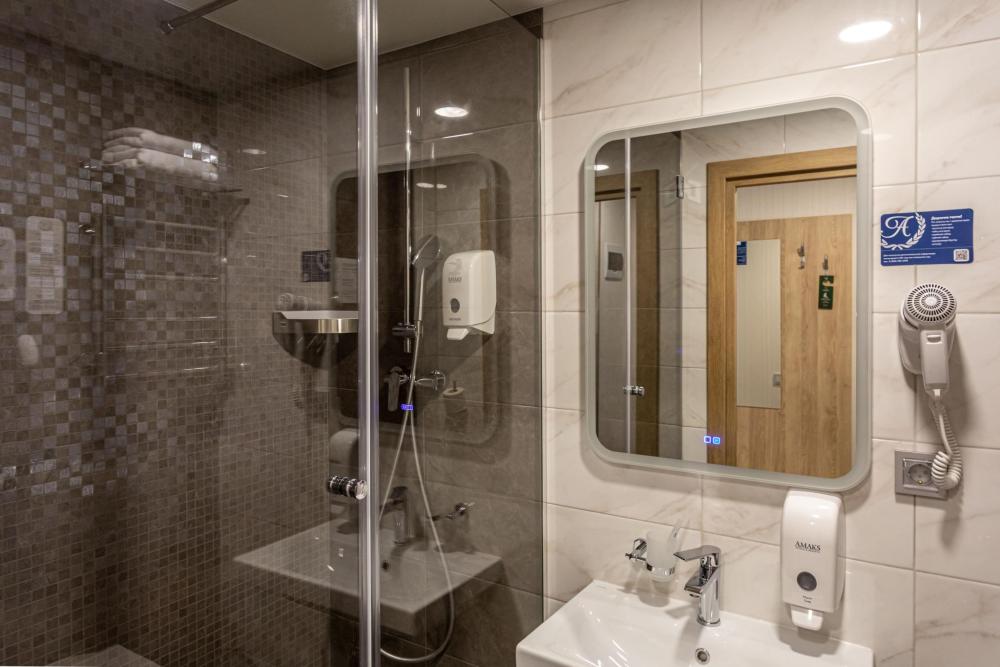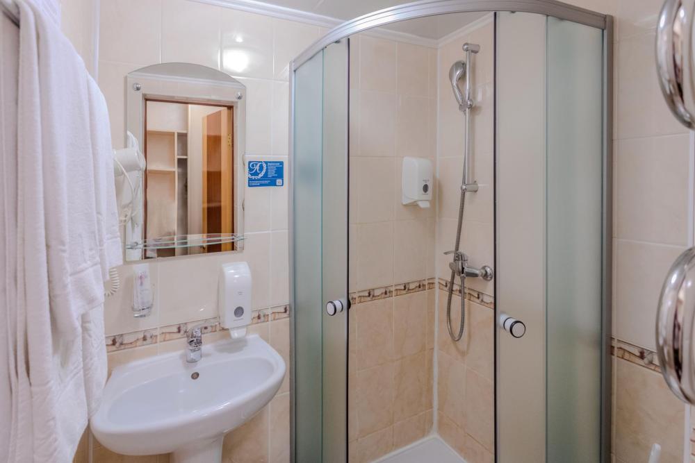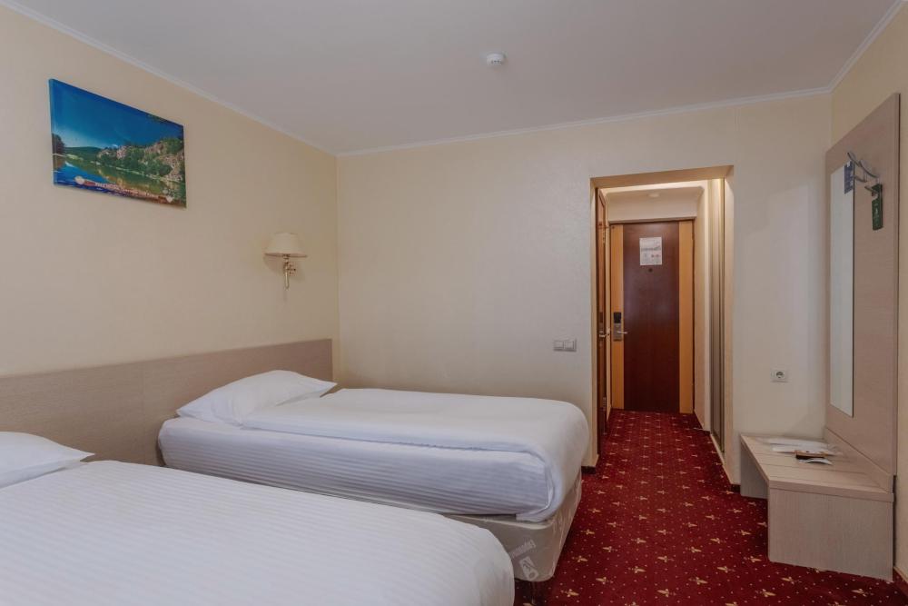 ПОднокомнатный номер, S = 22 кв.м. В номере: две односпальные кровати (шир. 90 см.) или одна двуспальная кровать (шир.180 см.), телевизор, телефон, тапочки, зубной набор, доступ WiFi. Ванная комната: санузел, душевая кабина, туалетные принадлежности, фен.