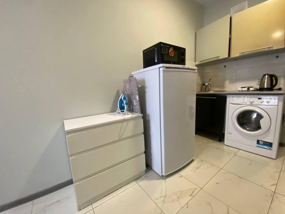 Постельное бельё, полотенца, посуда,фен, утюг, гладильная доска, сушилка, микроволновая печь, плита, водонагреватель, стиральная машина, холодильник.