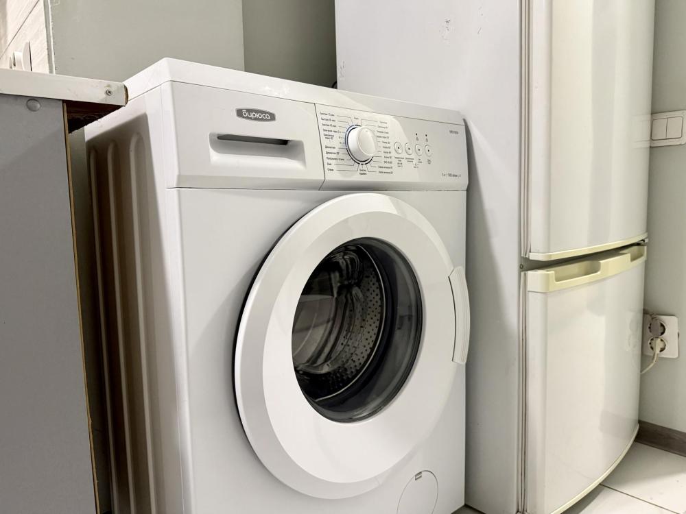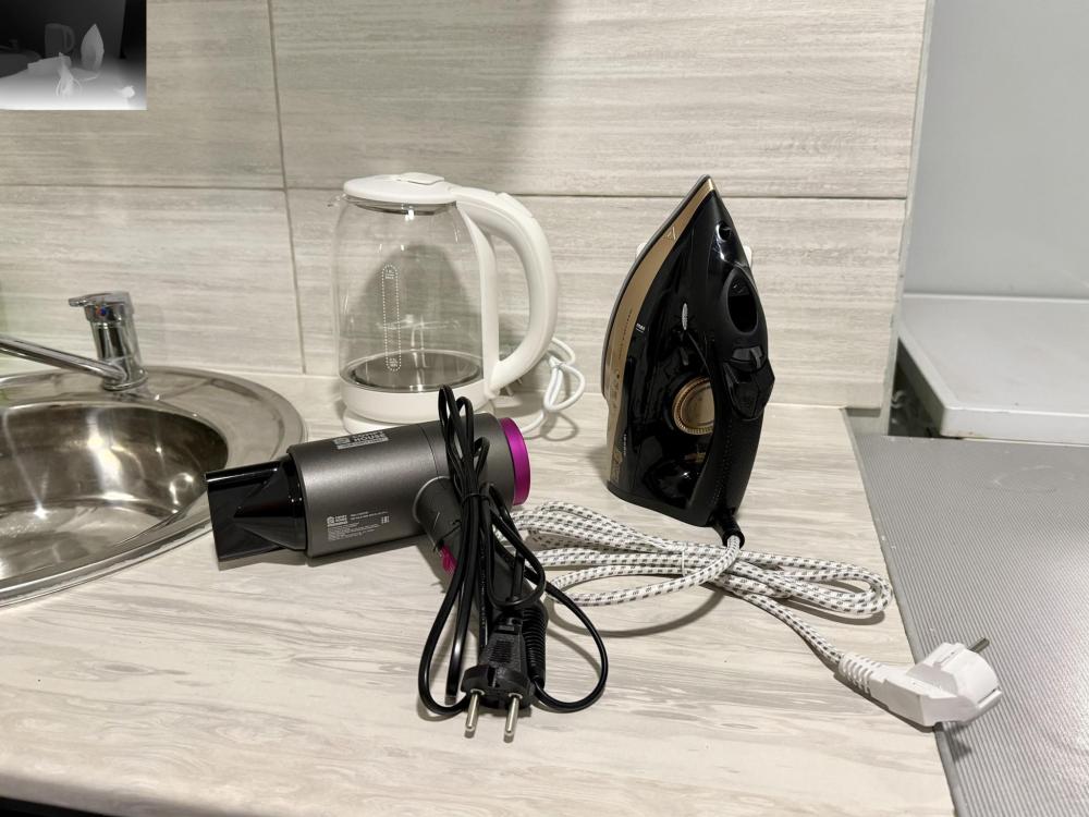Постельное бельё, полотенца, посуда,фен, утюг, гладильная доска, сушилка, микроволновая печь, плита, водонагреватель, стиральная машина, холодильник.