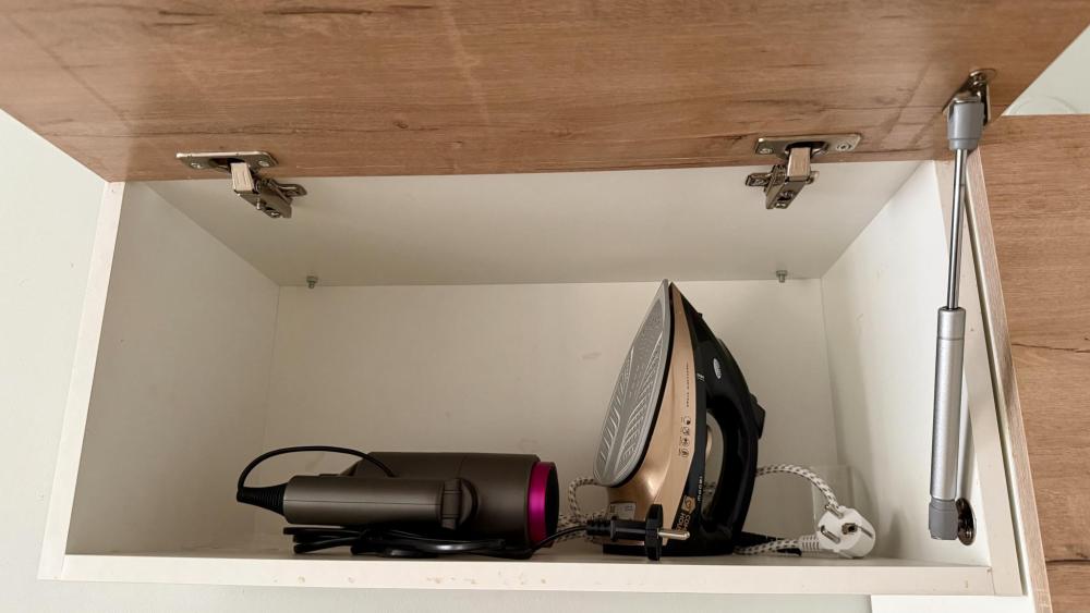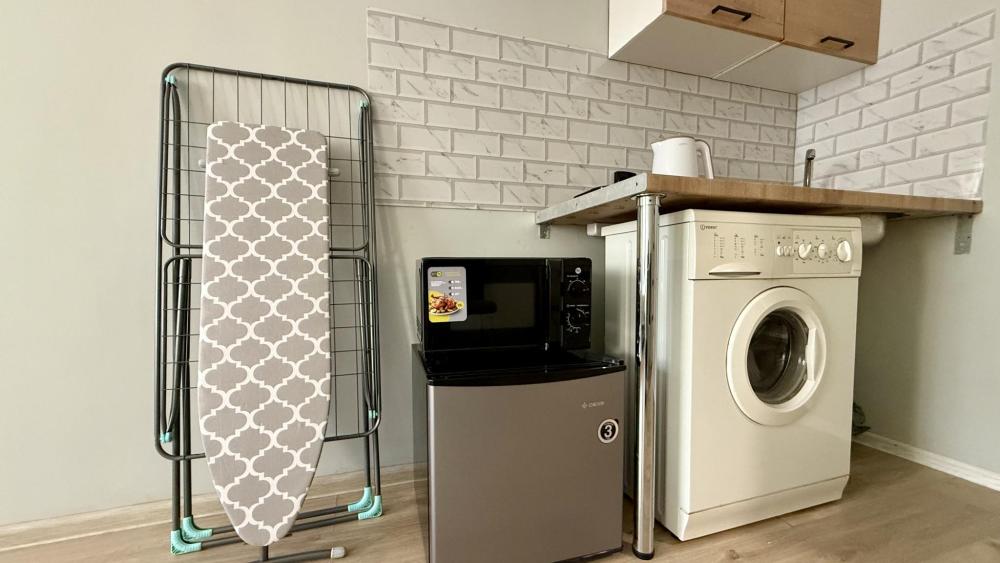Постельное бельё, полотенца, посуда,фен, утюг, гладильная доска, сушилка, микроволновая печь, плита, водонагреватель, стиральная машина, холодильник.
