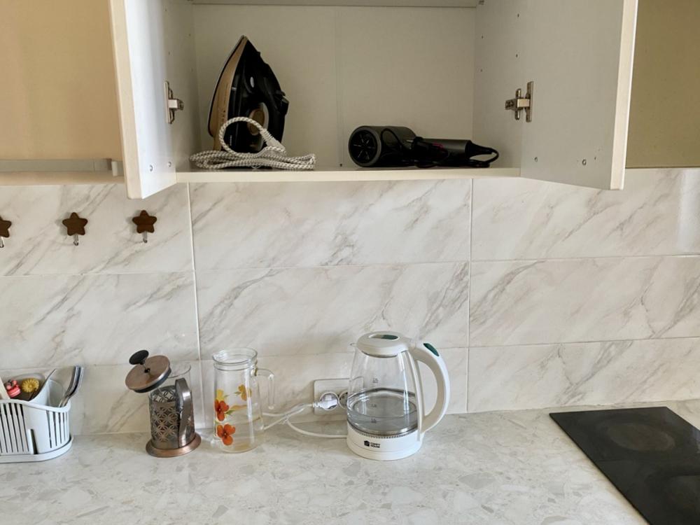 Постельное бельё – 100% хлопок, Полотенца, Посуда, Фен, Утюг, Гладильная доска, Сушилка, Микроволновая печь, Плита, водонагреватель, Стиральная машина, Холодильник.