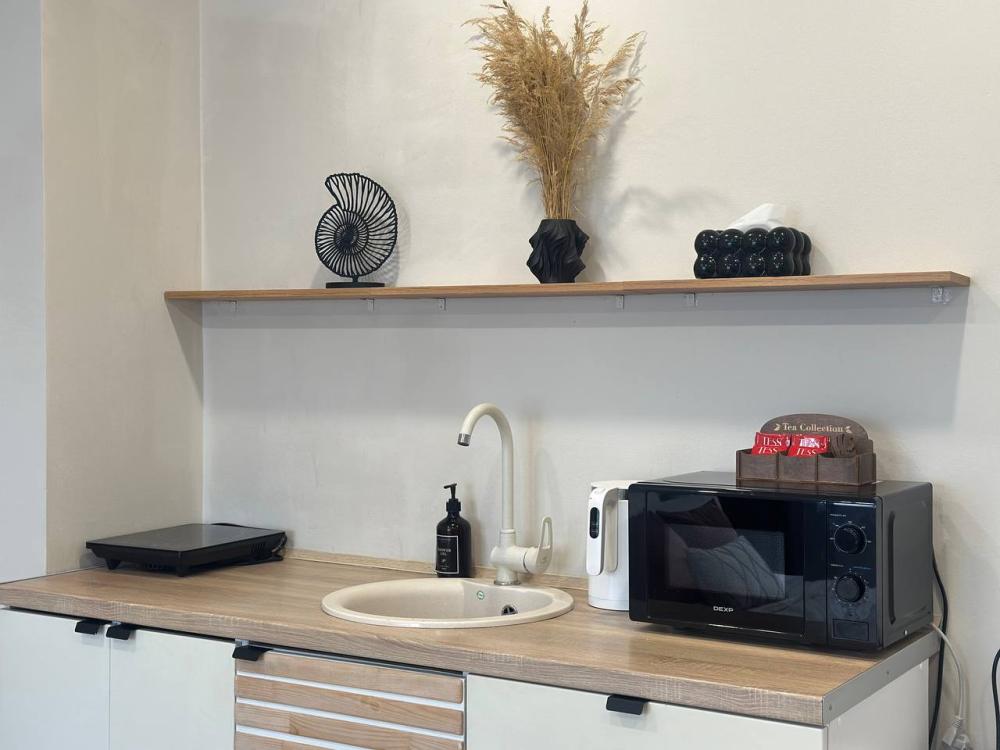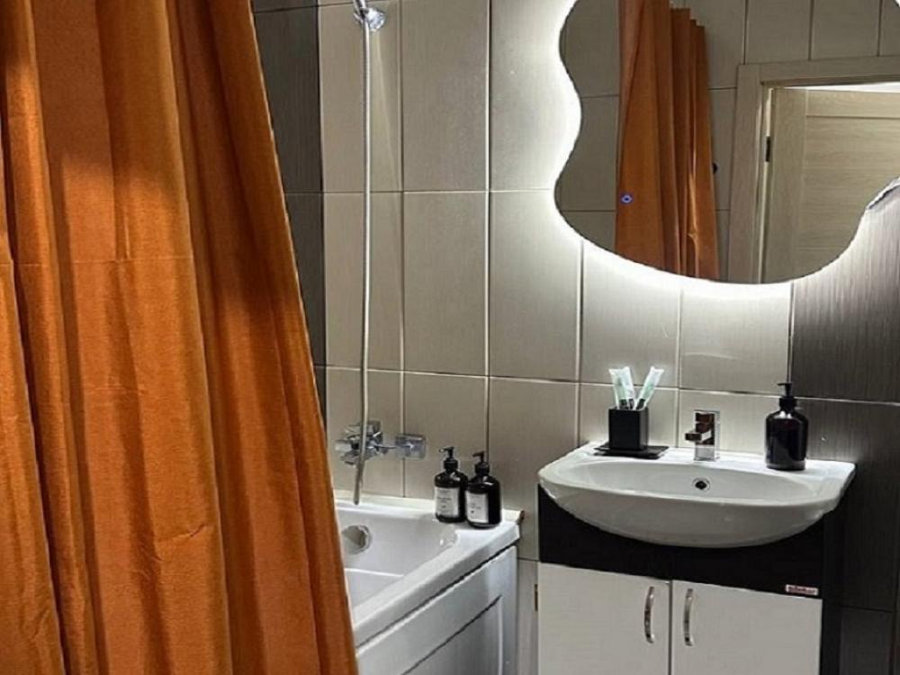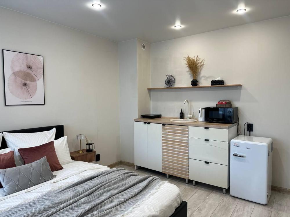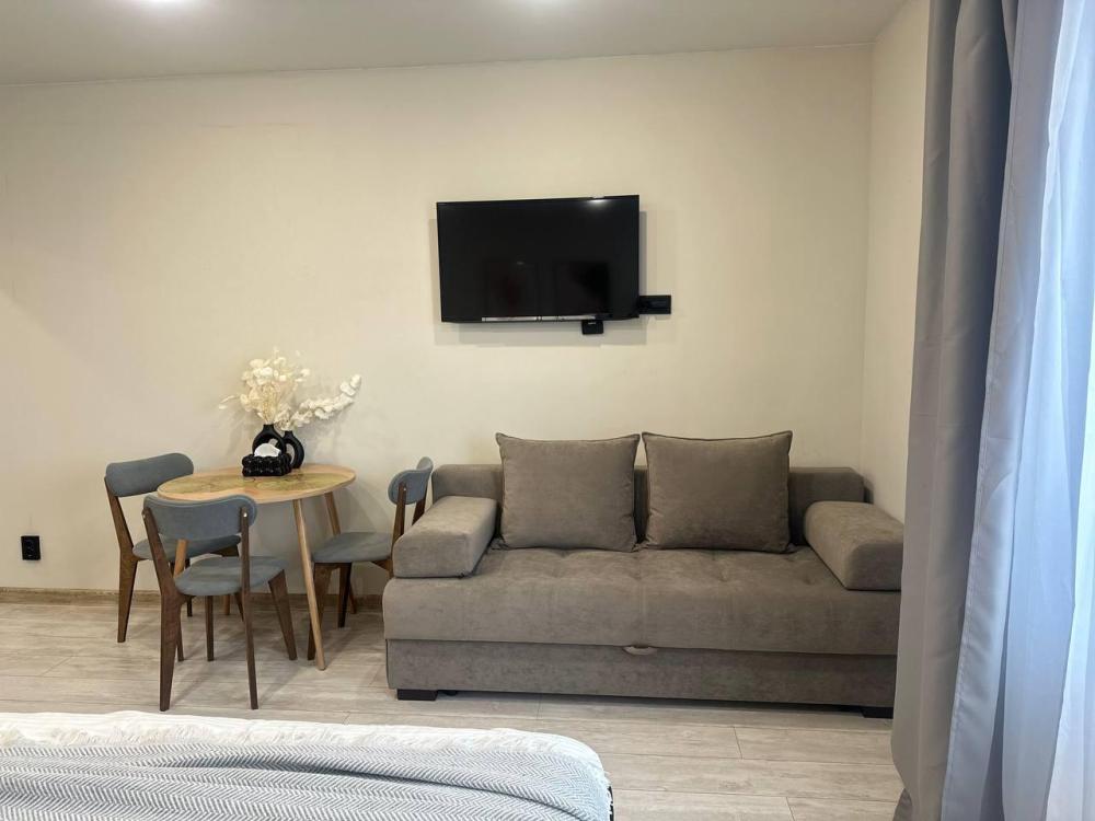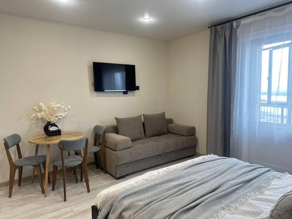 Апартаменты студия для 4 гостей. В квартире белоснежное постельное белье, личные средства гигиены, посуда, техника. В квартире: двуспальная кровать (180х200), раскладной диван - прямой, стиральная машина, фен, утюг, сушилка для одежды, ТВ и высокоскоростной Wi-Fi. Оборудованная кухня (холодильник, варочная панель, микроволновая печь, чайник)