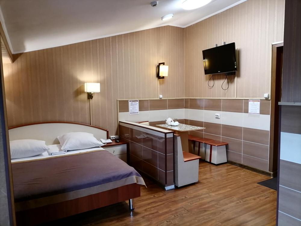Номер категории "комфорт" с одной двуспальной кроватью. Номер со всеми удобствами