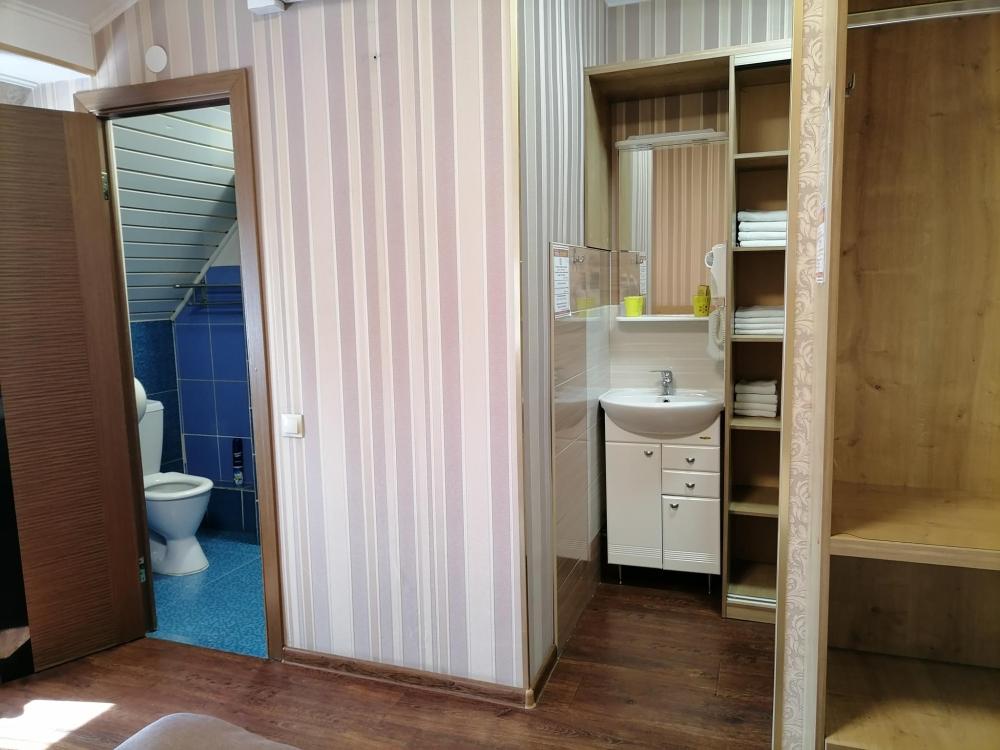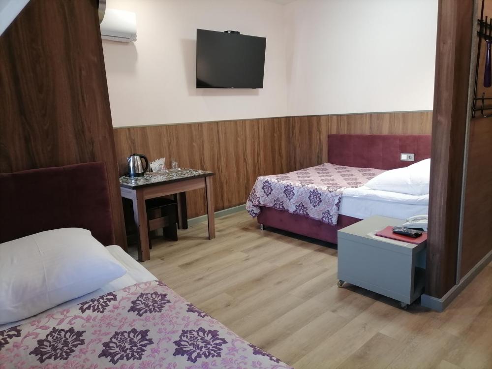 Комфортный номер с одной двуспальной и двумя односпальными кроватями. Номер со всеми удобствами.