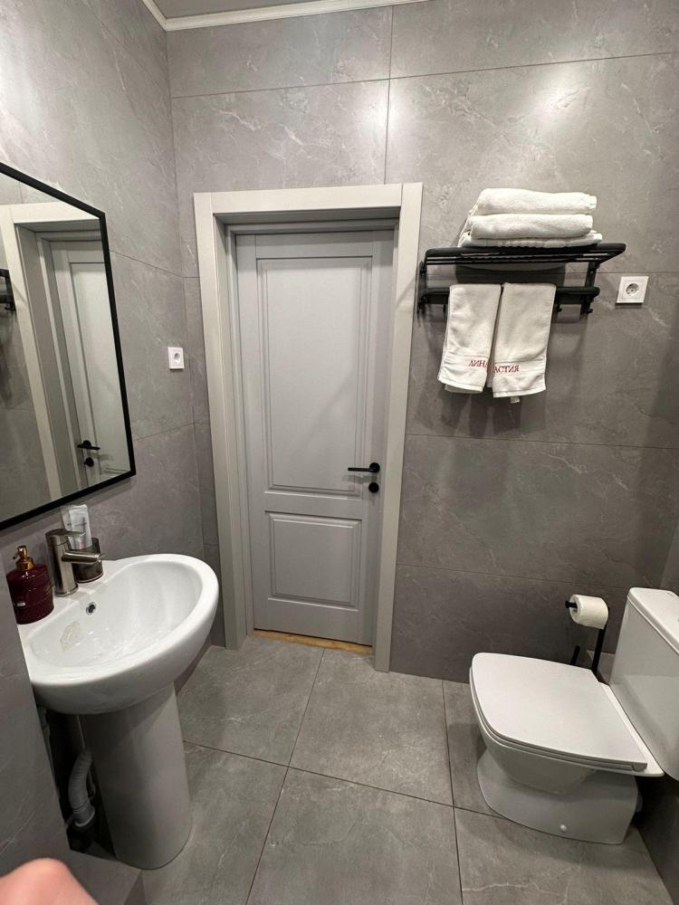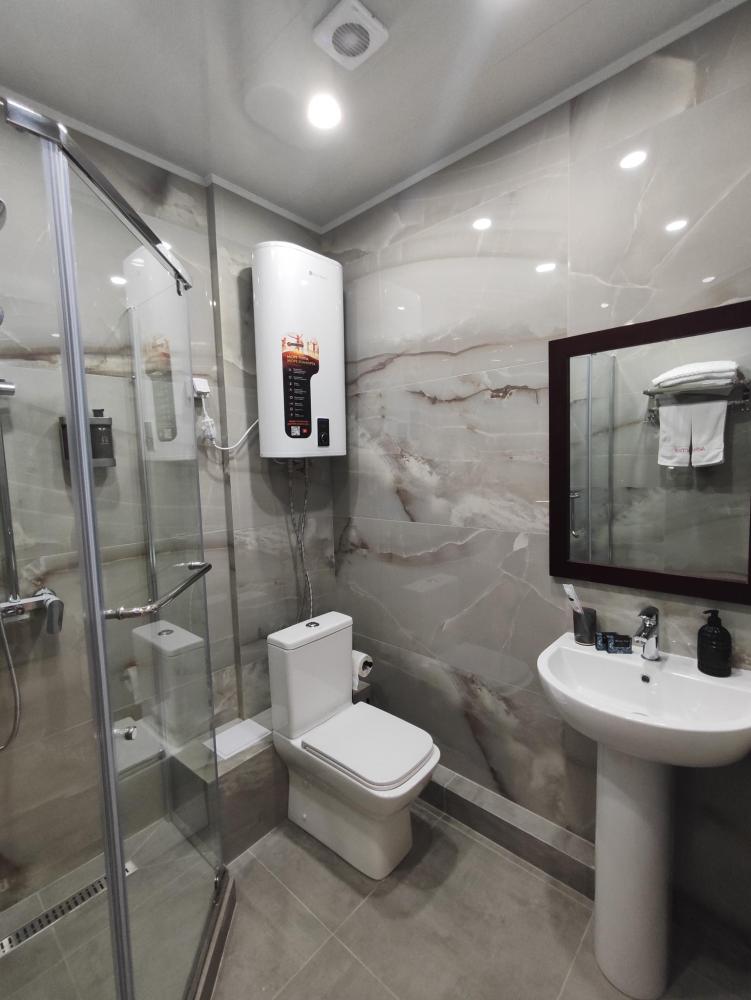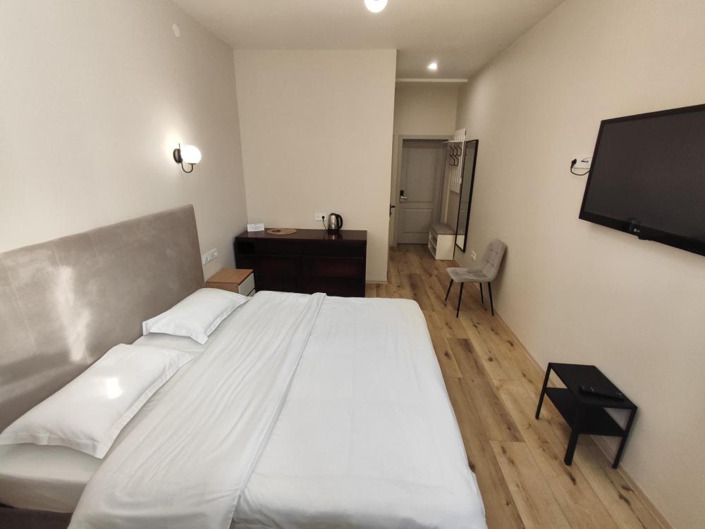 Улучшенный номер с двухспальной кроватью, мини диван, стол, телевизор, санузел, фен, чайник.