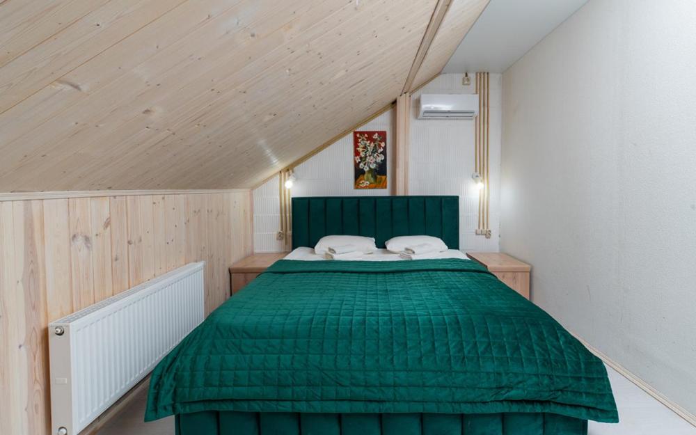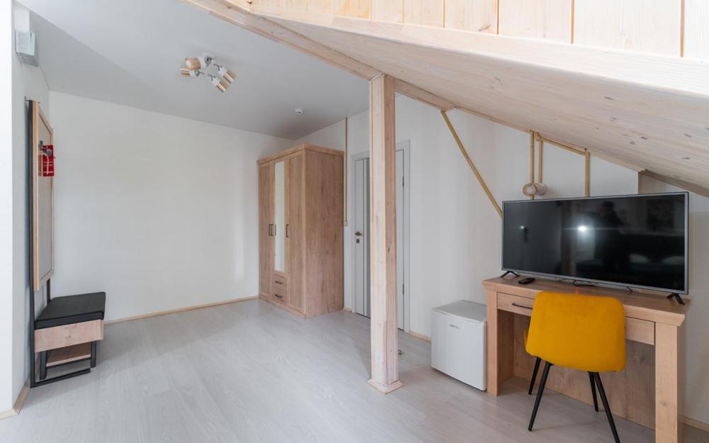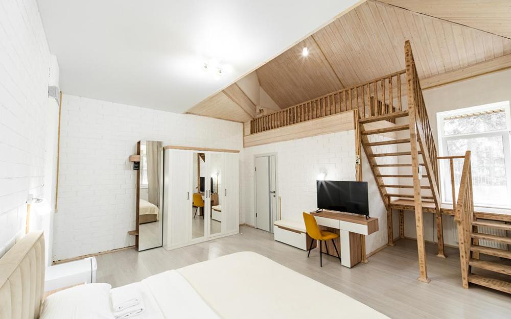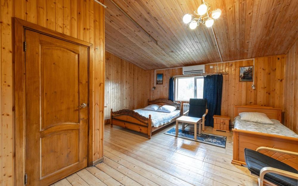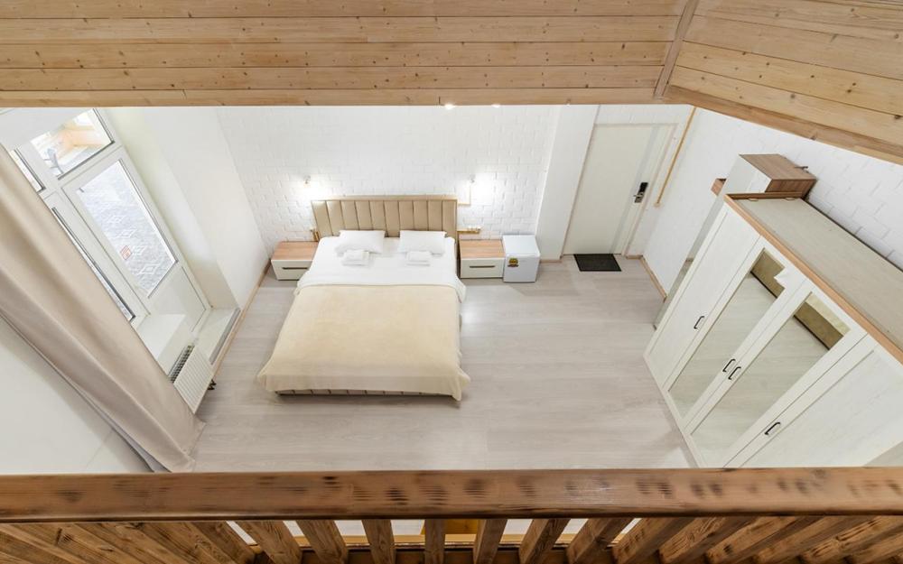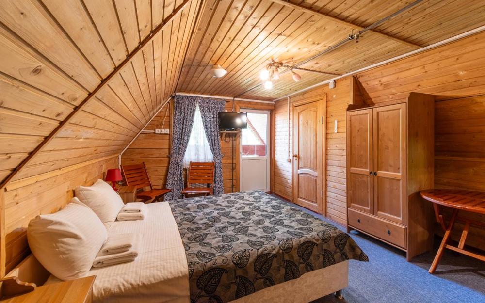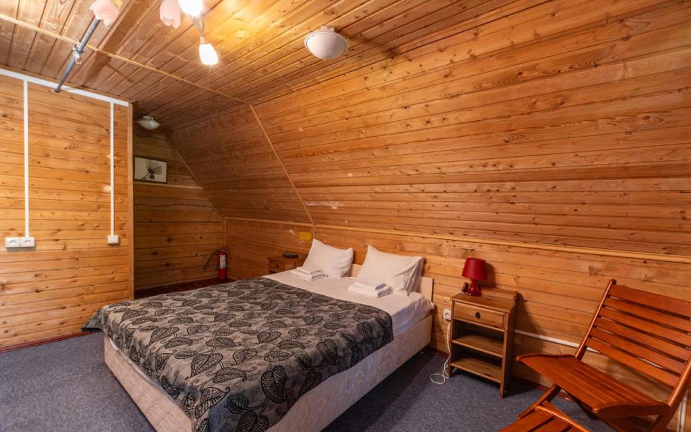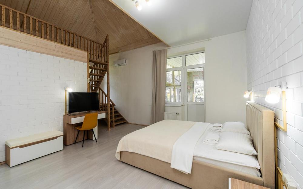 В номере: двуспальная кровать, на втором уровне 2-х спальный ортопедический матрас, ТВ, холодильник, душевая кабина, туалет, фен.
