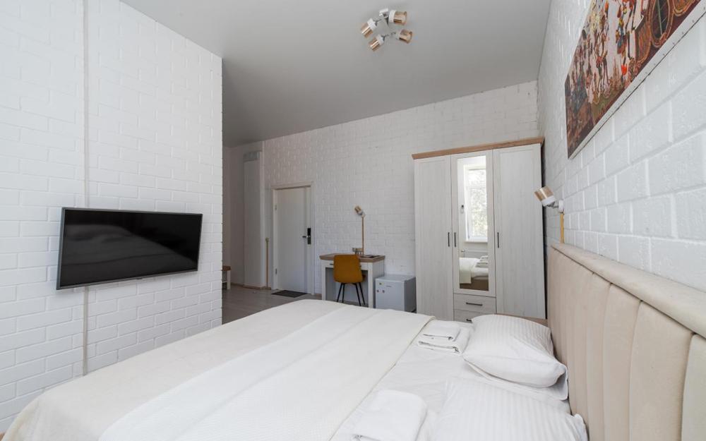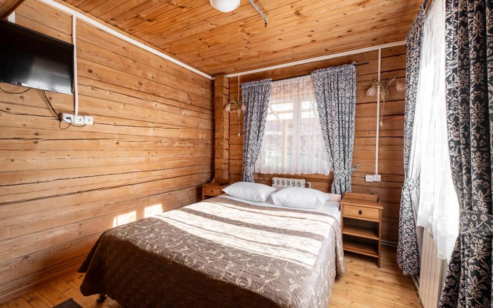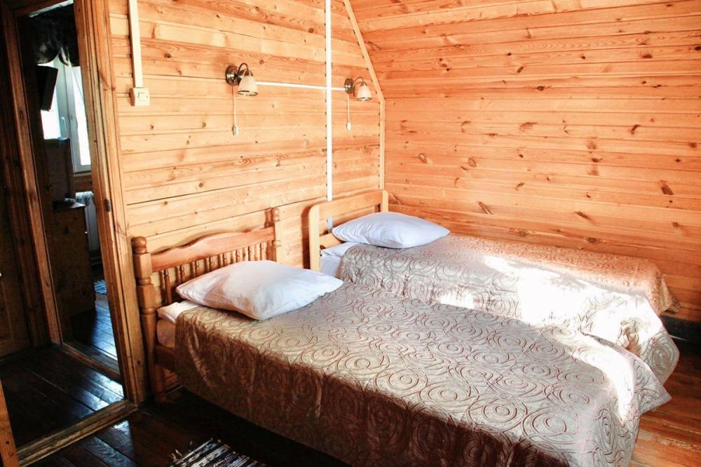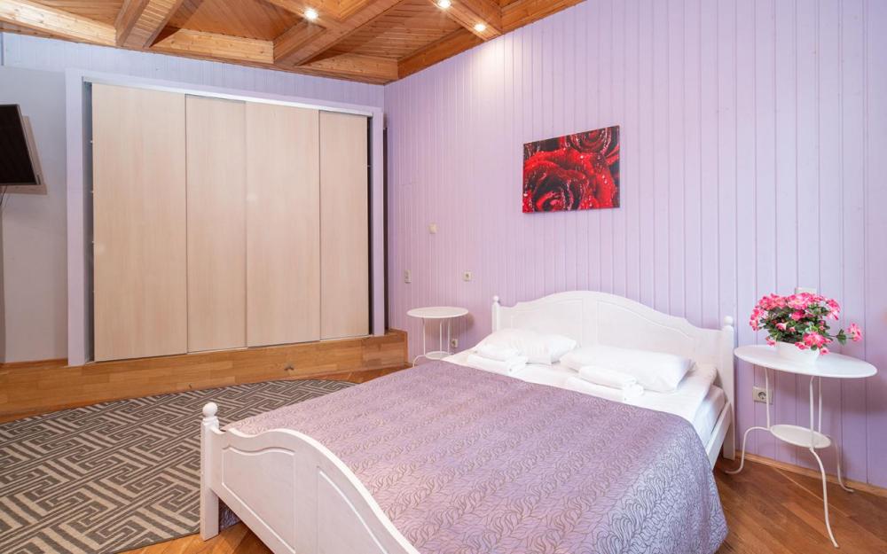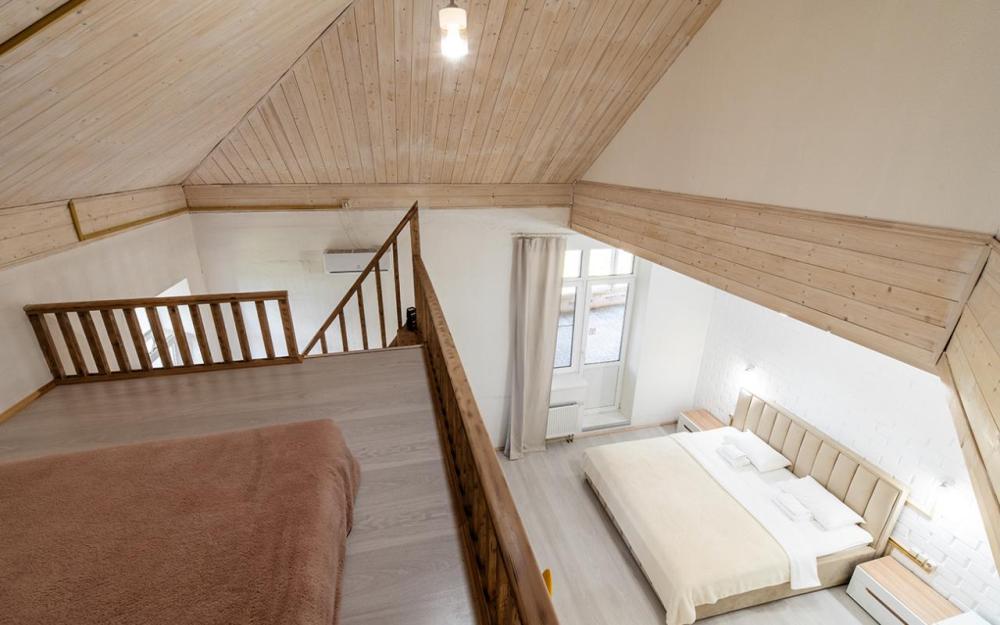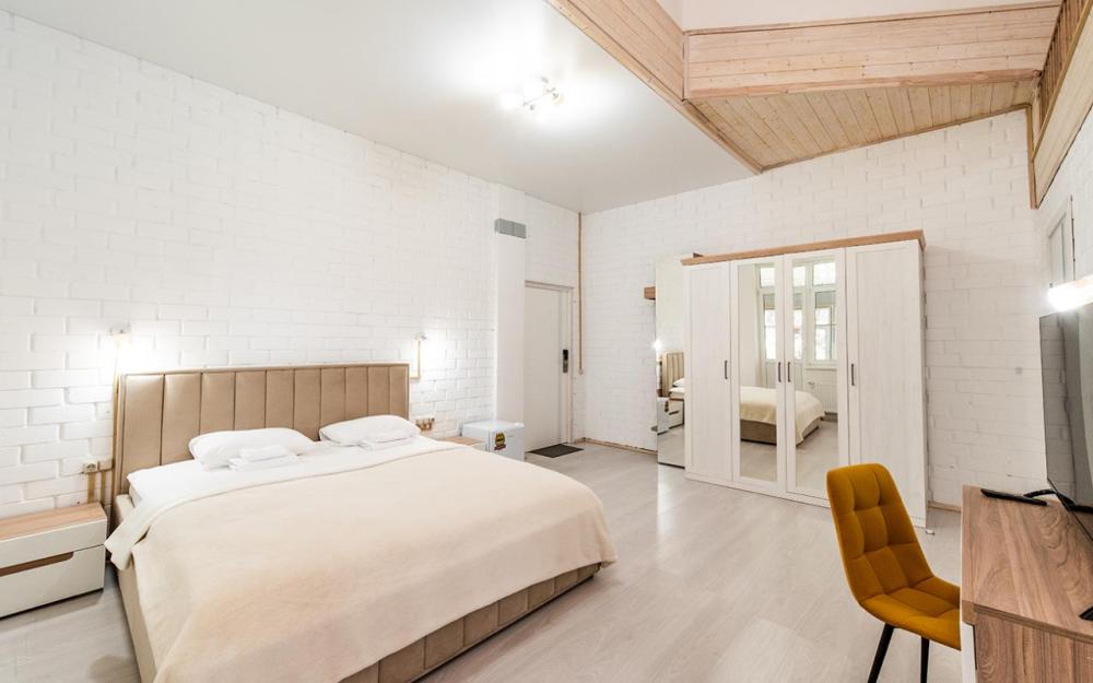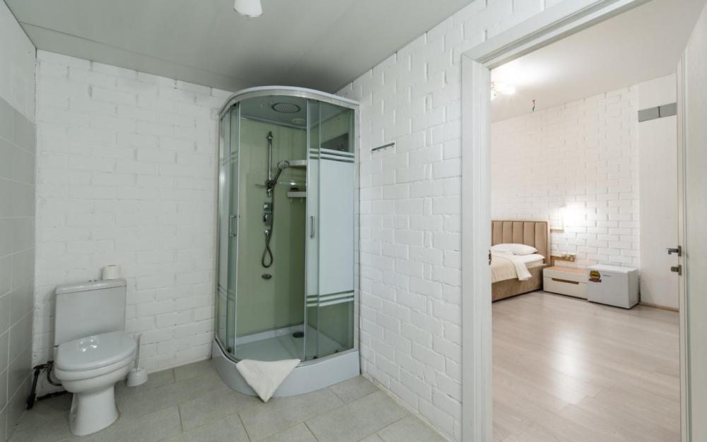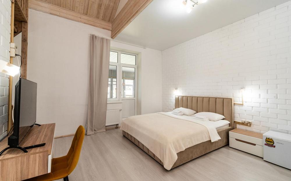 В номере: двуспальная кровать, на втором уровне 2-х спальный ортопедический матрас, ТВ, холодильник, душевая кабина, туалет, фен.