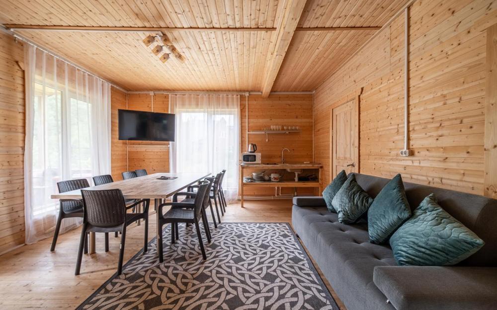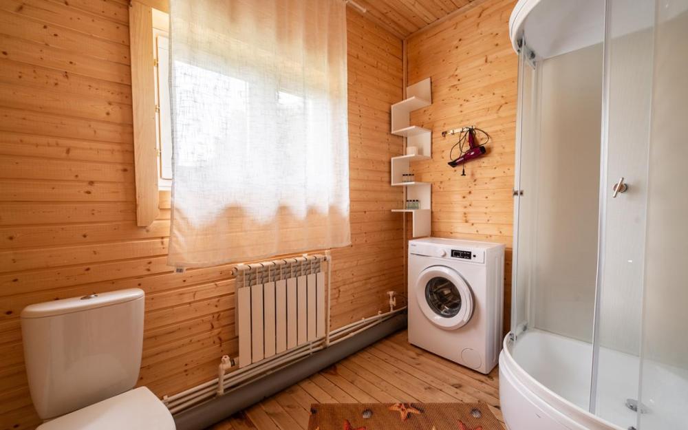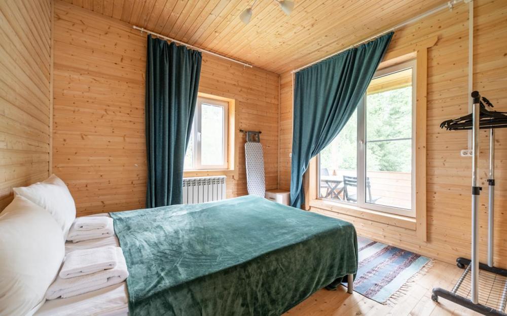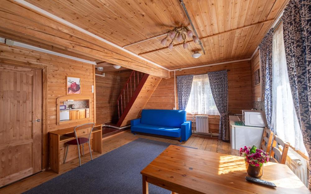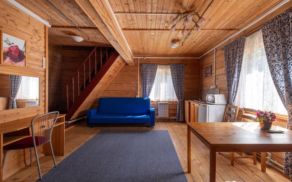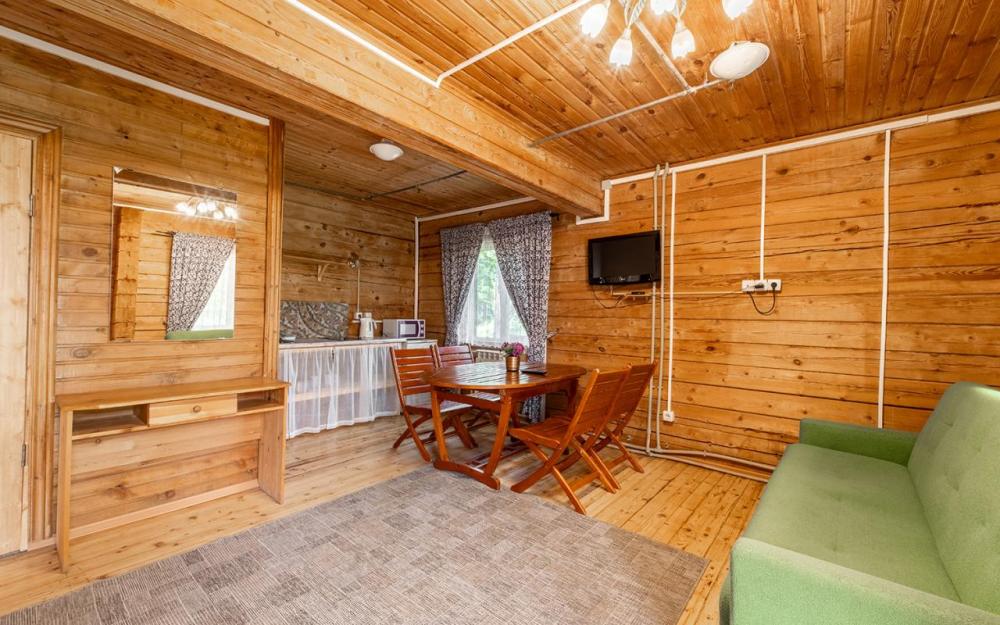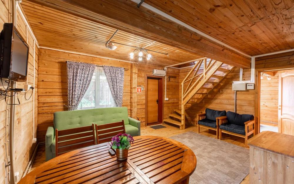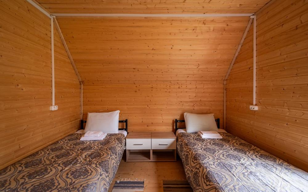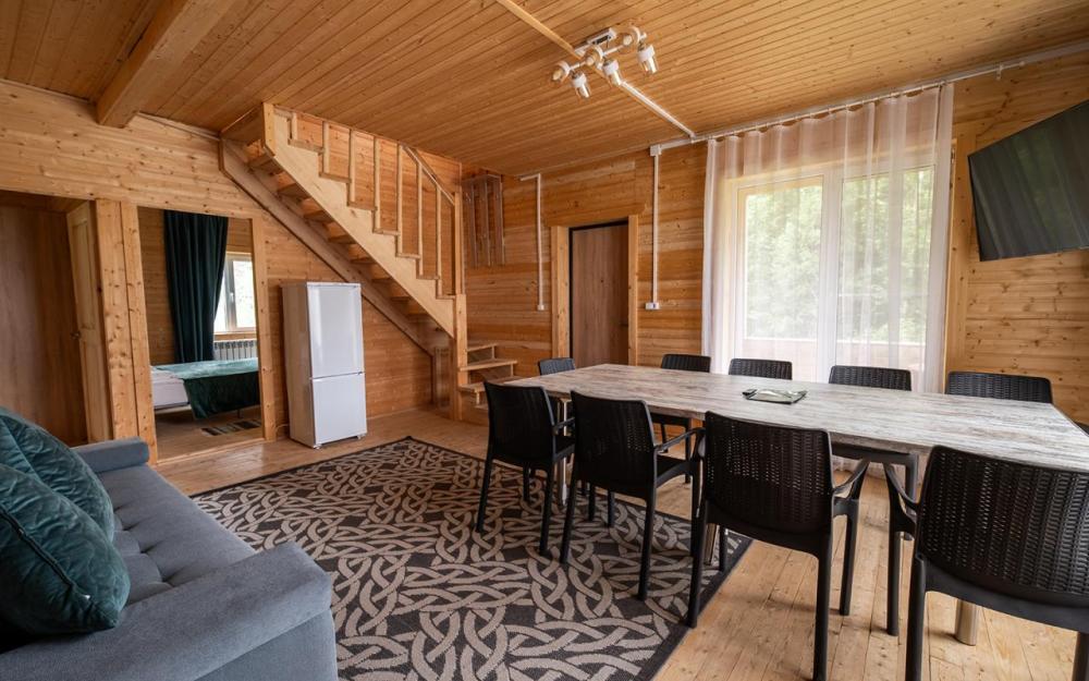 2-х этажный домик, 2 спальни, гостиная с кухонной зоной, 2 санузла, терраса. На 1 этаже в гостиной: раскладной диван, ТВ; в кухонной зоне: холодильник, микроволновая печь, ТВ, стол, набор посуды, электрический чайник; в ванной комнате: душевая кабина, туалет. На 2 этаже в спальне 1: две раздельные кровати, ТВ; в спальне 2: двуспальная кровать. в ванной комнате: туалет, раковина.