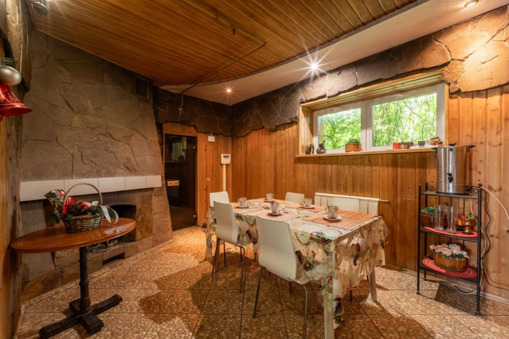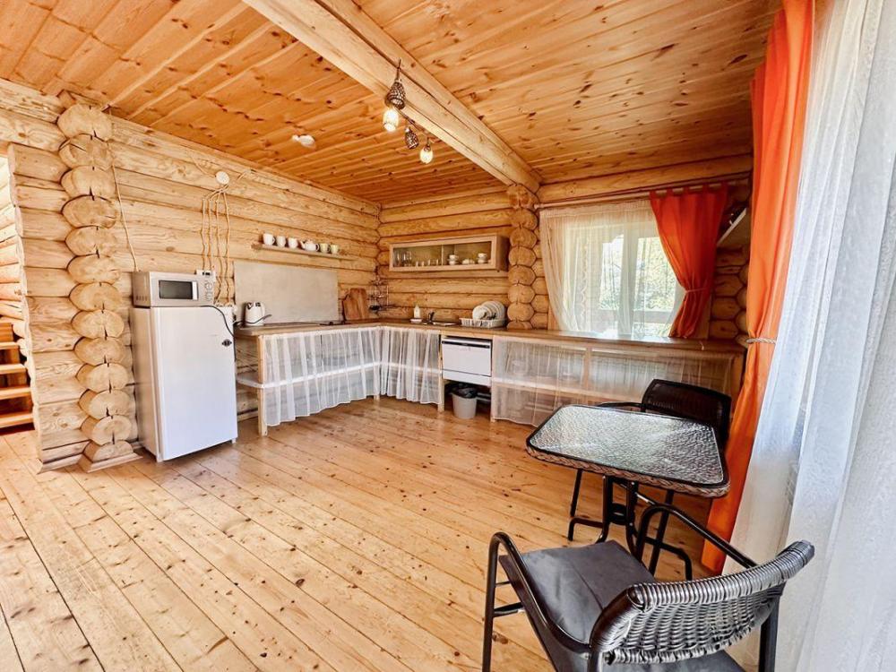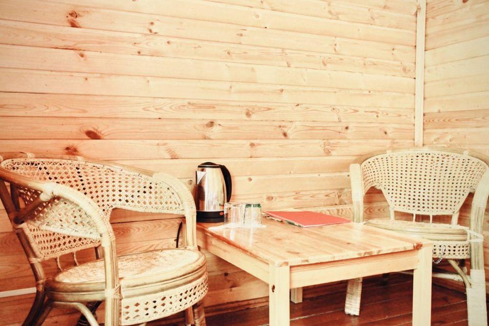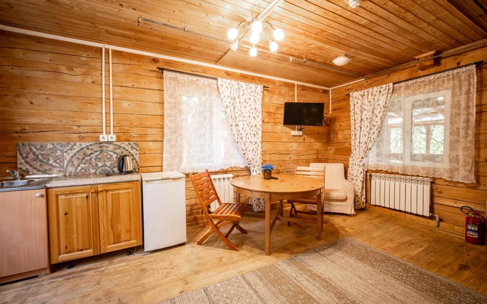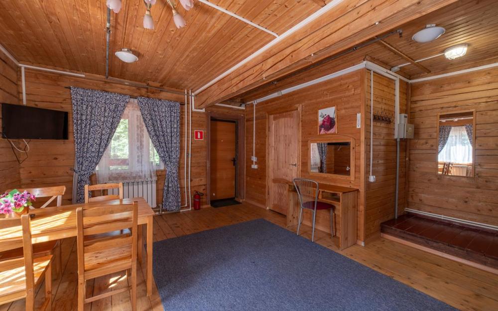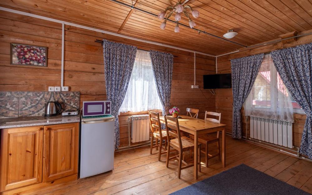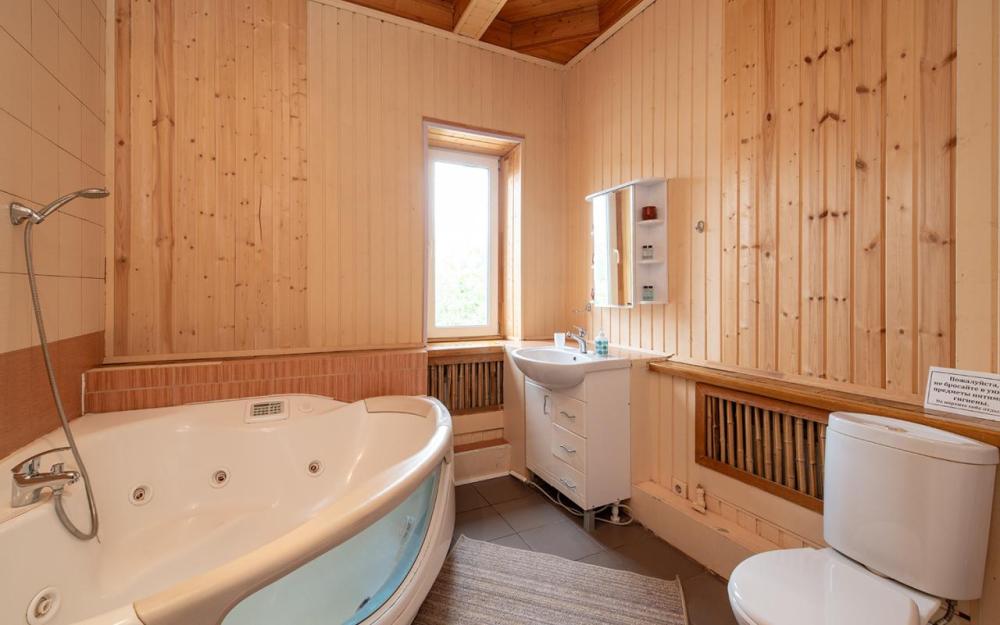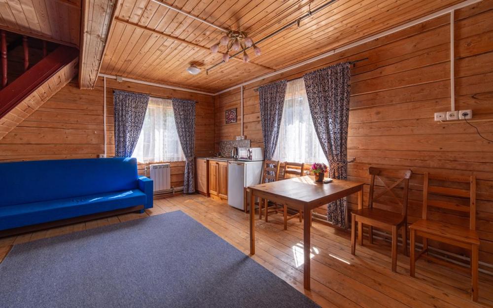 2-х этажный домик, 2 спальни, гостиная с кухонной зоной, 2 санузла, терраса. На 1 этаже в гостиной: раскладной диван, ТВ; в кухонной зоне: холодильник, микроволновая печь, ТВ, стол, набор посуды, электрический чайник; в ванной комнате: душевая кабина, туалет. На 2 этаже в спальне 1: две раздельные кровати, ТВ; в спальне 2: двуспальная кровать. в ванной комнате: туалет, раковина.