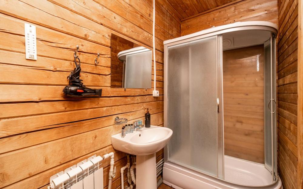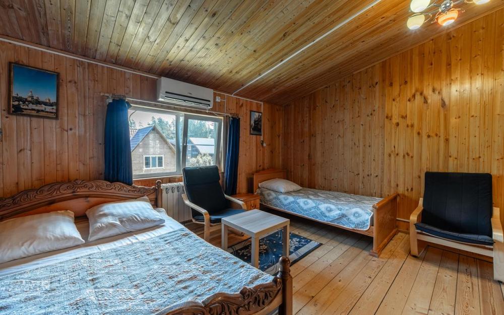 2-х этажный коттедж, 3 спальни, гостиная с кухонной зоной, 2 санузла, терраса, мангал. На 1 этаже в гостиной: раскладной диван, ТВ; в кухонной зоне: кухонный гарнитур, холодильник, микроволновая печь, стол, набор посуды, электрический чайник; в спальне 1: двуспальная кровать, ТВ; в ванной комнате: душевая кабина, туалет. На 2 этаже в спальне 2: две раздельные кровати; в спальне 3: две раздельные кровати; в ванной комнате: туалет, раковина; балкон.