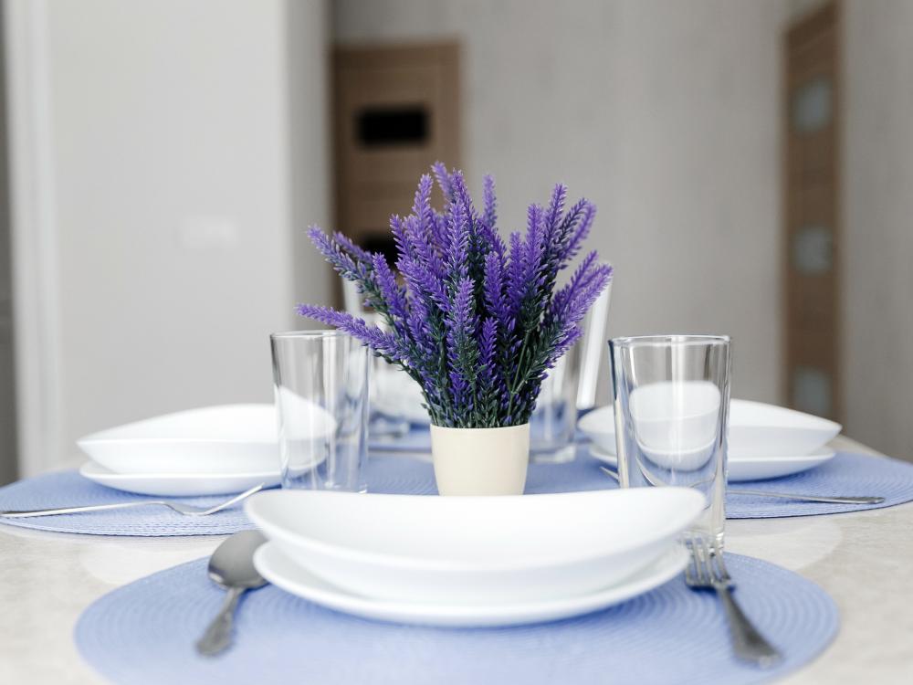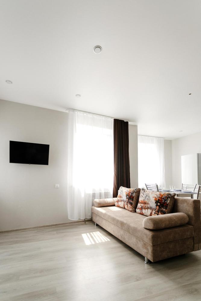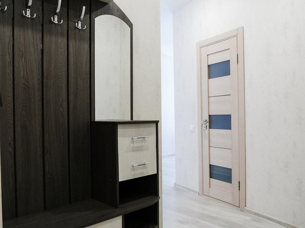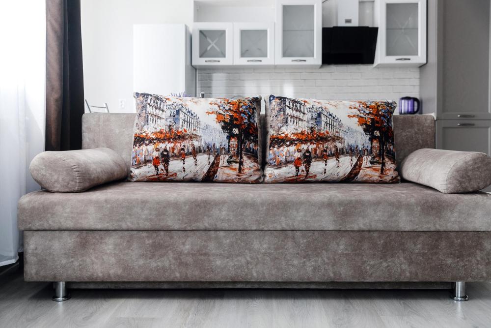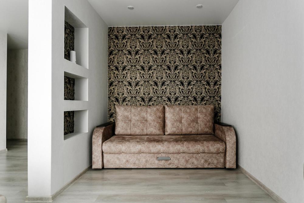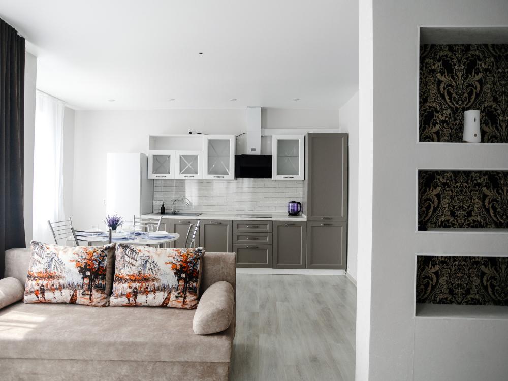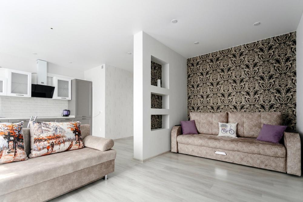 В квартире много спальных мест - двуспальная кровать и два дивана-кровати. Комфортно размещаются 6 человек. Здесь имеется вся необходимая мебель и бытовая техника. Интерьер выполнен в мягких и приятных тонах с добавлением дизайнерского акцента.