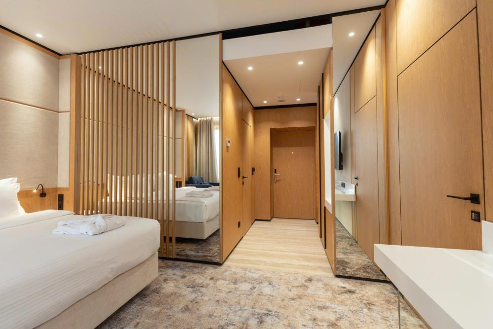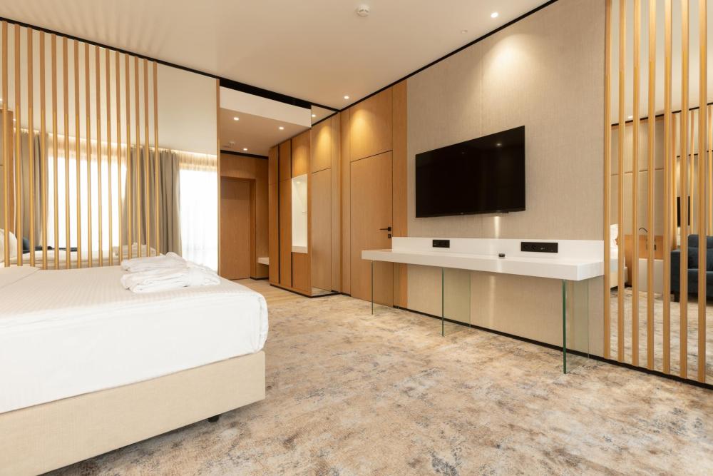 Солнечный, просторный «люкс» наполнит новыми впечатлениями любое, даже самое яркое событие в Вашей жизни. В номере: две комнаты две ванные комнаты (джакузи с душем) фен телефон 3 телевизора кондиционер высокоскоростной WiFi интернет минибар сейф просторная кровать