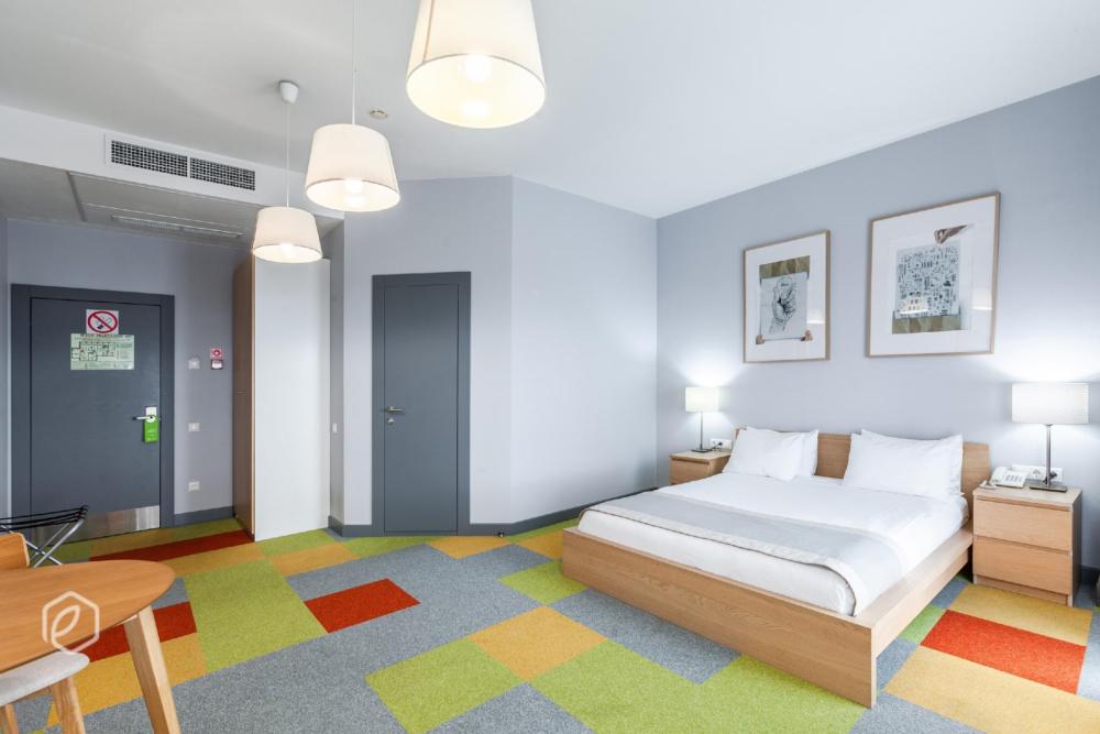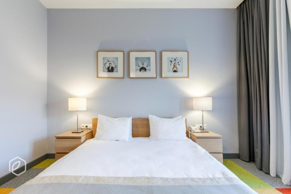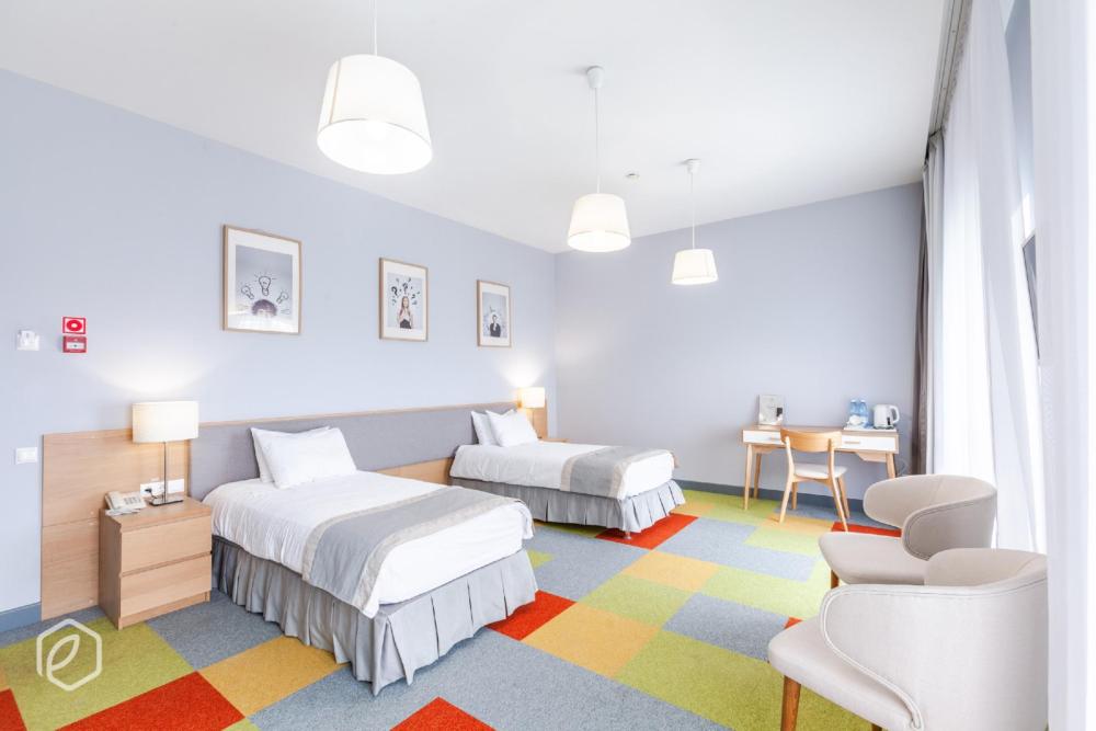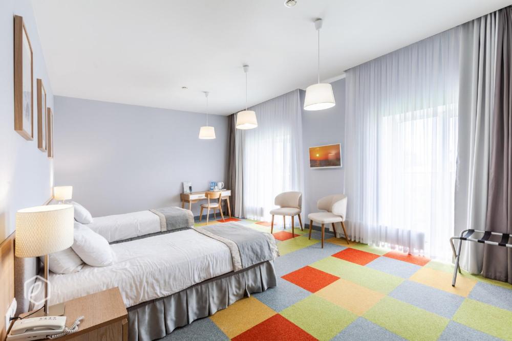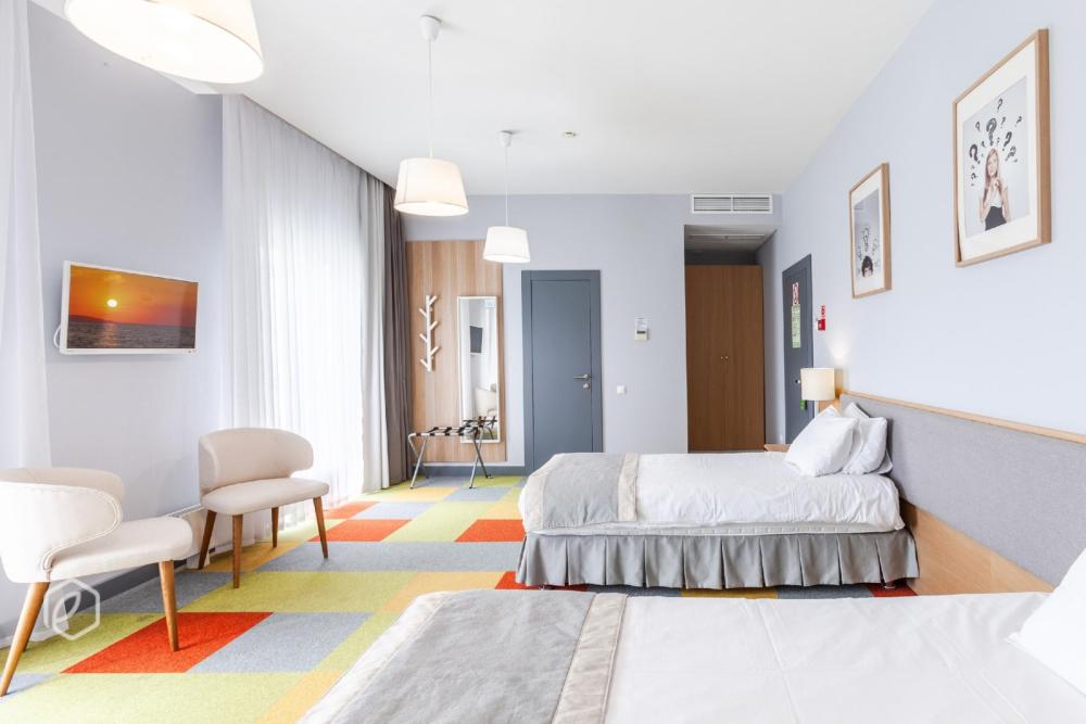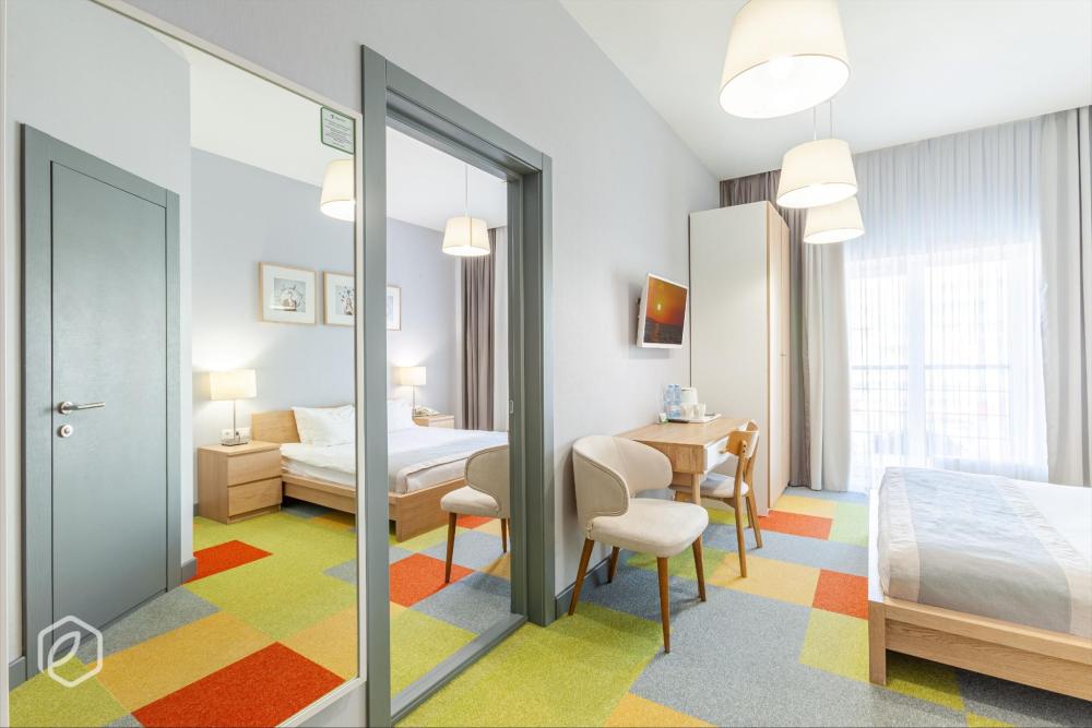 Семейный двухкомнатный четырехместный номер с 2 двуспальными кроватями для комфортного размещение 3-4 гостей*. В номере: сейф, мини-бар, телевидение, кондиционер, фен, бутилированная вода в день заезда, чайный набор, полотенца, махровый халат, одноразовые тапочки, предметы гигиены, беспроводной интернет. В номере 2 ванные комнаты с душевыми кабинами.