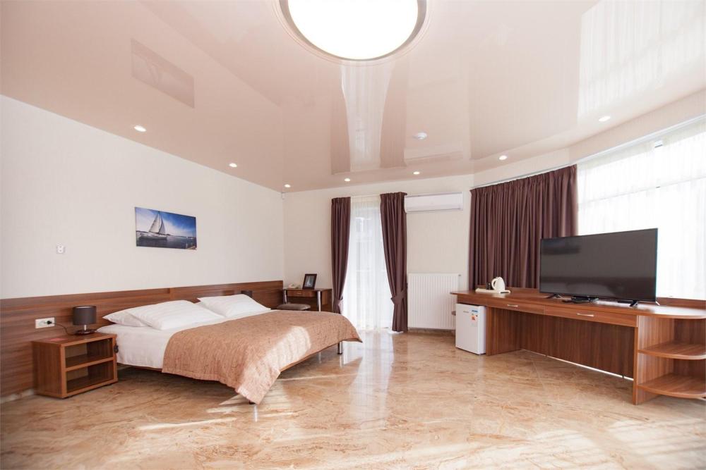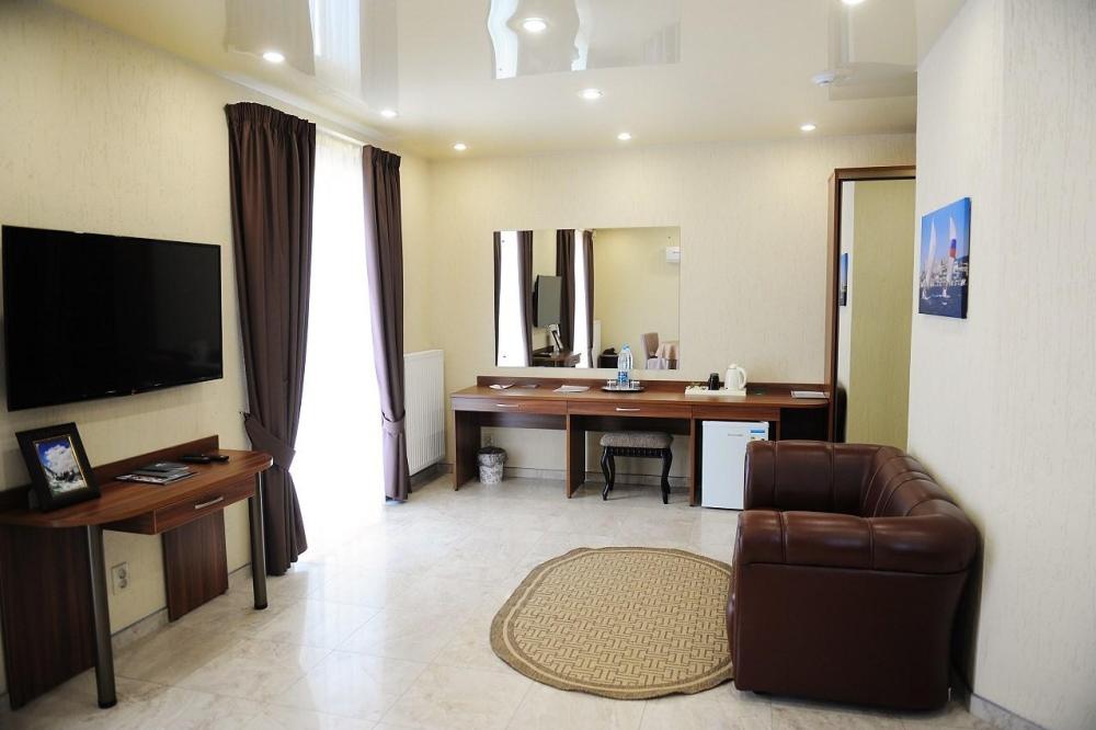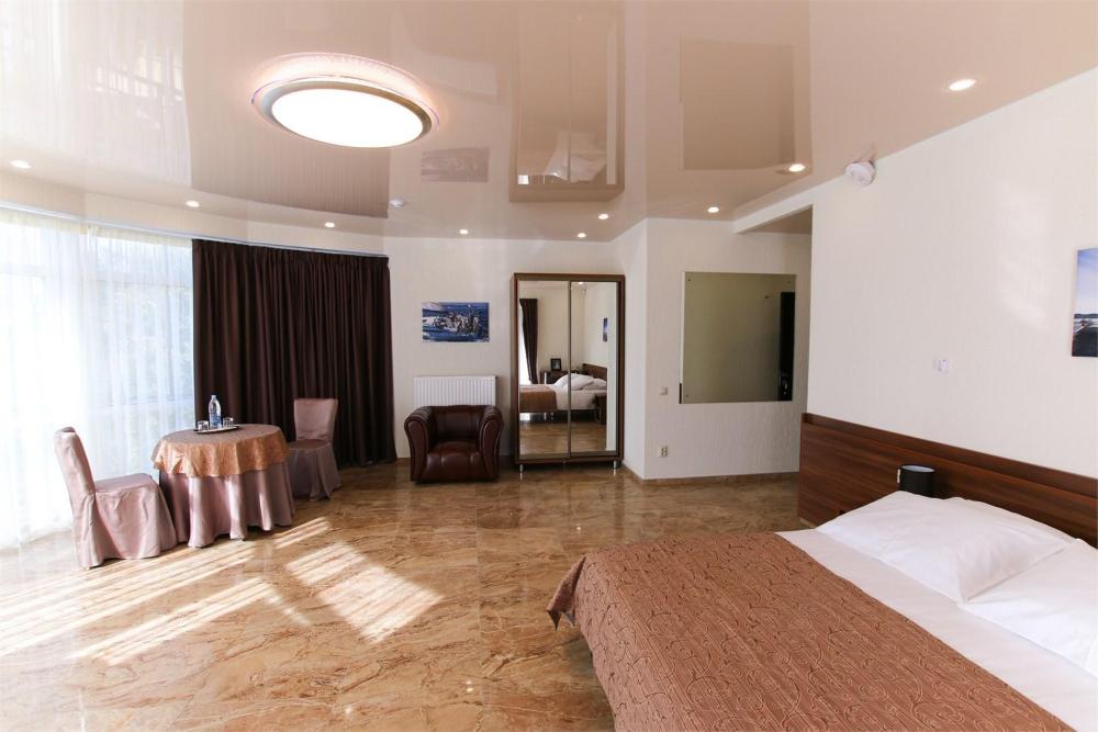 Просторный номер с комфортной зоной отдыха, с большими панорамными окнами. Площадь 35 кв. м.. В номере большая двуспальная кровать, гардероб, телевизор, кресло или диван, сейф, мини-бар, в ванной комнате современная душевая кабинка, халаты, полотенца, тапочки, туалетные принадлежности, беспроводной интернет, электрический чайник, чай, кофе, сливки, минеральная вода.