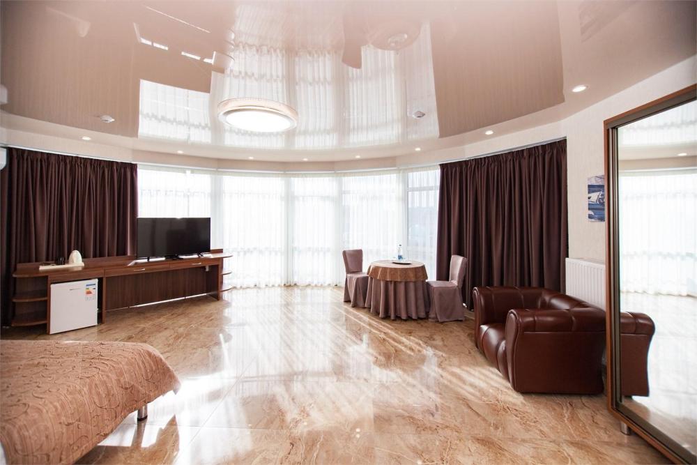 Современный, просторный номер "Люкс" с панорамными окнами подойдет для семейного отдыха с детьми или компании из 3х взрослых гостей. В номере несколько спальных мест: большая двуспальная кровать и раскладной диван. По запросу предоставляется доп место на раскладушке по стоимости 1000 руб. в сутки.