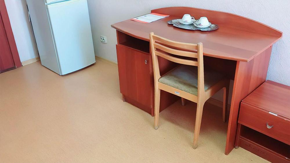 Номер с двумя односпальными кроватями, детской кроваткой, пеленальным столом, также в номере есть холодильник, письменный стол и телевидение. Удобства на этаже.